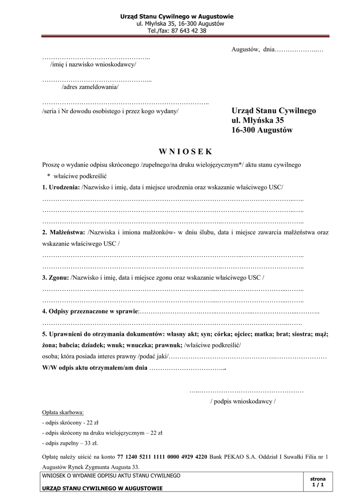 Urząd Stanu Cywilnego w Augustowie ul. Młyńska 35, 16-300 Augustów Tel./fax: 87 643 42 38 Augustów, dnia………………..… ………………………………………….. /imię i nazwisko wnioskodawcy/ …………………………………………... /adres zameldowania/ ………………………………………………………………….. /seria i Nr dowodu osobistego i przez kogo wydany/ Urząd Stanu Cywilnego ul. Młyńska 35 16-300 Augustów WNIOSEK Proszę o wydanie odpisu skróconego /zupełnego/na druku wielojęzycznym*/ aktu stanu cywilnego * właściwe podkreślić 1. Urodzenia: /Nazwisko i imię, data i miejsce urodzenia oraz wskazanie właściwego USC/ ……………………………………………………………………………………………………..….. ……………………………………………………………………………………………………..….. ………………………………………………………………………..……………………………….. 2. Małżeństwa: /Nazwiska i imiona małżonków- w dniu ślubu, data i miejsce zawarcia małżeństwa oraz wskazanie właściwego USC / ………………………………………………………………………………..……………………….. ………………………………………………………………………..……………………………….. 3. Zgonu: /Nazwisko i imię, data i miejsce zgonu oraz wskazanie właściwego USC / ……………………………………………………………………...…………………………...…….. ……………………………………………………………………...…………………………...…….. 4. Odpisy przeznaczone w sprawie:……………………….……..……………..………………...……….. …………………………………………………………………………………………………..……. 5. Uprawnieni do otrzymania dokumentów: własny akt; syn; córka; ojciec; matka; brat; siostra; mąż; żona; babcia; dziadek; wnuk; wnuczka; prawnuk; /właściwe podkreślić/ osoba; która posiada interes prawny /podać jaki/………………………………………….…………………… W/W odpis aktu otrzymałem/am dnia ……………………………... …..………………………………………… / podpis wnioskodawcy / Opłata skarbowa: - odpis skrócony - 22 zł - odpis skrócony na druku wielojęzycznym – 22 zł - odpis zupełny – 33 zł. Opłatę należy uiścić na konto 77 1240 5211 1111 0000 4929 4220 Bank PEKAO S.A. Oddział I Suwałki Filia nr 1 Augustów Rynek Zygmunta Augusta 33. WNIOSEK O WYDANIE ODPISU AKTU STANU CYWILNEGO URZĄD STANU CYWILNEGO W AUGUSTOWIE strona 1/1