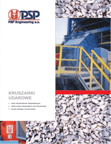 KRUSZARKI UDAROWE duĪa niezawodnoĞü eksploatacyjna niskie koszty eksploatacji oraz konserwacji prosta obsáuga i konserwacja Kruszarki udarowe KRUSZENIE Obecnie PSP Engineering produkuje kruszarki udarowe jak z poziomym, tak z pionowym waáem rotoru wyprodukowanych z nowoczesnych materiaáów odpornych na zuĪycie. PSP Engineering dostarcza kruszarki udarowe w najbardziej nowoczesnym wykonaniu, które są wykorzystywane w pierwotnych i wtórnych stopniach kruszenia i przy recyklacji materiaáów budowlannych. Kruszarki te są idealne do jednostopniowego przygotowania materiaáu w przemyĞle cementowym. Materiaá rozdziela siĊ za pomocą rotujących listw i odbiciem od pewnych desek. Kruszarki udarowe produkowane są w seriach typorozmiarów o zdolnoĞci do kilku ton po wiĊcej niĪ 1800 t/h ,przez co jest zapewniona moĪliwoĞü wyboru kruszarki wedágu wstĊpnej ziarnistoĞci opracowywanego materiaáu. MiĊdzy wspaniaáe wáaĞciwoĞci eksploatacyjne kruszarek udarowych naleĪą: wysoka niezawodnoĞü eksploatacyjna niskie koszty eksploatacji i konserwacji hydrauliczne otwieranie szafy kruszarki do áatwej wymiany urządzeĔ roboczych i dostrajania wykorzystanie listw kruszeniowych - aĪ 40% z caákowej masy- obniĪenie kosztów eksploatacyjnych szybka wymiana listw dziĊki prostemu systemowi zaciskowemu áatwa obsáuga i konserwacja zdolnoĞü kruszarki wraz z zuĪyciem listw nie zmienia siĊ uĪycie wysoko przeciwĞcierających materiaáów w gáównych elementach kruszeniowych wysoka zdolnoĞü (moc) wielki stopieĔ rozdrobnienia wyĪszy niĪ przy innych typach kruszarek wspaniaáy indeks ksztaátowania (bi3 < 20%) Pierwotne i wtórne kruszarki udarowe ODN Kruszarka udarowa ODN 1175 - kruszenie surowca cementowego. Kruszarki udarowe ODN wykorzystywane są do pierwotnego kruszenia Ğrednio twardych materiaáów, jakim jest n.p. wapieĔ z zdolnoĞcią odbijania wiĊkszy niĪ 30%. DziĊki wariabilnoĞci rozwiązania konstrukcyjnego i uĪycia w drugim stopniu linii wykaĔczania kruszarki ODN sprzyjają takĪe pierwotnemu kruszeniu, jednostopniowe kruszenie wapnia w cementowniach, gdzie dla mielenia surowca uĪywane są máyny wertykalne. Ze wzglĊdu na wielkoĞü wstĊpnej sztuki (aĪ 1,5 m3) jest kruszarka wyposaĪona w trzecią dodatkową deską kruszeniową, która znajduje siĊ pod rotorem. Dodatkowa deska kruszeniowa kalibruje wyjĞciową wielkoĞü produktu. Gáówne parametry techniczne kruszarek udarowych pierwszego stopnia kruszenia ODN typ rozmiar otworu wlotowego maks. objĊtoĞü bryáy wlotowej maks. rozmiar bryáy wlotowej wydajnoĞü silnik el. mm m3 mm t/h kW 1174 800x1544 0,2 1200 260 - 300 315 - 400 1166 1270x1690 0,75 1500 350 - 550 320 - 630 1175 1500x2399 1 2000 550 - 1000 630 - 1250 1167 1500x3025 1 2000 900 - 1400 1000 - 1750 1168 2000x2699 1,5 2300 1000 - 1800 1250 - 2250 Gáówne parametry techniczne kruszarek udarowych drugiego stopnia kruszenia ODN rozmiar otworu wlotowego maks. rozmiar sztuki wlotowej mm mm 1181 600x700 300 60 90 45 - 75 1171 500x1044 300 90 130 75 - 110 1172 625x1044 400 150 220 130 - 200 1182 625x1344 400 200 380 160 - 250 typ Semimobilna jednostka z kruszarką udarową ODN 1171. wydajnoĞü t/h silnik el. t/h kW Podane wydajnoĞci są mają charakter informacyjny i są zaleĪne od wáaĞciwoĞci i skáadu kruszonego materiaáu oraz sposobu podawania. Kruszarki udarowe KRUSZENIE Gáówne rozmiary kruszarek ODN typ A B C D mm mm mm mm 1181 2000 1635 2220 930 1171 1950 1926 2320 1224 1172 2265 2060 2600 1244 1182 2265 2306 2600 1544 1174 3200 2890 3500 1810 1166 3810 3570 3975 2056 1175 4364 4755 4900 2656 1167 4364 4755 4900 3456 1168 5790 5605 5970 3052 Kruszarka udarowa ODN 1175 - kruszenie surowca cementowego odsiew [%] odsiew [%] Przekrój kruszarki pierwszego stopnia ODN Granulometryczny skáad produktu Kruszarki udarowe pierwszego stopnia Kruszarki udarowe drugiego stopnia otwór sita kwadratowego [mm] otwór sita kwadratowego [mm] Pole pomiĊdzy krzywymi charakteryzuje zdolnoĞü kruszenia maszyn w zaleĪnoĞci od wielkoĞci wlotowej oraz rodzaju kruszonego materiaáu. Kruszarki udarowe KRUSZENIE Wtórne kruszarki udarowe ODX Kruszarki udarowe ODX wykorzystywane do wtórnego kruszenia twardych materiaáów jakimi Īwir, piasek, fonolit, morawska droba, bazalt i granit. Tercjalne kruszarki udarowe ODX-J/ODJ Tercjalne kruszarki udarowe ODX-J lub rewersyjne kruszarki udarowe ODJ wykorzystywane są do koĔcowych stopni kruszenia twardych materiaáów jakimi są Īwir, piasek, fonolit, morawska droba, bazalt i granit, gdzie jest wymagana wyĪsza drobnistoĞü koĔcowego produktu. Materiaá jest kruszony za pomocą listw rotujących i odbiciem od pewnych desek i od dalszej deski kruszeniowej znajdującej siĊ pod rotorem. Kruszarki rewersyjne ODJ są wyposaĪone w pionowe wejĞcie materiaáu wprost do rotora i obustronną deską odbijającą, która siĊga pod rotor. Wygodą tego wykonania jest, Īe indeks ksztaátowy jest bardzo dobry (bi3 < 20%) i stopieĔ zdrobnienia w jednolitych stopniach kruszeniowych jest wysoki. KoĔcowy produkt, który powstaá przez destrukcjĊ wzdáuĪ swych naturalnych poziomów szczepieniowych, zawiera minimum pĊkniĊü bez resztowego napiĊcia. Gáówne parametry techniczne kruszarek udarowych ODX Kruszarka udarowa ODX 1162 typ rozmiar otworu wlotowego maks. rozmiar wydajnoĞü silnik el. bryáy wlotowej mm mm t/h kW mm mm mm 1160 400x740 150 30 - 50 45 - 90 1845 1877 2320 1161 400x1090 200 50 - 90 75 - 132 1845 2227 2320 1162 600x1090 300 90 - 130 130 - 200 2308 2305 2695 1163 600x1390 300 130 - 180 160 - 250 2308 2605 2695 wysokoĞü szerokoĞü dáugoĞü kruszarki kruszarki kruszarki ZiarnistoĞü koĔcowa produktu: 0 - 25 mm: 85% 0 - 40 mm: 99% Gáówne parametry techniczne kruszarek udarowych ODX-J typ rozmiar otworu wlotowego maks. rozmiar wydajnoĞü silnik el. bryáy wlotowej mm Przekrój kruszarki udarowej ODX mm t/h kW wysokoĞü szerokoĞü dáugoĞü kruszarki kruszarki kruszarki mm mm mm 1160