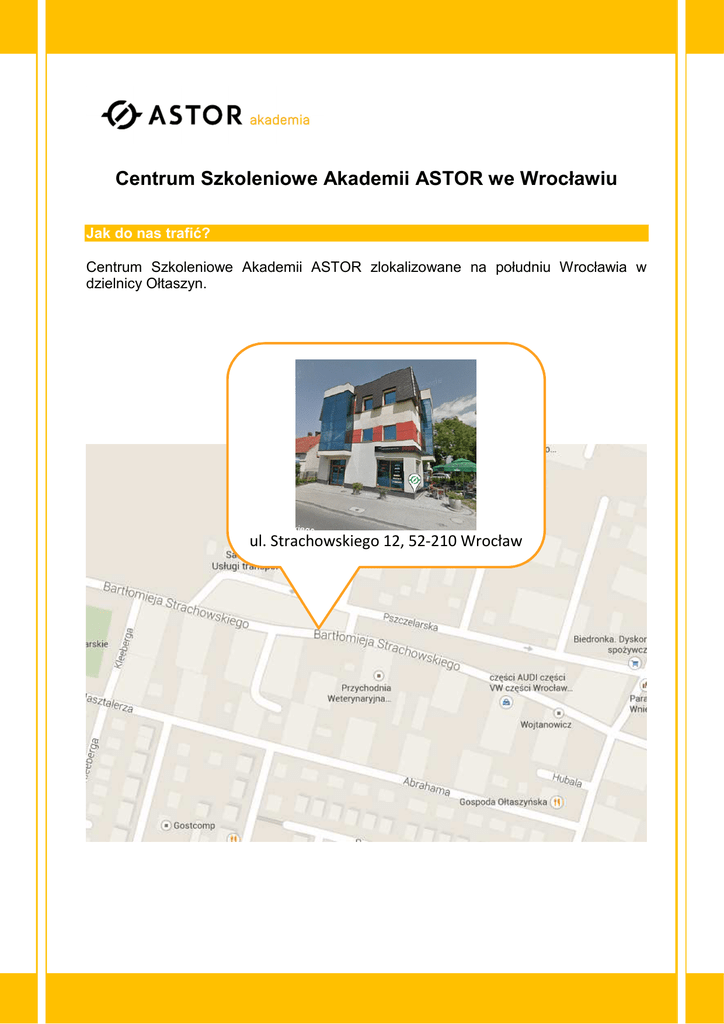 Centrum Szkoleniowe Akademii ASTOR we Wrocławiu Jak do nas trafić? Centrum Szkoleniowe Akademii ASTOR zlokalizowane na południu Wrocławia w dzielnicy Ołtaszyn. ul. Strachowskiego 12, 52-210 Wrocław Polecane hotele Hotel Podkowa Wrocław, ul. Wojszycka 8 tel: (+48 71) 790-01-11 fax: (+48 71) 339-83-60 E-mail: [email protected] Strona: www.hotelpodkowa.pl - Parking - bezpłatny - Internet bezprzewodowy dostępny na terenie całego hotelu – bezpłatnie. CENY NOCLEGÓW (ze śniadaniem): - Pokój 1-osobowy z łazienką, TV, telefon – od 180 zł - Pokój 2-osobowy z łazienką, TV, telefon – od 200 zł Novotel Wrocław*** Hotel Bacero*** Wrocław, ul. Ołtaszyńska 107 tel. +48 71 339 75 50 tel. +48 71 793 26 45 tel. +48 71 793 26 46 E-mail: [email protected] Strona www: www.hotelbacero.com.pl - Parking – dodatkowo płatny 25 zł - Internet bezprzewodowy dostępny na terenie całego hotelu – bezpłatnie. CENY NOCLEGÓW (ze śniadaniem): - Pokój 1 osobowy – od 255 zł - Pokój 2 osobowy – od 280 zł Platinum Palace ***** Wrocław, ul. Wyścigowa 35 tel. +48 71 339 80 51 fax +48 71 339 80 75 email: [email protected] Wrocław, ul. Powstańców Śląskich 204 tel. +48 71 324 99 00 fax +48 71 324 99 10 email: [email protected] - Parking – dodatkowo płatny 25 zł - Internet bezprzewodowy dostępny na terenie całego hotelu - bezpłatnie. - Parking – dodatkowo płatny 40 zł - Internet bezprzewodowy dostępny na terenie całego hotelu – bezpłatnie. CENY NOCLEGÓW (w zależności od terminu rezerwacji) - Pokój 1-osobowy – od 240 zł - Pokój 2-osobowy – od 281 zł CENY NOCLEGÓW: - Pokój 1-osobowy – od 269 zł - Pokój 2-osobowy – od 319 zł Hotel Bielany *** Campanile Wroclaw Centrum*** Bielany Wrocławskie, ul. Klecińska 3 tel. +48 71 311 27 94 tel. +48 71 335 29 00 fax:+48-71 335 29 01 email: [email protected] Wrocław, ul. Ślężna 26 tel. +48 71 326 78 00 fax +48 71 326 78 01 email: [email protected] - Parking - bezpłatny - Internet bezprzewodowy dostępny na terenie całego hotelu – bezpłatnie. - Parking – dodatkowo płatny - Internet bezprzewodowy dostępny na terenie całego hotelu - bezpłatnie. CENY NOCLEGÓW (ze śniadaniem) - Pokój 1-osobowy – od 200 zł - Pokój 2-osobowy – od 230 zł CENY NOCLEGÓW: - Pokój 1-osobowy – od 199 zł - Pokój 2-osobowy – od 199 zł