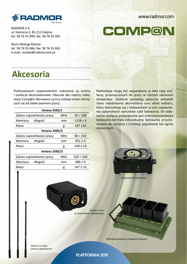 www.radmor.com RADMOR S.A. ul. Hutnicza 3, 81-212 Gdynia tel. 58 76 55 999, fax: 58 76 55 992 Biuro Obsługi Klienta: tel. 58 76 55 666, fax: 58 76 55 662 e-mail: [email protected] Akcesoria Podstawowym wyposażeniem radiostacji są anteny i zasilacze akumulatorowe. Obecnie dla rodziny radiostacji Comp@n oferowane są trzy rodzaje anten różniących się od siebie pasmem pracy. Antena 3585/1 Zakres częstotliwości pracy MHz Wymiary: długość mm Masa g Antena 3585/2 Zakres częstotliwości pracy MHz Wymiary: długość mm Masa g 20 ÷ 108 1128 ± 4 187 ±10 Radiostacje mogą być wyposażone w dwa typy zasilaczy, przeznaczonych do pracy w różnych zakresach temperatur. Zasilacze posiadają optyczny wskaźnik stanu naładowania akumulatora oraz układ nadzoru, który komunikuje się z ładowarkami w celu zapewnienia optymalnych warunków cykli ładowania. Do ładowania zasilaczy przeznaczona jest czterostanowiskowa ładowarka lub mała indywidualna ładowarka przystosowana do zasilania z instalacji pojazdowej lub ogniw słonecznych. 90 ÷ 250 831 ± 4 149 ± 10 Antena 3585/3 Zakres częstotliwości pracy Wymiary: długość Masa MHz mm g 220 ÷ 520 486 ± 4 147 ± 10 Indywidualna ładowarka Zasilacz Li-Ion ze wskaźnikiem naładowania Wielostanowiskowe urządzenie ładujące Anteny na różne pasma częstotliwości PLATFORMA SDR FillGun Programator FillGun przeznaczony jest do przenoszenia nastaw konfiguracyjnych radiostacji oraz pozwala na przeprowadzanie upgrade’u jej oprogramowania. Posiada dwa złącza zewnętrzne. Pierwsze z nich pozwala na podłączenie do jednego z dwóch gniazd radiostacji (TCA lub TCB). Drugie z nich to standardowy wtyk USB umożliwiający podłączenie programatora do komputera PC, na którym zainstalowano oprogramowanie konfiguracyjne radiostacji. Programator posiada wbudowane mechanizmy bezpieczeństwa – dostęp do urządzenia zarówno ze strony radiostacji jak i komputera oparty jest o uwierzytelnianie, a przenoszone dane są zabezpieczone z wykorzystaniem algorytmów szyfrowania asymetrycznego. Radiostacja COMP@N w zestawie pojazdowym (adapter i wzmacniacz mocy) Adapter pojazdowy Adapter pojazdowy jest urządzeniem umożliwiającym pracę doręcznej radiostacji Comp@n w pojazdach takich jak lekkie czołgi, wozy piechoty, kołowe i gąsienicowe transportery opancerzone, tworząc wraz z dedykowanym wzmacniaczem mocy zestaw przewoźny. Zapewnia on pewne zamocowanie oraz szybkie wyjęcie radiostacji, bez przerwy w jej działaniu. Po zamontowaniu radiostacji w adapterze automatycznie przełącza się ona na współpracę z pojazdowym systemem antenowym, instalacją teleinformatyczną pojazdu oraz wzmacniaczem mocy (jeśli jest zainstalowany). W takim zestawie radiostacja zasilana jest poprzez adapter z sieci pokładowej pojazdu, przy jednoczesnym zapewnieniu ładowania jej z zasilacza akumulatorowego. Adapter zapewnia także dostęp do interfejsów radiostacji poprzez dedykowane złącza, umożliwiając dalszą integrację z systemami pokładowymi. Programator FillGun Zestaw nagłowny, WPTT, manipulator i inne W celu umożliwienia operatorowi radiostacji utrzymania ciągłej łączności radiowej bez konieczności operowania bezpośrednio radiostacją, możliwe jest podłączenie do niej zestawu nagłownego, z wyniesionym przyciskiem PTT. Wychodząc naprzeciw oczekiwaniom oraz wymaganiom klientów, oferta akcesoriów uzupełniających rodzinę Comp@n będzie uzupełniana o kolejne produkty zwiększające wygodę operatora i możliwości systemu. Dążymy do tego, aby radiostacje Comp@n były pod każdym względem funkcjonalne i łatwe w obsłudze. Wzmacniacz mocy Uzupełnieniem zestawu przewoźnego składającego się z radiostacji Comp@n zamontowanej w adapterze pojazdowym jest wzmacniacz mocy. Umożliwia on pracę z maksymalną mocą 50W, co przyczynia się do znacznego zwiększenia zasięgu. Dzięki wbudowanym we wzmacniacz filtrom co-site, możliwa jest jego praca na jednym pojeździe wraz z innymi środkami łączności (w tym samym paśmie). Wzmacniacz zasilany jest z sieci pokładowej pojazdu i przeznaczony jest do wszystkich radiostacji rodziny Comp@n. Konstrukcja wzmacniacza i adaptera pozwala na montaż w pojazdach zarówno jako oddzielnie zamontowane urządzenia oddalone od siebie do kilku metrów, jak i w postaci mechanicznie zintegrowanej bryły. Mikrotelefon nagłowny ver. Compan_akcesoria_ITGrafik_PL_082016_03. Copyright © 2016 RADMOR S.A.. Wszystkie prawa zastrzeżone. Podane parametry nie mają charakteru wiążącej specyfikacji. Firma zastrzega sobie prawo do zmiany parametrów technicznych urządzenia.