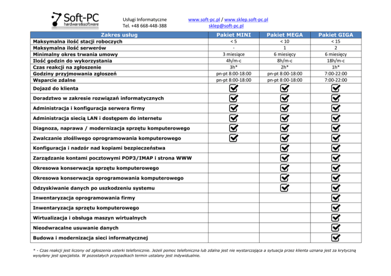 Usługi Informatyczne Tel. +48 668-448-388 www.soft-pc.pl / www.sklep.soft-pc.pl [email protected] Zakres usług Maksymalna ilość stacji roboczych Maksymalna ilość serwerów Minimalny okres trwania umowy Ilość godzin do wykorzystania Czas reakcji na zgłoszenie Godziny przyjmowania zgłoszeń Wsparcie zdalne Pakiet MINI <5 3 miesiące 4h/m-c 3h* pn-pt 8:00-18:00 pn-pt 8:00-18:00 Pakiet MEGA < 10 1 6 miesięcy 8h/m-c 2h* pn-pt 8:00-18:00 pn-pt 8:00-18:00 Pakiet GIGA < 15 2 6 miesięcy 18h/m-c 1h* 7:00-22:00 7:00-22:00 Dojazd do klienta Doradztwo w zakresie rozwiązań informatycznych Administracja i konfiguracja serwera firmy Administracja siecią LAN i dostępem do internetu Diagnoza, naprawa / modernizacja sprzętu komputerowego Zwalczanie złośliwego oprogramowania komputerowego Konfiguracja i nadzór nad kopiami bezpieczeństwa Zarządzanie kontami pocztowymi POP3/IMAP i strona WWW Okresowa konserwacja sprzętu komputerowego Okresowa konserwacja oprogramowania komputerowego Odzyskiwanie danych po uszkodzeniu systemu Inwentaryzacja oprogramowania firmy Inwentaryzacja sprzętu komputerowego Wirtualizacja i obsługa maszyn wirtualnych Nieodwracalne usuwanie danych Budowa i modernizacja sieci informatycznej * - Czas reakcji jest liczony od zgłoszenia usterki telefonicznie. Jeżeli pomoc telefoniczna lub zdalna jest nie wystarczająca a sytuacja przez klienta uznana jest za krytyczną wysyłany jest specjalista. W pozostałych przypadkach termin ustalany jest indywidualnie.
