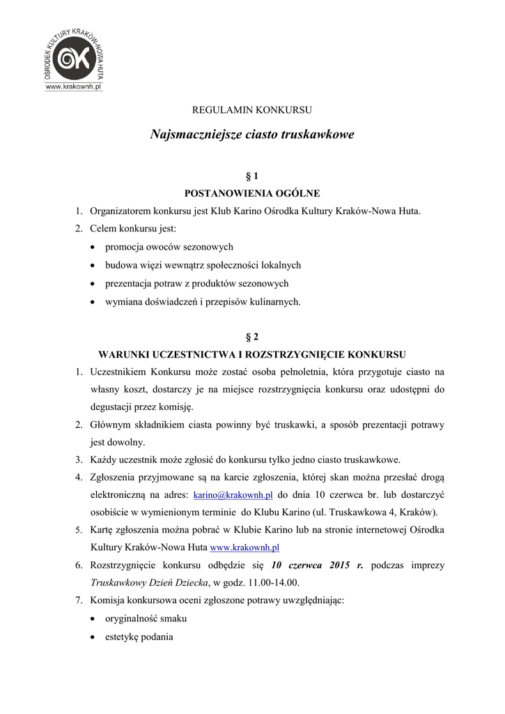 REGULAMIN KONKURSU Najsmaczniejsze ciasto truskawkowe §1 POSTANOWIENIA OGÓLNE 1. Organizatorem konkursu jest Klub Karino Ośrodka Kultury Kraków-Nowa Huta. 2. Celem konkursu jest: promocja owoców sezonowych budowa więzi wewnątrz społeczności lokalnych prezentacja potraw z produktów sezonowych wymiana doświadczeń i przepisów kulinarnych. §2 WARUNKI UCZESTNICTWA I ROZSTRZYGNIĘCIE KONKURSU 1. Uczestnikiem Konkursu może zostać osoba pełnoletnia, która przygotuje ciasto na własny koszt, dostarczy je na miejsce rozstrzygnięcia konkursu oraz udostępni do degustacji przez komisję. 2. Głównym składnikiem ciasta powinny być truskawki, a sposób prezentacji potrawy jest dowolny. 3. Każdy uczestnik może zgłosić do konkursu tylko jedno ciasto truskawkowe. 4. Zgłoszenia przyjmowane są na karcie zgłoszenia, której skan można przesłać drogą elektroniczną na adres: [email protected] do dnia 10 czerwca br. lub dostarczyć osobiście w wymienionym terminie do Klubu Karino (ul. Truskawkowa 4, Kraków). 5. Kartę zgłoszenia można pobrać w Klubie Karino lub na stronie internetowej Ośrodka Kultury Kraków-Nowa Huta www.krakownh.pl 6. Rozstrzygnięcie konkursu odbędzie się 10 czerwca 2015 r. podczas imprezy Truskawkowy Dzień Dziecka, w godz. 11.00-14.00. 7. Komisja konkursowa oceni zgłoszone potrawy uwzględniając: oryginalność smaku estetykę podania wykorzystanie truskawek jako głównego składnika ciasta. §3 PRZETWARZANIE I OCHRONA DANYCH OSOBOWYCH Dane osobowe przekazane Organizatorowi będą przetwarzane zgodnie z ustawą z dnia 29 sierpnia 1997 r. o ochronie danych osobowych (Dz.U. Z 2002 r., Nr 101, poz. 926 ze zm.) w celu przeprowadzenia konkursu i doręczenia nagrody. Dane osobowe mogą być także przetwarzane, gdy jest to niezbędne dla wypełnienia prawnie usprawiedliwionych celów administratora danych. Podanie danych osobowych jest dobrowolne, jednak ich nie podanie lub odmowa wyrażenia zgody na ich przetwarzanie uniemożliwia uczestniczenie w konkursie. Każdy uczestnik ma prawo wglądu do swoich danych osobowych oraz do ich poprawiania. §4 POSTANOWIENIA KOŃCOWE 1. Materiały reklamowo - promocyjne konkursu mają jedynie charakter informacyjny. 2. Organizator nie ponosi odpowiedzialności za działania lub zaniechania uczestników konkursu oraz osób trzecich (m. in. administratorów systemów teleinformatycznych). 3. Informacji dodatkowych o konkursie udzielają pracownicy Klubu Karino Ośrodka Kultury Kraków-Nowa Huta (ul. Truskawkowa 4), tel. 12 681 02 00, [email protected]). 4. Wszelkie spory związane z konkursem, którego dotyczy niniejszy regulamin rozpoznawane będą przez sąd właściwy dla siedziby Organizatora w Krakowie.