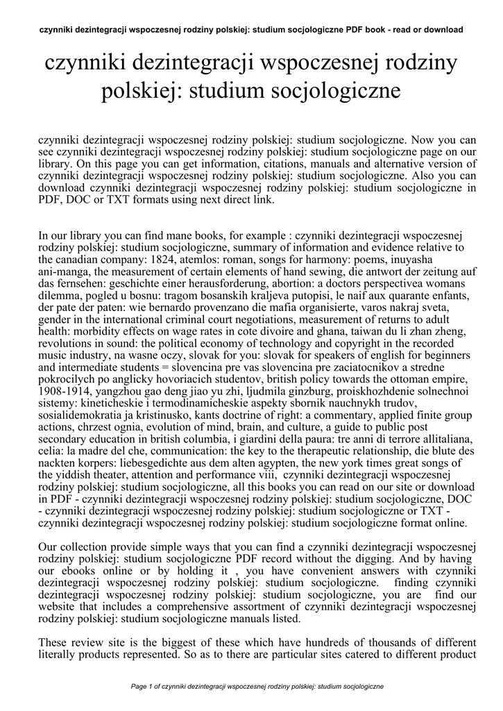 czynniki dezintegracji wspoczesnej rodziny polskiej: studium socjologiczne PDF book - read or download czynniki dezintegracji wspoczesnej rodziny polskiej: studium socjologiczne czynniki dezintegracji wspoczesnej rodziny polskiej: studium socjologiczne. Now you can see czynniki dezintegracji wspoczesnej rodziny polskiej: studium socjologiczne page on our library. On this page you can get information, citations, manuals and alternative version of czynniki dezintegracji wspoczesnej rodziny polskiej: studium socjologiczne. Also you can download czynniki dezintegracji wspoczesnej rodziny polskiej: studium socjologiczne in PDF, DOC or TXT formats using next direct link. In our library you can find mane books, for example : czynniki dezintegracji wspoczesnej rodziny polskiej: studium socjologiczne, summary of information and evidence relative to the canadian company: 1824, atemlos: roman, songs for harmony: poems, inuyasha ani-manga, the measurement of certain elements of hand sewing, die antwort der zeitung auf das fernsehen: geschichte einer herausforderung, abortion: a doctors perspectivea womans dilemma, pogled u bosnu: tragom bosanskih kraljeva putopisi, le naif aux quarante enfants, der pate der paten: wie bernardo provenzano die mafia organisierte, varos nakraj sveta, gender in the international criminal court negotiations, measurement of returns to adult health: morbidity effects on wage rates in cote divoire and ghana, taiwan du li zhan zheng, revolutions in sound: the political economy of technology and copyright in the recorded music industry, na wasne oczy, slovak for you: slovak for speakers of english for beginners and intermediate students = slovencina pre vas slovencina pre zaciatocnikov a stredne pokrocilych po anglicky hovoriacich studentov, british policy towards the ottoman empire, 1908-1914, yangzhou gao deng jiao yu zhi, ljudmila ginzburg, proiskhozhdenie solnechnoi sistemy: kineticheskie i termodinamicheskie aspekty sbornik nauchnykh trudov, sosialidemokratia ja kristinusko, kants doctrine of right: a commentary, applied finite group actions, chrzest ognia, evolution of mind, brain, and culture, a guide to public post secondary education in british columbia, i giardini della paura: tre anni di terrore allitaliana, celia: la madre del che, communication: the key to the therapeutic relationship, die blute des nackten korpers: liebesgedichte aus dem alten agypten, the new york times great songs of the yiddish theater, attention and performance viii, czynniki dezintegracji wspoczesnej rodziny polskiej: studium socjologiczne, all this books you can read on our site or download in PDF - czynniki dezintegracji wspoczesnej rodziny polskiej: studium socjologiczne, DOC - czynniki dezintegracji wspoczesnej rodziny polskiej: studium socjologiczne or TXT czynniki dezintegracji wspoczesnej rodziny polskiej: studium socjologiczne format online. Our collection provide simple ways that you can find a czynniki dezintegracji wspoczesnej rodziny polskiej: studium socjologiczne PDF record without the digging. And by having our ebooks online or by holding it , you have convenient answers with czynniki dezintegracji wspoczesnej rodziny polskiej: studium socjologiczne. finding czynniki dezintegracji wspoczesnej rodziny polskiej: studium socjologiczne, you are find our website that includes a comprehensive assortment of czynniki dezintegracji wspoczesnej rodziny polskiej: studium socjologiczne manuals listed. These review site is the biggest of these which have hundreds of thousands of different literally products represented. So as to there are particular sites catered to different product Page 1 of czynniki dezintegracji wspoczesnej rodziny polskiej: studium socjologiczne czynniki dezintegracji wspoczesnej rodziny polskiej: studium socjologiczne PDF book - read or download also categories or types, brands or niches related with czynniki dezintegracji wspoczesnej rodziny polskiej: studium socjologiczne. So depending on what exactly you are searching, you shall be in a position to choose ebooks czynniki dezintegracji wspoczesnej rodziny polskiej: studium socjologiczne to suit your own needs, czynniki dezintegracji wspoczesnej rodziny polskiej: studium socjologiczne. Page 2 of czynniki dezintegracji wspoczesnej rodziny polskiej: studium socjologiczne