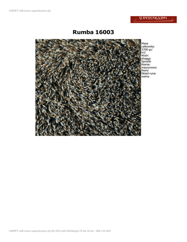 CARPET LAB (www.superdywany.pl) Rumba 16003 Masa całkowita: 3700 gr/ m2 Wzór: shaggy Sposób tkania: maszynowo tkany Skład runa: wełna CARPET LAB (www.superdywany.pl),90-205 Łódź Kilińskiego 25 lok.16 tel.: 508-132-665