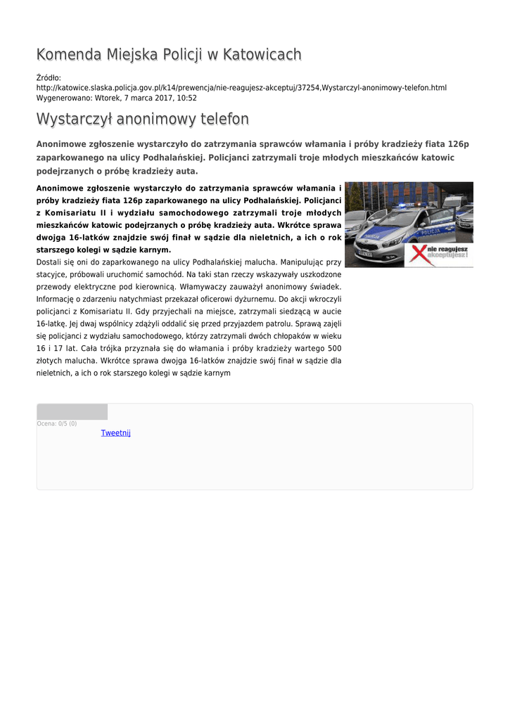 Komenda Miejska Policji w Katowicach Źródło: http://katowice.slaska.policja.gov.pl/k14/prewencja/nie-reagujesz-akceptuj/37254,Wystarczyl-anonimowy-telefon.html Wygenerowano: Wtorek, 7 marca 2017, 10:52 Wystarczył anonimowy telefon Anonimowe zgłoszenie wystarczyło do zatrzymania sprawców włamania i próby kradzieży fiata 126p zaparkowanego na ulicy Podhalańskiej. Policjanci zatrzymali troje młodych mieszkańców katowic podejrzanych o próbę kradzieży auta. Anonimowe zgłoszenie wystarczyło do zatrzymania sprawców włamania i próby kradzieży fiata 126p zaparkowanego na ulicy Podhalańskiej. Policjanci z Komisariatu II i wydziału samochodowego zatrzymali troje młodych mieszkańców katowic podejrzanych o próbę kradzieży auta. Wkrótce sprawa dwojga 16-latków znajdzie swój finał w sądzie dla nieletnich, a ich o rok starszego kolegi w sądzie karnym. Dostali się oni do zaparkowanego na ulicy Podhalańskiej malucha. Manipulując przy stacyjce, próbowali uruchomić samochód. Na taki stan rzeczy wskazywały uszkodzone przewody elektryczne pod kierownicą. Włamywaczy zauważył anonimowy świadek. Informację o zdarzeniu natychmiast przekazał oficerowi dyżurnemu. Do akcji wkroczyli policjanci z Komisariatu II. Gdy przyjechali na miejsce, zatrzymali siedzącą w aucie 16-latkę. Jej dwaj wspólnicy zdążyli oddalić się przed przyjazdem patrolu. Sprawą zajęli się policjanci z wydziału samochodowego, którzy zatrzymali dwóch chłopaków w wieku 16 i 17 lat. Cała trójka przyznała się do włamania i próby kradzieży wartego 500 złotych malucha. Wkrótce sprawa dwojga 16-latków znajdzie swój finał w sądzie dla nieletnich, a ich o rok starszego kolegi w sądzie karnym Ocena: 0/5 (0) Tweetnij