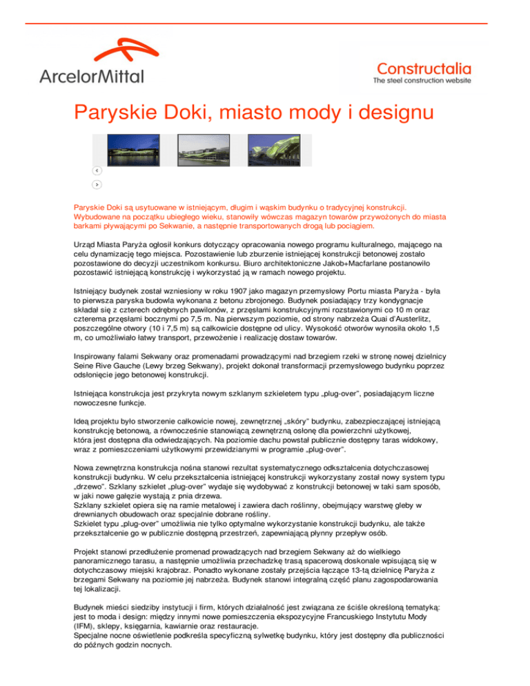 Paryskie Doki, miasto mody i designu Paryskie Doki są usytuowane w istniejącym, długim i wąskim budynku o tradycyjnej konstrukcji. Wybudowane na początku ubiegłego wieku, stanowiły wówczas magazyn towarów przywożonych do miasta barkami pływającymi po Sekwanie, a następnie transportowanych drogą lub pociągiem. Urząd Miasta Paryża ogłosił konkurs dotyczący opracowania nowego programu kulturalnego, mającego na celu dynamizację tego miejsca. Pozostawienie lub zburzenie istniejącej konstrukcji betonowej zostało pozostawione do decyzji uczestnikom konkursu. Biuro architektoniczne Jakob+Macfarlane postanowiło pozostawić istniejącą konstrukcję i wykorzystać ją w ramach nowego projektu. Istniejący budynek został wzniesiony w roku 1907 jako magazyn przemysłowy Portu miasta Paryża - była to pierwsza paryska budowla wykonana z betonu zbrojonego. Budynek posiadający trzy kondygnacje składał się z czterech odrębnych pawilonów, z przęsłami konstrukcyjnymi rozstawionymi co 10 m oraz czterema przęsłami bocznymi po 7,5 m. Na pierwszym poziomie, od strony nabrzeża Quai d’Austerlitz, poszczególne otwory (10 i 7,5 m) są całkowicie dostępne od ulicy. Wysokość otworów wynosiła około 1,5 m, co umożliwiało łatwy transport, przewożenie i realizację dostaw towarów. Inspirowany falami Sekwany oraz promenadami prowadzącymi nad brzegiem rzeki w stronę nowej dzielnicy Seine Rive Gauche (Lewy brzeg Sekwany), projekt dokonał transformacji przemysłowego budynku poprzez odsłonięcie jego betonowej konstrukcji. Istniejąca konstrukcja jest przykryta nowym szklanym szkieletem typu „plug-over”, posiadającym liczne nowoczesne funkcje. Ideą projektu było stworzenie całkowicie nowej, zewnętrznej „skóry” budynku, zabezpieczającej istniejącą konstrukcję betonową, a równocześnie stanowiącą zewnętrzną osłonę dla powierzchni użytkowej, która jest dostępna dla odwiedzających. Na poziomie dachu powstał publicznie dostępny taras widokowy, wraz z pomieszczeniami użytkowymi przewidzianymi w programie „plug-over”. Nowa zewnętrzna konstrukcja nośna stanowi rezultat systematycznego odkształcenia dotychczasowej konstrukcji budynku. W celu przekształcenia istniejącej konstrukcji wykorzystany został nowy system typu „drzewo”. Szklany szkielet „plug-over” wydaje się wydobywać z konstrukcji betonowej w taki sam sposób, w jaki nowe gałęzie wystają z pnia drzewa. Szklany szkielet opiera się na ramie metalowej i zawiera dach roślinny, obejmujący warstwę gleby w drewnianych obudowach oraz specjalnie dobrane rośliny. Szkielet typu „plug-over” umożliwia nie tylko optymalne wykorzystanie konstrukcji budynku, ale także przekształcenie go w publicznie dostępną przestrzeń, zapewniającą płynny przepływ osób. Projekt stanowi przedłużenie promenad prowadzących nad brzegiem Sekwany aż do wielkiego panoramicznego tarasu, a następnie umożliwia przechadzkę trasą spacerową doskonale wpisującą się w dotychczasowy miejski krajobraz. Ponadto wykonane zostały przejścia łączące 13-tą dzielnicę Paryża z brzegami Sekwany na poziomie jej nabrzeża. Budynek stanowi integralną część planu zagospodarowania tej lokalizacji. Budynek mieści siedziby instytucji i firm, których działalność jest związana ze ściśle określoną tematyką: jest to moda i design: między innymi nowe pomieszczenia ekspozycyjne Francuskiego Instytutu Mody (IFM), sklepy, księgarnia, kawiarnie oraz restauracje. Specjalne nocne oświetlenie podkreśla specyficzną sylwetkę budynku, który jest dostępny dla publiczności do późnych godzin nocnych. Główny wykonawca: Icade G3A Inwestor: Caisse des Dépôts Harmonogram realizacji: Konkurs 2005, końcowy termin realizacji 2008 Powierzchnia: 20 000 m2 Lokalizacja: Quai Austerlitz, 13-ta dzielnica Paryża Zadanie: Zadanie podstawowe Program: Francuski Instytut Mody, pomieszczenia wystawowe, restauracja, sklepy, promenada Tekst: JAKOB + MACFARLANE Copyright © 2014 Constructalia. All rights reserved