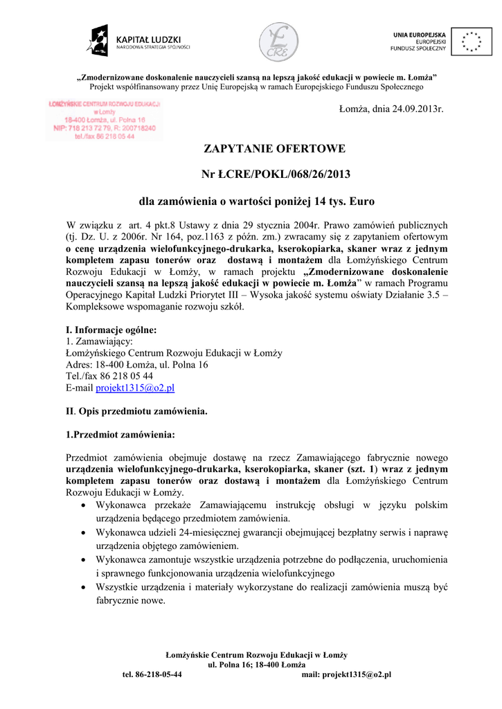 „Zmodernizowane doskonalenie nauczycieli szansą na lepszą jakość edukacji w powiecie m. Łomża” Projekt współfinansowany przez Unię Europejską w ramach Europejskiego Funduszu Społecznego Łomża, dnia 24.09.2013r. ZAPYTANIE OFERTOWE Nr ŁCRE/POKL/068/26/2013 dla zamówienia o wartości poniżej 14 tys. Euro W związku z art. 4 pkt.8 Ustawy z dnia 29 stycznia 2004r. Prawo zamówień publicznych (tj. Dz. U. z 2006r. Nr 164, poz.1163 z późn. zm.) zwracamy się z zapytaniem ofertowym o cenę urządzenia wielofunkcyjnego-drukarka, kserokopiarka, skaner wraz z jednym kompletem zapasu tonerów oraz dostawą i montażem dla Łomżyńskiego Centrum Rozwoju Edukacji w Łomży, w ramach projektu „Zmodernizowane doskonalenie nauczycieli szansą na lepszą jakość edukacji w powiecie m. Łomża” w ramach Programu Operacyjnego Kapitał Ludzki Priorytet III – Wysoka jakość systemu oświaty Działanie 3.5 – Kompleksowe wspomaganie rozwoju szkół. I. Informacje ogólne: 1. Zamawiający: Łomżyńskiego Centrum Rozwoju Edukacji w Łomży Adres: 18-400 Łomża, ul. Polna 16 Tel./fax 86 218 05 44 E-mail [email protected] II. Opis przedmiotu zamówienia. 1.Przedmiot zamówienia: Przedmiot zamówienia obejmuje dostawę na rzecz Zamawiającego fabrycznie nowego urządzenia wielofunkcyjnego-drukarka, kserokopiarka, skaner (szt. 1) wraz z jednym kompletem zapasu tonerów oraz dostawą i montażem dla Łomżyńskiego Centrum Rozwoju Edukacji w Łomży. Wykonawca przekaże Zamawiającemu instrukcję obsługi w języku polskim urządzenia będącego przedmiotem zamówienia. Wykonawca udzieli 24-miesięcznej gwarancji obejmującej bezpłatny serwis i naprawę urządzenia objętego zamówieniem. Wykonawca zamontuje wszystkie urządzenia potrzebne do podłączenia, uruchomienia i sprawnego funkcjonowania urządzenia wielofunkcyjnego Wszystkie urządzenia i materiały wykorzystane do realizacji zamówienia muszą być fabrycznie nowe. Łomżyńskie Centrum Rozwoju Edukacji w Łomży ul. Polna 16; 18-400 Łomża tel. 86-218-05-44 mail: [email protected] „Zmodernizowane doskonalenie nauczycieli szansą na lepszą jakość edukacji w powiecie m. Łomża” Projekt współfinansowany przez Unię Europejską w ramach Europejskiego Funduszu Społecznego 2. Wymagane parametry techniczne urządzenia Parametry techniczne Opis: Czarno-biała laserowa drukarka / kopiarka / skaner 1. Technologia obrazowania Elektrofotografia laserowa Szybkość 25 str./min. (cz-b) Czas nagrzewania 30 sekund Czas druku pierwszej kopii 5,4 sekundy Rozmiar oryginału A5 - A3 (podajnik dokumentów) Typ dupleksu 1:2, 2:1, 2:2 Podajniki papieru Kaseta 1: 550 arkuszy (80 g/m²) Kaseta 2: 550 arkuszy (80 g/m²) Podajnik boczny: 100 arkuszy (A4, A4R, A5; 80 g/m²), 50 arkuszy (A3; 80 g/m²) Rozmiary papieru A3, A4, A4R, A5R, niestandardowe Łomżyńskie Centrum Rozwoju Edukacji w Łomży ul. Polna 16; 18-400 Łomża tel. 86-218-05-44 mail: [email protected] „Zmodernizowane doskonalenie nauczycieli szansą na lepszą jakość edukacji w powiecie m. Łomża” Projekt współfinansowany przez Unię Europejską w ramach Europejskiego Funduszu Społecznego Gramatura papieru 64 - 90 g/m² Podajnik boczny: 64 - 128 g/m² Podajnik dokumentów DADF-AB1 Rozmiar oryginałów: A3, A4, A4R, A5, A5R Gramatura: oryginał jednostronny: 42 do 128 g/m², oryginał dwustronny: 50 do 128 g/m² Pojemność całkowita: 50 oryginałów Wykańczanie układanie offsetowe, grupowanie, sortowanie Kontroler Procesor Processor, 400MHz Pamięć 256 MB Interfejs sieciowy Ethernet (100Base-TX / 10Base-T), USB2.0 Protokoły TCP / IP (LPD / Port9100, HTTP), SMB, SNMPv1, WSD, obsługa IPv4 / IPv6 System operacyjny PCL: Windows 2000 / XP / Server 2003 / Vista / Server 2008 / Windows 7 Eumlacja Postscript 3:: Windows 2000 / XP / Server 2003 / Vista / Server 2008 / Windows 7, Mac OS X (10.4 albo nowszy) UFRII-LT: Windows 2000 / XP / Server 2003 / Vista / Server 2008 / Windows 7, Mac OS X (10.4 albo nowszy), Linux Mac-PPD: Mac OS X 10.4 albo nowszy Łomżyńskie Centrum Rozwoju Edukacji w Łomży ul. Polna 16; 18-400 Łomża tel. 86-218-05-44 mail: [email protected] „Zmodernizowane doskonalenie nauczycieli szansą na lepszą jakość edukacji w powiecie m. Łomża” Projekt współfinansowany przez Unię Europejską w ramach Europejskiego Funduszu Społecznego 2. Drukowanie i kopiowanie Rozdzielczość kopii Odczyt: 600 x 600 dpi Zapis: 600 x 600 dpi Rozdzielczość wydruku 600 x 600 dpi, 1200 x 1200 dpi (UFRII-LT) Powiększenie 25 - 400% (skalowanie co 0,1%), stałe wartości: 25%, 50%, 70%, 100%, 141%, 200%, 400% Możliwości Tworzenie i programowanie zadań, tryb oszczędnego zużycia tonera, obsługa zróżnicowanych rozmiarów oryginałów 3. Skanowanie Prędkość skanowania 25 / 13 obrazów na min. (A4, 600 x 600 dpi: w czerni i bieli / 300 x 300 dpi: w kolorze) Rozdzielczość cz-b: 100 x 100 dpi, 150 x 150 dpi, 200 x 100 dpi, 200 x 200 dpi, 200 x 400 dpi, 300 x 300 dpi, 400 x 400 dpi, 600 x 600dpi kolor: 100 x 100 dpi,150 x 150 dpi, 200 x 200 dpi, 300 x 300 dpi Dostarczanie Skan na email, skan do FTP, skan do SMB, skan do iWDM, skan do PC, skan do USB Format pliku TIFF, JPEG, PDF, skompresowany PDF Możliwości Skan w kolorze Modem Łomżyńskie Centrum Rozwoju Edukacji w Łomży ul. Polna 16; 18-400 Łomża tel. 86-218-05-44 mail: [email protected] „Zmodernizowane doskonalenie nauczycieli szansą na lepszą jakość edukacji w powiecie m. Łomża” Projekt współfinansowany przez Unię Europejską w ramach Europejskiego Funduszu Społecznego Super G3 33,6 Kbps Podstawa na rolkach Drukarka powinna być gotowa do pracy z oryginalnym nowym, pełnym tonerem wyprodukowanym przez producenta urządzenia. III.Termin wykonania zamówienia. Termin realizacji zamówienia: 5 dni od podpisania umowy IV. Opis sposobu przygotowania oferty. 1. Oferta powinna zostać przygotowana zgodnie z załącznikiem nr 1 do niniejszego zapytania i dostarczona wraz z załąc