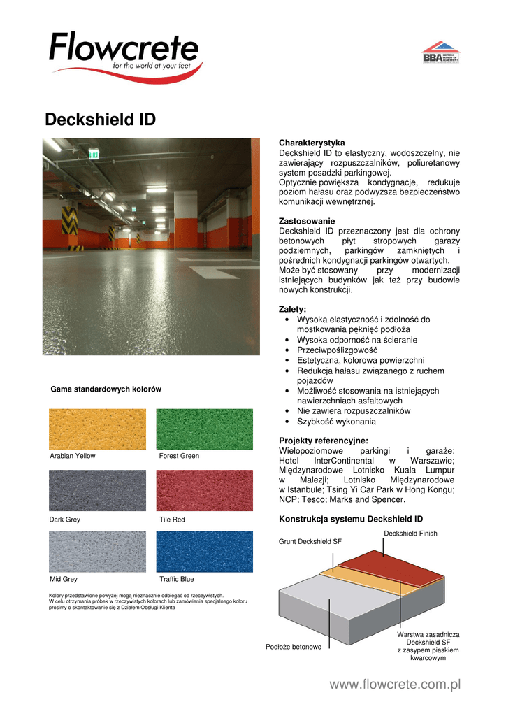 Deckshield ID Charakterystyka Deckshield ID to elastyczny, wodoszczelny, nie zawierający rozpuszczalników, poliuretanowy system posadzki parkingowej. Optycznie powiększa kondygnacje, redukuje poziom hałasu oraz podwyższa bezpieczeństwo komunikacji wewnętrznej. Zastosowanie Deckshield ID przeznaczony jest dla ochrony betonowych płyt stropowych garaży podziemnych, parkingów zamkniętych i pośrednich kondygnacji parkingów otwartych. Może być stosowany przy modernizacji istniejących budynków jak też przy budowie nowych konstrukcji. Gama standardowych kolorów Arabian Yellow Forest Green Dark Grey Tile Red Zalety: • Wysoka elastyczność i zdolność do mostkowania pęknięć podłoża • Wysoka odporność na ścieranie • Przeciwpoślizgowość • Estetyczna, kolorowa powierzchni • Redukcja hałasu związanego z ruchem pojazdów • Możliwość stosowania na istniejących nawierzchniach asfaltowych • Nie zawiera rozpuszczalników • Szybkość wykonania Projekty referencyjne: Wielopoziomowe parkingi i garaże: Hotel InterContinental w Warszawie; Międzynarodowe Lotnisko Kuala Lumpur w Malezji; Lotnisko Międzynarodowe w Istanbule; Tsing Yi Car Park w Hong Kongu; NCP; Tesco; Marks and Spencer. Konstrukcja systemu Deckshield ID Deckshield Finish Grunt Deckshield SF Mid Grey Traffic Blue Kolory przedstawione powyżej mogą nieznacznie odbiegać od rzeczywistych. W celu otrzymania próbek w rzeczywistych kolorach lub zamówienia specjalnego koloru prosimy o skontaktowanie się z Działem Obsługi Klienta Podłoże betonowe Warstwa zasadnicza Deckshield SF z zasypem piaskiem kwarcowym www.flowcrete.com.pl Charakterystyka systemu Produkt: Deckshield ID Wykończenie powierzchni: błyszczące Grubość: ok.1,5 mm Kolor: według katalogu Producent: Flowcrete Group Ltd, UK Dostawca: Flowcrete Polska Sp. z o.o. Telefon: Dział Obsługi Klienta +48 22 879 89 07 Dane techniczne Poniższe wyniki badań uzyskano w badaniach o laboratoryjnych przy temperaturze 20 C i 50% wilgotności względnej. Klasyfikacja ogniowa Przeciwpoślizgowość Wykonanie posadzki Przygotowanie i wykonanie systemu Deckshield ID powinno być przeprowadzone przez Autoryzowanego Wykonawcę zgodnie z instrukcją producenta oraz dokumentacją techniczną. Aby uzyskać szczegółowe informacje dotyczące sieci Autoryzowanych Wykonawców należy skontaktować się z Działem Obsługi Klienta lub wysłać zapytanie przez naszą stronę internetową: www.flowcrete.com.pl Produkty wchodzące w skład systemu Deckshield ID Warstwa gruntująca: Deckshield SF Piasek kwarcowy 0,1 - 0,3 mm Warstwa zasadnicza: Deckshield SF Piasek kwarcowy 0,1 - 0,3 mm Piasek kwarcowy 0,4 - 0,8 mm Warstwa zamykająca: Deckshield Finish Szczegółowa życzenie. instrukcja wykonania dostępna Odporność termiczna Nasiąkliwość Odporność chemiczna Odporność na jony chlorków Odporność na ścieranie Wytrzymałość na rozciąganie / wydłużenie względne 2 N/mm /% Wytrzymałość na rozdzieranie Przyczepność na BS476: Część 3: Spełnia wymagania EXT.FF.AA TRRL Pendulum Slip Test Sucha 92 Mokra 46 o Do 70 C Zerowa – Test Karsten Odporny na benzynę, olej napędowy, olej silnikowy, chlorek sodu, płyn do chłodnic ,kwas akumulatorowy. DOT BD47/94: Appendix B, Metoda B4,2(d). Rezultat: bez zmian po 28 dniach wg Taber: utrata 40 mg przy 1000 cykli (obciążenie 1 kg przy kole H-22) BS2782:Part 3 Metoda 320A o Próbki badano przy 70 C 1 dzień 5.4/50.4 7 dni 7.15/40.2 28 dni 7.17/30.5 MOAT 27 Metoda 5.4.1 Rezultat testu = 192 N Wyższa niż powierzchniowa wytrzymałość betonu klasy C 20/25 na rozciąganie ( >1.5 MPa). Wymagania dla podłoża betonowego Podkład betonowy powinien być klasy C20/25, pozbawiony mleczka cementowego, kurzu i innych zanieczyszczeń. Wilgotność względna betonu nie może przekraczać 75% zgodnie z normą BS 8204. W przypadku wyższych wilgotności należy zastosować żywicę Deckshield EP jako warstwę gruntującą. Czas utwardzania Wpływ na środowisko Produkt końcowy uważany jest za nieszkodliwy dla zdrowia i środowiska. Bezspoinowość, szczelność i doskonała przyczepność do podłoża powodują, że system spełnia wymagania higieniczne i ochrony środowiska. Posadzka jest łatwa do utrzymania w czystości i wymaga tylko w minimalnym zakresie stosowania chemicznych środków czystości. Kompleksowa obsługa klienta Flowcrete Group Ltd jest światowym liderem w branży posadzkowej, specjalizującym się w posadzkach na bazie żywic syntetycznych. Dostępne systemy obejmują między innymi: samorozlewne masy posadzkowe, systemy do ogrzewania podłogowego, membrany przeciwwilgociowe, posadzki przemysłowe i dekoracyjne, nawierzchnie parkingowe, systemy antykorozyjne. Naszym celem jest spełnienie Państwa wymagań w zakresie posadzek. Zamówienia dotyczące specjalnych kolorów i wzorów realizowane są na życzenie klienta. Czyszczenie i konserwacja Posadzkę można zamiatać, odkurzać, zmywać na mokro lub sprzątać przy użyciu maszyny czyszczącej wyposażonej w tarcze szczotkowe w połączeniu ze średnio alkalicznym detergentem. Ruch pieszy Ruch pojazdów Pełne utwardzenie o 10 C 30 h 36 h 12 dni o 20 C 16 h 24h 7 dni o 30 C 10 h 16 h 5 dni Informacje uzupełniające Produkty Flowcrete zapewniają najwyższy standard jakościowy. Zasady sprzedaży materiałów oraz gwarancji zawarte są w Szczególnych Warunkach Dostaw i Sprzedaży (dokument dostępny na życzenie). W celu upewnienia się, czy wybrane przez Państwa rozwiązanie spełnia wszystkie wymagania projektowe i użytkowe prosimy o kontakt z Działem Obsługi Klienta. Flowcrete Polska Sp. z o.o. Ul. Marywilska 34 I, 03-228 Warszawa, Polska Tel. +48 22 879 89 07, Fax: +48 22 879 89 18 Email: [email protected] Flowcrete Polska jest częścią firmy RPM www.flowcrete.com.pl