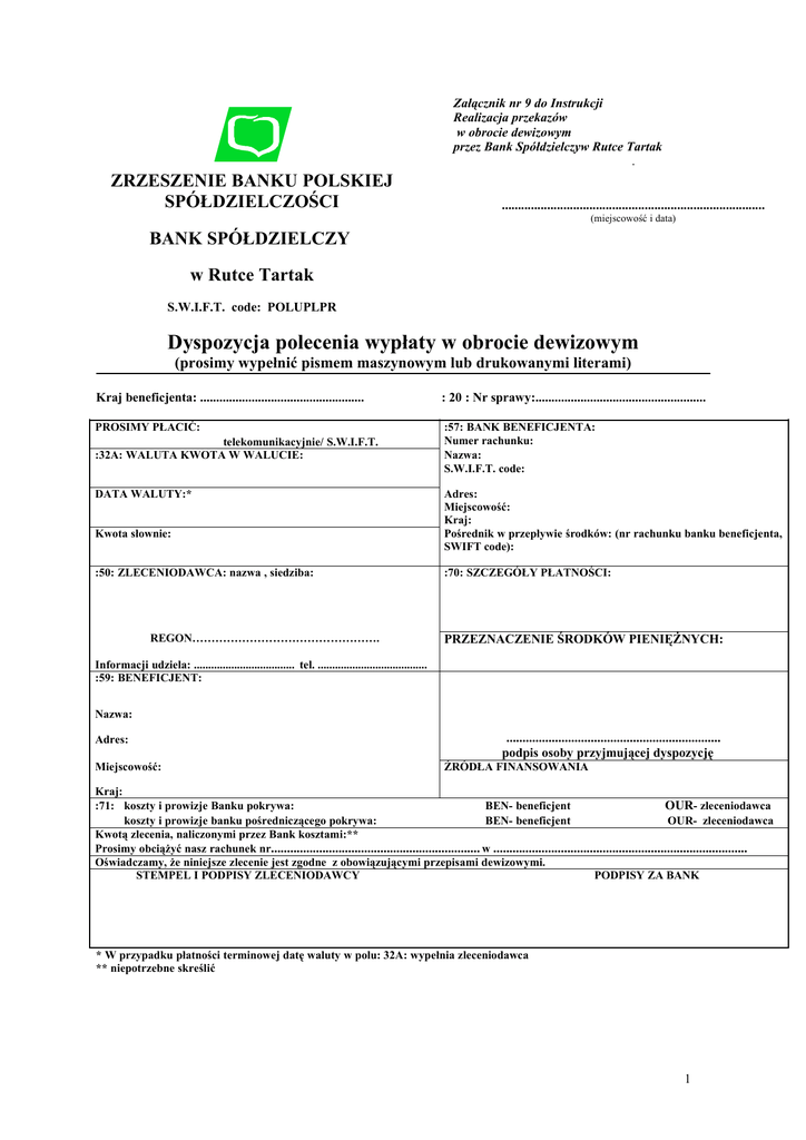 Załącznik nr 9 do Instrukcji Realizacja przekazów w obrocie dewizowym przez Bank Spółdzielczyw Rutce Tartak . ZRZESZENIE BANKU POLSKIEJ SPÓŁDZIELCZOŚCI ................................................................................. (miejscowość i data) BANK SPÓŁDZIELCZY w Rutce Tartak S.W.I.F.T. code: POLUPLPR Dyspozycja polecenia wypłaty w obrocie dewizowym (prosimy wypełnić pismem maszynowym lub drukowanymi literami) Kraj beneficjenta: ................................................... : 20 : Nr sprawy:..................................................... PROSIMY PŁACIĆ: :57: BANK BENEFICJENTA: Numer rachunku: Nazwa: S.W.I.F.T. code: telekomunikacyjnie/ S.W.I.F.T. :32A: WALUTA KWOTA W WALUCIE: DATA WALUTY:* Kwota słownie: :50: ZLECENIODAWCA: nazwa , siedziba: REGON…………………………………………. Adres: Miejscowość: Kraj: Pośrednik w przepływie środków: (nr rachunku banku beneficjenta, SWIFT code): :70: SZCZEGÓŁY PŁATNOŚCI: PRZEZNACZENIE ŚRODKÓW PIENIĘŻNYCH: Informacji udziela: ................................... tel. ...................................... :59: BENEFICJENT: Nazwa: Adres: Miejscowość: .................................................................. podpis osoby przyjmującej dyspozycję ŹRÓDŁA FINANSOWANIA Kraj: :71: koszty i prowizje Banku pokrywa: BEN- beneficjent OUR- zleceniodawca koszty i prowizje banku pośredniczącego pokrywa: BEN- beneficjent OUR- zleceniodawca Kwotą zlecenia, naliczonymi przez Bank kosztami:** Prosimy obciążyć nasz rachunek nr................................................................. w ............................................................................... Oświadczamy, że niniejsze zlecenie jest zgodne z obowiązującymi przepisami dewizowymi. STEMPEL I PODPISY ZLECENIODAWCY PODPISY ZA BANK * W przypadku płatności terminowej datę waluty w polu: 32A: wypełnia zleceniodawca ** niepotrzebne skreślić 1 WARUNKI WYKONYWANIA PRZEZ BANK SPÓŁDZIELCZY POLECEŃ WYPŁATY W OBROCIE DEWIZOWYM 1. Bank, na podstawie pisemnej dyspozycji Zleceniodawcy zobowiązuje się do przekazania zagranicznych lub krajowych środków płatniczych w określonej wysokości, na rzecz wskazanego przez Zleceniodawcę odbiorcy (beneficjenta), do wszystkich krajów świata, za pośrednictwem Systemu Międzynarodowej Telekomunikacji Finansowej „S.W.I.F.T.” lub „EuroELIXIR”. 2. Bank dokłada starań, aby kwota polecenia wypłaty została przekazana do beneficjenta możliwie najkrótszą drogą i przy minimalizacji kosztów. Wybór banku pośredniczącego w dokonaniu płatności pozostawia się do decyzji Banku. 3. Bank jest obowiązany do przekazywania danych w zakresie niezbędnym do sporządzenia przez NBP bilansu płatniczego oraz międzynarodowej pozycji inwestycyjnej, w związku z tym zleceniodawcy poleceń wypłaty mają obowiązek udzielać Bankowi informacji o dokonywanym za jego pośrednictwem obrocie dewizowym, w szczególności dotyczących przeznaczenia środków pieniężnych będących przedmiotem takiego obrotu. 4. Klient zlecający Bankowi dokonanie przekazu pieniężnego lub rozliczenia w obrocie dewizowym jest zobowiązany, w każdym przypadku, do podawania w swojej pisemnej dyspozycji informacji o przeznaczeniu środków pieniężnych będących przedmiotem takiego obrotu. 5. Bank wykonuje polecenia wypłaty w dniu przyjęcia dyspozycji, z tym że dyspozycje złożone do godziny 12.00 (w przypadku daty waluty „spot”) oraz 11,00 (w przypadku daty waluty „dziś” i „jutro”) traktuje się jako przyjęte w danym dniu roboczym, zaś złożone po tych godzinach i w soboty robocze jako przyjęte w następnym dniu roboczym. 6. Bank realizuje polecenia wypłaty opiewające na kwoty do 1.000 USD i EUR z datą waluty „dziś”. 7. Istnieje możliwość realizacji poleceń wypłaty opiewających na kwoty powyżej 1.000 USD i EUR oraz inne waluty wymienialne, w tym PLN, w miarę posiadanych przez Bank środków, z datą waluty „dziś” lub „jutro”, pod warunkiem uiszczenia opłaty dodatkowej zgodnie z obowiązującą w Banku „Taryfą opłat i prowizji bankowych Banku Spółdzielczego w Rutce Tartak”. 8. Gdy, Zleceniodawca zaznaczy w treści dyspozycji, że koszty banku pośredniczącego pokrywa beneficjent (BEN), kwota przekazu zostanie pomniejszona o należne temu bankowi koszty. 9. Gdy, Zleceniodawca zaznaczy w treści dyspozycji, że on pokrywa koszty banku pośredniczącego (OUR), Bank pobiera zryczałtowane koszty „z góry” (o ile są Bankowi znane) lub blokuje na rachunku Klienta równowartość 20 EUR, na pokrycie przyszłych kosztów tego banku. 10. W przypadku wystąpienia wyższych kosztów banku pośredniczącego lub kosztów dotyczących korekt/ anulacji, korespondencji i wyjaśnień wynikających z winy Zleceniodawcy, jest on zobowiązany do pokrycia ich w pełnej wysokości. 11. W przypadku podania w treści dyspozycji niepełnych lub błędnych danych dotyczących beneficjenta lub banku beneficjenta, Zleceniodawca zobowiązany jest do pokrycia ewentualnych dodatkowych kosztów banków pośredniczących niezależnie od wskazanej dyspozycji kosztowej. 12. W momencie składania w Banku dyspozycji, Klient jest zobowiązany do postawienia do dyspozycji Banku środków niezbędnych do wykonania polecenia wypłaty oraz opłacenia prowizji Banku i opłaty Swift- owej (w przypadku pozostałych poleceń wypłaty) zgodnie z obowiązującą w Banku „Taryfą opłat i prowizji bankowych Banku Spółdzielczego w Rutce Tartak”. ................................................................ (stempel i podpisy Zleceniodawcy) 2