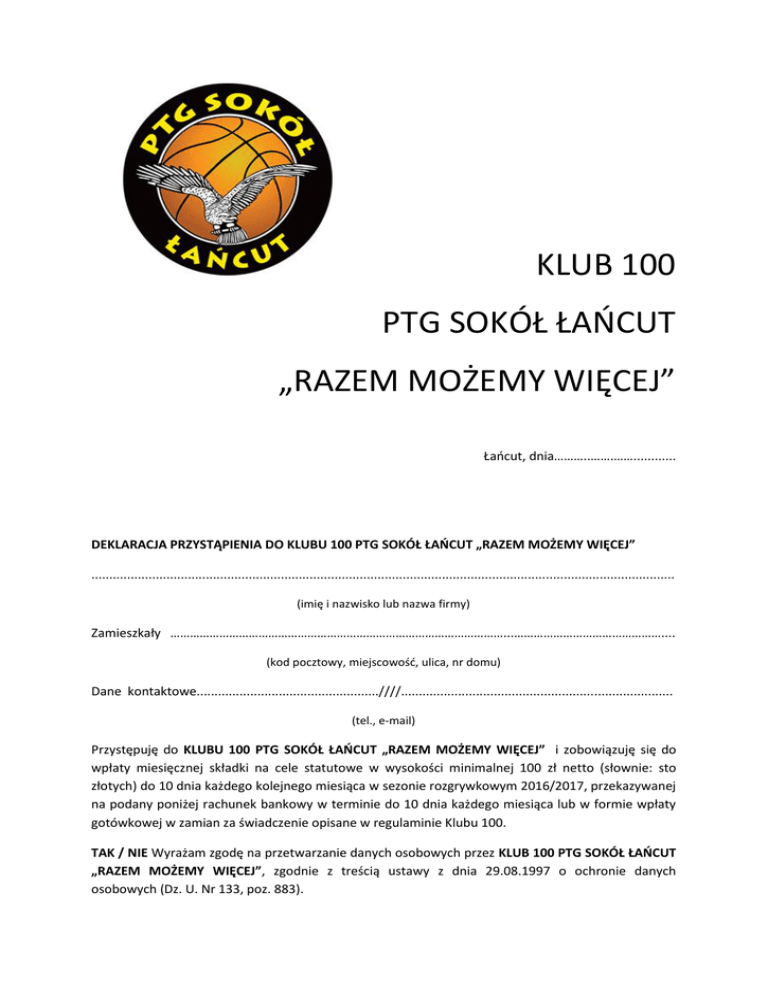 KLUB 100 PTG SOKÓŁ ŁAŃCUT „RAZEM MOŻEMY WIĘCEJ” Łaocut, dnia………..…….……............ DEKLARACJA PRZYSTĄPIENIA DO KLUBU 100 PTG SOKÓŁ ŁAOCUT „RAZEM MOŻEMY WIĘCEJ” ................................................................................................................................................................... (imię i nazwisko lub nazwa firmy) Zamieszkały …………………………………………………………………………………………...……………………………………….... (kod pocztowy, miejscowośd, ulica, nr domu) Dane kontaktowe...................................................////............................................................................ (tel., e-mail) Przystępuję do KLUBU 100 PTG SOKÓŁ ŁAOCUT „RAZEM MOŻEMY WIĘCEJ” i zobowiązuję się do wpłaty miesięcznej składki na cele statutowe w wysokości minimalnej 100 zł netto (słownie: sto złotych) do 10 dnia każdego kolejnego miesiąca w sezonie rozgrywkowym 2016/2017, przekazywanej na podany poniżej rachunek bankowy w terminie do 10 dnia każdego miesiąca lub w formie wpłaty gotówkowej w zamian za świadczenie opisane w regulaminie Klubu 100. TAK / NIE Wyrażam zgodę na przetwarzanie danych osobowych przez KLUB 100 PTG SOKÓŁ ŁAOCUT „RAZEM MOŻEMY WIĘCEJ”, zgodnie z treścią ustawy z dnia 29.08.1997 o ochronie danych osobowych (Dz. U. Nr 133, poz. 883). TAK / NIE Wyrażam zgodę na realizację wszystkich świadczeo określonych w pkt. 5 regulaminu KLUBU 100 PTG SOKÓŁ ŁAOCUT „RAZEM MOŻEMY WIĘCEJ” …………………………………………………..….. czytelny podpis Wpłaty na konto: Rachunek: PBS Bank: 91 8642 1142 2014 2400 0936 0003 z koniecznym dopiskiem: „Klub 100” składka na cele statutowe, imię i nazwisko lub nazwa firmy lub wpłata gotówkowa u przedstawiciela klubu.