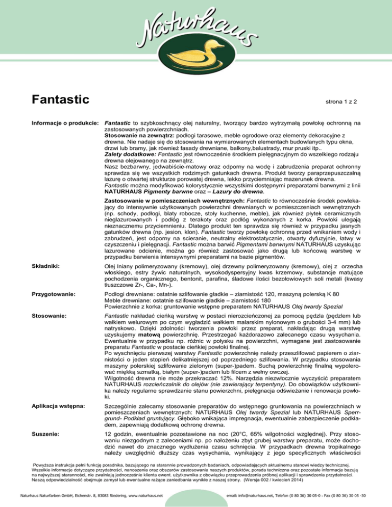 Fantastic strona 1 z 2 Informacje o produkcie: Fantastic to szybkoschnący olej naturalny, tworzący bardzo wytrzymałą powłokę ochronną na zastosowanych powierzchniach. Stosowanie na zewnątrz: podłogi tarasowe, meble ogrodowe oraz elementy dekoracyjne z drewna. Nie nadaje się do stosowania na wymiarowanych elementach budowlanych typu okna, drzwi lub bramy, jak również fasady drewniane, balkony,balustrady, mur pruski itp.. Zalety dodatkowe: Fantastic jest równocześnie środkiem pielęgnacyjnym do wszelkiego rodzaju drewna olejowanego na zewnątrz. Nasz bezbarwny, jedwabiście-matowy oraz odporny na wodę i zabrudzenia preparat ochronny sprawdza się we wszystkich rodzimych gatunkach drewna. Produkt tworzy paraprzepuszczalną lazurę o otwartej strukturze porowatej drewna, lekko przyciemniając mazerunek drewna. Fantastic można modyfikować kolorystycznie wszystkimi dostępnymi preparatami barwnymi z linii NATURHAUS Pigmenty barwne oraz – Lazury do drewna. Zastosowanie w pomieszczeniach wewnętrznych: Fantastic to równocześnie środek powlekający do intensywnie użytkowanych powierzchni drewnianych w pomieszczeniach wewnętrznych (np. schody, podłogi, blaty robocze, stoły kuchenne, meble), jak również płytek ceramicznych nieglazurowanych i podłóg z terakoty oraz podłóg wykonanych z korka. Powłoki ulegają nieznacznemu przyciemnieniu. Dlatego produkt ten sprawdza się również w przypadku jasnych gatunków drewna (np. jesion, klon). Fantastic tworzy powłokę ochronną przed wnikaniem wody i zabrudzeń, jest odporny na scieranie, neutralny elektrostatycznie, otwarty dyfuzyjnie, łatwy w czyszczeniu i pielęgnacji. Fantastic można barwić Pigmentami barwnymi NATURHAUS uzyskując lazurowane odcienie, można go również zastosować jako drugą lub końcową warstwę w przypadku barwienia intensywnymi preparatami na bazie pigmentów. Składniki: Olej lniany polimeryzowany (kremowy), olej drzewny polimeryzowany (kremowy), olej z orzecha włoskiego, estry żywic naturalnych, wysokodyspersyjny kwas krzemowy, substancje matujące pochodzenia organicznego, bentonit, parafina, śladowe ilości bezołowiowych soli metali (kwasy tłuszczowe Zr-, Ca-, Mn-). Przygotowanie: Podłogi drewniane: ostatnie szlifowanie gładkie – ziarnistość 120, maszyną polerską K 80 Meble drewniane: ostatnie szlifowanie gładkie – ziarnistość 180 Powierzchnie z korka: gruntowanie wstępne preparatem NATURHAUS Olej twardy Spezial Stosowanie: Fantastic nakładać cieńką warstwę w postaci nierozcieńczonej za pomocą pędzla (pędzlem lub wałkiem welurowym po czym wygładzić wałkiem malarskim nylonowym o grubości 3-4 mm) lub natryskowo. Dzięki zdolności tworzenia powłoki przez preparat, nakładając drugą warstwę uzyskujemy matową powierzchnię. Przestrzegać każdorazowo zalecanego czasu wysychania. Ewentualnie w przypadku np. różnic w połysku na powierzchni, wymagane jest zastosowanie preparatu Fantastic w postacie cieńkiej powłoki finalnej. Po wyschnięciu pierwszej warstwy Fantastic powierzchnię należy przeszlifować papierem o ziarnistości o jeden stopień delikatniejszej od poprzedniego szlifowania. W przypadku stosowania maszyny polerskiej szlifowanie zielonym (super-)padem. Suchą powierzchnię finalną wypolerować miękką szmatką, białym (super-)padem lub filcem z wełny owczej. Wilgotność drewna nie może przekraczać 12%. Narzędzia niezwłocznie wyczyścić preparatem NATURHAUS rozcieńczalnik do olejów (nie zawierający terpentyny). Do obowiązków użytkownika należy regularne sprawdzanie stanu powierzchni, pielęgnacja odświeżanie i renowacja powłoki. Aplikacja wstępna: Szczególnie zalecamy stosowanie preparatów do wstępnego gruntowania na powierzchniach w pomieszczeniach wewnętrznych: NATURHAUS Olej twardy Spezial lub NATURHAUS Sperrgrund- Podkład gruntujący. Głęboko wnikająca impregnacja, ewentualnie zabezpieczenie podkładem, zapewniają dodatkową ochronę drewna. Suszenie: 12 godzin, ewentualnie pozostawione na noc (20°C, 65% wilgotności względnej). Przy stosowaniu niezgodnym z zaleceniami np. po nałożeniu zbyt grubej warstwy preparatu, może dochodzić nawet do znacznego wydłużenia czasu schnięcia. W przypadkach drewna tropikalnego należy uwzględnić dłuższy czas wysychania, wynikający z jego specyficznych właściwości Powyższa instrukcja pełni funkcję poradnika, bazującego na starannie prowadzonych badaniach, odpowiadających aktualnemu stanowi wiedzy technicznej. Wszelkie informacje dotyczące przydatności, nanoszenia oraz obszarów zastosowania naszych produktów, porada techniczna oraz pozostałe informacje bazują na najwyższej staranności, nie zwalniają jednocześnie klienta ewent. użytkownika z obowiązku przeprowadzenia próbnej aplikacji i sprawdzenia przydatności. Naszą odpowiedzialność obejmuje zamysł lub ewentualne rażące zaniedbania wynikłe z naszej strony. (Wersja 002 / kwiecień 2014) Naturhaus Naturfarben GmbH, Eichenstr. 8, 83083 Riedering, www.naturhaus.net email: [email protected], Telefon (0 80 36) 30 05-0 Fax (0 80 36) 30 05 -30 Fantastic strona 2 z 2 fizycznych; przeprowadzić próbne zastosowanie. Funkcjonalność: Fantastic uzyskuje maksymalną trwałość w procesie twardnięcia po ok. 14 dniach, przy zachowaniu temperatury pokojowej (20°C, 65% wilgotności względnej). W okresie pierwszych 3-4 dni, powierzchnia nie może być stale przykryta (np. dywanem, obrusem, innymi elementami meblowymi itp.), czyszczenie wyłącznie na sucho. Jeśli z aspektu techniczno-budowlanego przykrycie jest nieodzownie konieczne, co ma miejsce w przypadku, gdy realizowane są kolejne etapy budowlane, wówczas trzeba uwzględnić, iż jest to możliwe najwcześniej po 3-4 dniach. Materiał okrywający musi być wodoszczelny, odporny na zdarcia i uderzenia oraz jeśli to możliwe, dyfuzyjnie otwarty. Po jego usunięciu konieczne jest zastosowanie preparatu pielęgnacyjnego Refresher. Czyszc