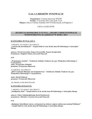 GALA LIDERÓW INNOWACJI Organizator: Centrum Innowacji WKTiR Termin: 23 kwietnia 2013 roku godz.12:oo Miejsce: Sala nr 4 Domu Technika NOT W Katowicach, ul.Podgórna 4 LISTA LAUREATÓW III EDYCJA KONKURSU O TYTUŁ: „MŁODY LIDER INNOWACJI WOJEWÓDZTWA ŚLĄSKIEGO”W ROKU 2013 KATEGORIA WYNALAZCA I MIEJSCE EX AEQUO DLA PRACY: „Latarka dla niewidomych” – Zespół Szkól nr 6 im. Króla Jana III Sobieskiego w JastrzębiuZdroju autorzy: Paweł Górzyński, Tomasz Krzysztofik, Tomasz Kropiwnicki Promotorzy: Zbigniew Pałasz, Krzysztof Smyczek oraz „Wspomagacz uścisku” - Techniczne Zakłady Naukowe im. gen. Władysława Sikorskiego w Częstochowie; autor: Przemysław Wolnicki promotor: Przemysław Błaszczyk II. MIEJSCE DLA PRACY: „RPI Urządzenie filtrujące sieć komputerową” - Techniczne Zakłady Naukowe im. gen. Władysława Sikorskiego w Częstochowie; autor: Dawid Sobieraj promotor: Przemysław Błaszczyk III. MIEJSCA NIE PRZYZNANO KATEGORIA DYDAKTYK I MIEJSCE EX AEQUO DLA PRACY: „Inteligentny dom” - Zespół Szkól nr 6 im. Króla Jana III Sobieskiego w Jastrzębiu-Zdroju autorzy: Oskar Schimmelpfennig, Karol Kucharczyk promotorzy: Mirosław Czarnota, Krzysztof Smyczek oraz „Budujemy klasyfikator ziaren, czyli pomysł na ciekawe zajęcia realizowane metodą WebQuest” – Zespół Szkól nr 6 im. Króla Jana III Sobieskiego w Jastrzębiu-Zdroju; – 2- autorzy: Paulina Grzywacz, Roksana Kula promotor: Jolanta Przygodzka II MIEJSCA NIE PRZYZNANO. III MIEJSCE DLA PRACY: „Model dydaktyczny instalacji TV w domu jednorodzinnym” - Techniczne Zakłady Naukowe, Dąbrowa Górnicza autorzy: Daniel Maciejczyk, Michał Wendel promotor: Bartłomiej Lis KATEGORIA KONSTRUKTOR - ELEKTRONIK I MIEJSCE EX AEQUO DLA PRACY: „AVR – WEBRADIO – mikroprocesorowe radio internetowe” – Zespół Szkół Ponadgimnazjalnych nr 6 im. Mikołaja Kopernika w Rudzie Śląskiej autor: Piotr Hoszek promotor: Krzysztof Tułaj oraz „Prototyp robota umożliwiającego testowanie algorytmów mapowania opartych o sztuczną inteligencję w zastosowaniu w autonomicznych samochodach” – Zespół Szkół Technicznych w Rybniku autor: Dawid Harazim promotor: Michał Tokarz II MIEJSCE DLA PRACY: „Stereofoniczny wzmacniacz lampowy” - Techniczne Zakłady Naukowe, Dąbrowa Górnicza; autor: Paweł Leszczyński promotor: Grzegorz Miciak III MIEJSCA NIE PRZYZNANO. KATEGORIA PROGRAMISTA I MIEJSCE DLA PRACY: „In Case Of Emergency ICE Aplikacja na system Android” – Techniczne Zakłady Naukowe im. gen. Władysława Sikorskiego w Częstochowie, Technikum nr 5; autor: Arkadiusz Kożuch promotor: Przemysław Błaszczyk II MIEJSCE DLA PRACY: „Pragmatic – gra edukacyjna ucząca algorytmiki i programowania” – Zespół Szkół nr 6 im. Króla Jana III Sobieskiego w Jastrzębiu-Zdroju; autorzy: Iwona Witek, Paweł Radzimierski promotor: Marcin Lasak -3III MIEJSCE DLA PRACY: „QuickDiag – program diagnostyczny” – Zepół Szkół Budowlano-Informatycznych im. Mikołaja Kopernika w Żorach; autorzy: Daniel Baczkowski, Jakub Stępień promotor: Juliusz Kobylanka KATEGORIA EKOLOG I MIEJSCE DLA PRACY: „Analiza mikroskopowa osadu czynnego. Wyznaczanie Indeksu Biotycznego Maddoniego” – Centrum Kształcenia Praktycznego w Jastrzębiu-Zdroju; autorzy: Dominik Koniarski, Samuel Miśkiewicz promotor: Jolanta Przygodzka II MIEJSCE EX AEQUO DLA PRACY: „Badanie jakości wody Szotkówki na podstawie składu peryfitonu” – Zespół Szkól nr 6 im. Króla Jana III Sobieskiego w Jastrzębiu-Zdroju autor: Katarzyna Siekaczyńska promotor: Łucja Klebeko oraz „Preferencje gniazdowe sroki Pica pica w Jastrzębiu-Zdroju. Tendencje w latach 2003-2012” – Zespół Szkól nr 6 im. Króla Jana III Sobieskiego w Jastrzębiu-Zdroju; autor: Natalia Jurkowska promotor: Łucja Klebeko III MIEJSCE EX AEQUO DLA PRACY: „Skuteczność procesu filtracji” – Zespół Szkół Zawodowych, Wodzisław Śląski; autorzy: Justyna Malich, Ilona Wodecka promotor: Grażyna Włoch oraz „Identyfikacja bakterii nitkowatych w osadzie czynnym oraz ocena ich wpływu na jakość sedymentacji osadu i efekty oczyszczania ścieków” – Centrum Kształcenia Praktycznego w Jastrzębiu-Zdroju; autorzy: Edyta Tokarska, Bartosz Wacławik; promotor: Jolanta Przygodzka GRAND PRIX KONKURSU DLA PRACY: „Bezzałogowy statek latający – BZYK” - Techniczne Zakłady Naukowe im. gen. Władysława Sikorskiego w Częstochowie; autorzy: Daniel Kwasek, Tomasz Wójcik, Łukasz Grajcar Promotor: Robert Bąbka -4XII OGÓLOPOLSKI KONKURS„LIDER INNOWACJI WIOSENNA 2013” – EDYCJA „LIDER INNOWACJI 2013” TYTUŁ I STATUETKĘ „LIDER INNOWACJI 2013”PRZYZNANO: Głównemu Instytutowi Górnictwa w Katowicach za rozwiązanie pt. Przyrząd do pomiaru skrawalności węgla i skał, Innowacyjnemu Przedsiębiorstwu Wielobranżowemu POLIN sp. z.o.o. w Katowicach za nową niskoemisyjną technologię polin chronioną sześcioma wynalazkami, Bartoszowi Walentynowi z Okola za rozwiązanie pt. akumulatorowa pastowarko – polerowarka do obuwia, Firmie TRANS PROJECT Rybicki Spółka Jawna w Mikołowie za wynalazek pt. sposób obróbki zakończeń wałków osi krążników przenośników taśmowych i krążownik przenośnika taśmowego. „SUPERLIDER INNOWACJI 2013 TYTUŁ I STATUETKĘ „SUPERLIDER INNOWACJI 2013” PRZYZNANO: Uniwersytetowi Śląskiemu w Katowicach za wybitne osiągnięcia i sukcesy w działalności innowacyjnej. ZŁOTA HONOROWA ODZNAKA WKTiR HONOROWĄ ZŁOTĄ ODZNAKĘ WKTiR PRZYZNANO: Adamowi Świerczyńskiemu za pracę pt.”Projekty i działalność innowacyjna kierowana do różnych grup społecznych Centrum Innowacji w Katowicach.” ZŁOTĄ HONOROWĄ ODZNAKĘ 40-LECIA WKTiR PRZYZNANO: Mariuszowi Grzesiczakowi - członkowi Zarządu CI WKTiR za zasługi i zaangażowanie na rzecz rozwoju oraz dorobku Stowarzyszenia w okresie 40 – lecia jego działalności Tadeuszowi Kopniakowi – członkowi Zarządu CI WKTiR za zasłu