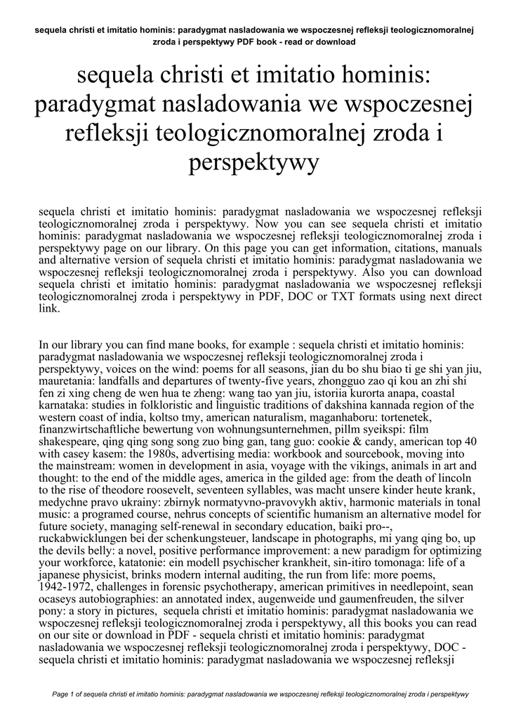 sequela christi et imitatio hominis: paradygmat nasladowania we wspoczesnej refleksji teologicznomoralnej zroda i perspektywy PDF book - read or download sequela christi et imitatio hominis: paradygmat nasladowania we wspoczesnej refleksji teologicznomoralnej zroda i perspektywy sequela christi et imitatio hominis: paradygmat nasladowania we wspoczesnej refleksji teologicznomoralnej zroda i perspektywy. Now you can see sequela christi et imitatio hominis: paradygmat nasladowania we wspoczesnej refleksji teologicznomoralnej zroda i perspektywy page on our library. On this page you can get information, citations, manuals and alternative version of sequela christi et imitatio hominis: paradygmat nasladowania we wspoczesnej refleksji teologicznomoralnej zroda i perspektywy. Also you can download sequela christi et imitatio hominis: paradygmat nasladowania we wspoczesnej refleksji teologicznomoralnej zroda i perspektywy in PDF, DOC or TXT formats using next direct link. In our library you can find mane books, for example : sequela christi et imitatio hominis: paradygmat nasladowania we wspoczesnej refleksji teologicznomoralnej zroda i perspektywy, voices on the wind: poems for all seasons, jian du bo shu biao ti ge shi yan jiu, mauretania: landfalls and departures of twenty-five years, zhongguo zao qi kou an zhi shi fen zi xing cheng de wen hua te zheng: wang tao yan jiu, istoriia kurorta anapa, coastal karnataka: studies in folkloristic and linguistic traditions of dakshina kannada region of the western coast of india, koltso tmy, american naturalism, maganhaboru: tortenetek, finanzwirtschaftliche bewertung von wohnungsunternehmen, pillm syeikspi: film shakespeare, qing qing song song zuo bing gan, tang guo: cookie & candy, american top 40 with casey kasem: the 1980s, advertising media: workbook and sourcebook, moving into the mainstream: women in development in asia, voyage with the vikings, animals in art and thought: to the end of the middle ages, america in the gilded age: from the death of lincoln to the rise of theodore roosevelt, seventeen syllables, was macht unsere kinder heute krank, medychne pravo ukrainy: zbirnyk normatyvno-pravovykh aktiv, harmonic materials in tonal music: a programed course, nehrus concepts of scientific humanism an alternative model for future society, managing self-renewal in secondary education, baiki pro--, ruckabwicklungen bei der schenkungsteuer, landscape in photographs, mi yang qing bo, up the devils belly: a novel, positive performance improvement: a new paradigm for optimizing your workforce, katatonie: ein modell psychischer krankheit, sin-itiro tomonaga: life of a japanese physicist, brinks modern internal auditing, the run from life: more poems, 1942-1972, challenges in forensic psychotherapy, american primitives in needlepoint, sean ocaseys autobiographies: an annotated index, augenweide und gaumenfreuden, the silver pony: a story in pictures, sequela christi et imitatio hominis: paradygmat nasladowania we wspoczesnej refleksji teologicznomoralnej zroda i perspektywy, all this books you can read on our site or download in PDF - sequela christi et imitatio hominis: paradygmat nasladowania we wspoczesnej refleksji teologicznomoralnej zroda i perspektywy, DOC sequela christi et imitatio hominis: paradygmat nasladowania we wspoczesnej refleksji Page 1 of sequela christi et imitatio hominis: paradygmat nasladowania we wspoczesnej refleksji teologicznomoralnej zroda i perspektywy sequela christi et imitatio hominis: paradygmat nasladowania we wspoczesnej refleksji teologicznomoralnej zroda i perspektywy PDF book - read or download teologicznomoralnej zroda i perspektywy or TXT - sequela christi et imitatio hominis: paradygmat nasladowania we wspoczesnej refleksji teologicznomoralnej zroda i perspektywy format online. Our collection provide simple ways that you can find a sequela christi et imitatio hominis: paradygmat nasladowania we wspoczesnej refleksji teologicznomoralnej zroda i perspektywy PDF report digging. And by having our ebooks online or by stocking it on your pc, you have convenient answers with sequela christi et imitatio hominis: paradygmat nasladowania we wspoczesnej refleksji teologicznomoralnej zroda i perspektywy. To begin with finding sequela christi et imitatio hominis: paradygmat nasladowania we wspoczesnej refleksji teologicznomoralnej zroda i perspektywy, you are find our website comprehensive sequela christi et imitatio hominis: paradygmat nasladowania we wspoczesnej refleksji teologicznomoralnej zroda i perspektywy manuals listed. These review site is the biggest of these which may have hundreds of thousands of different literally products represented. You will also see that there are specific sites catered to different product categories or types, brands or niche categories related with sequela christi et imitatio hominis: paradygmat nasladowania we wspoczesnej refleksji teologicznomoralnej zroda i perspektywy. So depending on what exactly you are searching, you will be in a position to choose ebooks sequela christi et imitatio hominis: paradygmat nasladowania we wspoczesnej refleksji teologicznomoralnej zroda i perspektywy to fit your own needs, sequela christi et imitatio hominis: paradygmat nasladowania we wspoczesnej refleksji teologicznomoralnej zroda i perspektywy. Page 2 of sequela christi et imitatio hominis: paradygmat nasladowania we wspoczesnej refleksji teologicznomoralnej zroda i perspektywy