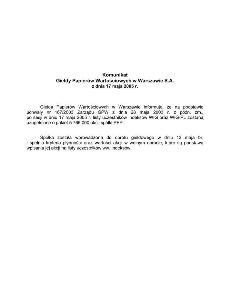 Komunikat Giełdy Papierów Wartościowych w Warszawie S.A. z dnia 17 maja 2005 r. Giełda Papierów Wartościowych w Warszawie informuje, że na podstawie uchwały nr 167/2003 Zarządu GPW z dnia 28 maja 2003 r. z późn. zm., po sesji w dniu 17 maja 2005 r. listy uczestników indeksów WIG oraz WIG-PL zostaną uzupełnione o pakiet 5 766 000 akcji spółki PEP. Spółka została wprowadzona do obrotu giełdowego w dniu 13 maja br. i spełnia kryteria płynności oraz wartości akcji w wolnym obrocie, które są podstawą wpisania jej akcji na listy uczestników ww. indeksów.