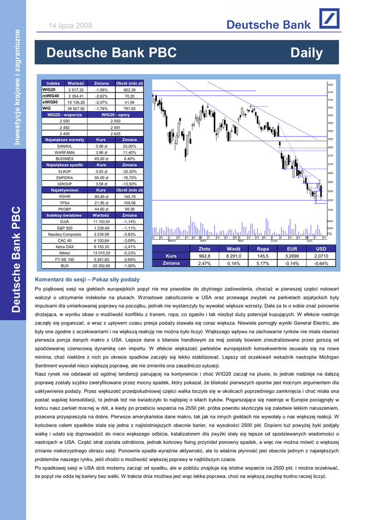 Inwestycje krajowe i zagraniczne Deutsche Bank PBC 14 lipca 2008 Deutsche Bank PBC Zmiana Obrót (mln z ) WIG20 Indeks Warto 2 517,32 -1,58% 662,38 mWIG40 2 354,41 -2,62% 70,20 sWIG80 10 136,28 -2,07% 41,94 WIG 38 927,92 -1,78% 797,83 Daily 3200 3150 3100 3050 WIG20 - wsparcia WIG20 - opory 3000 2 500 2 550 2950 2 482 2 591 2 450 2 625 2900 Najwi ksze wzrosty Kurs Zmiana 2850 SANWIL 0,06 z 20,00% 2800 WARFAMA 3,90 z 11,40% BUDIMEX 65,00 z 6,40% Najwi ksze spadki Kurs Zmiana ELKOP 0,02 z -33,30% EMPERIA 95,00 z -16,70% IGROUP 3,58 z -13,50% Najaktywniesi Kurs Obrót (mln z ) KGHM 99,40 z 140,79 TPSA 21,95 z 109,08 44,60 z PKOBP Indeksy wiatowe 2750 2700 2650 2600 2550 2500 99,38 Warto Zmiana 2450 DJIA 11 100,54 -1,14% 15000 S&P 500 1 239,49 -1,11% 10000 Nasdaq Composite 2 239,08 -0,83% CAC 40 4 100,64 -3,09% Xetra DAX 6 153,30 -2,41% Nikkei 13 010,20 -0,23% FT-SE 100 5 261,60 -2,69% BUX 20 352,60 -1,00% x100 18 25 3 10 March 17 25 31 7 April 14 oto Kurs Zmiana 21 28 5 May 12 19 26 2 June 9 16 23 30 7 July 14 Mied Ropa EUR USD 962,8 8 291,0 145,5 3,2690 2,0710 2,47% 0,14% 5,17% -0,14% -0,64% Komentarz do sesji – Pokaz si y poda y Po pi tkowej sesji na gie dach europejskich popyt nie ma powodów do zbytniego zadowolenia, chocia w pierwszej cz ci notowa walczy o utrzymanie indeksów na plusach. Wzrostowe zako czenie w USA oraz przewaga zwy ek na parkietach azjatyckich by y impulsami dla umiarkowanej poprawy na pocz tku, jednak nie wystarczy y by wywo dro ej ca, w wyniku obaw o mo liwo wi ksze wzrosty. Da a za to o sobie zna ponownie konfliktu z Iranem, ropa, co zgasi o i tak niezbyt du y potencja kupuj cych. W efekcie nastroje zacz y si pogarsza , a wraz z up ywem czasu presja poda y stawa a si coraz wi ksza. Niewiele pomog y wyniki General Electric, ale by y one zgodne z oczekiwaniami i na wi ksz reakcj nie mo na by o liczy . Wi kszego wp ywu na zachowanie rynków nie mia a równie pierwsza porcja danych makro z USA. Lepsze dane o bilansie handlowym za maj zosta y bowiem zneutralizowane przez gorsz spodziewanej czerwcow dynamik cen importu. W efekcie wi kszo minima, cho niektóre z nich po okresie spadków zacz y si Sentiment wywo parkietów europejskich konsekwentnie osuwa a si lekko stabilizowa . Lepszy od oczekiwa od na nowe wska nik nastrojów Michigan nieco wi ksz popraw , ale nie zmieni a ona zasadniczo sytuacji. Nasz rynek nie odstawa od ogólnej tendencji panuj cej na kontynencie i cho WIG20 zacz popraw zosta y szybko zweryfikowane przez mocny spadek, który pokaza , e blisko uaktywnienia poda y. Przez wi kszo przedpo udniowej cz na plusie, to jednak nadzieje na dalsz pierwszych oporów jest mocnym argumentem dla ci walka toczy a si w okolicach poprzedniego zamkni cia i cho mia a ona posta w skiej konsolidacji, to jednak te nie wiadczy o to najlepiej o si ach byków. Pogarszaj ce si nastroje w Europie poci gn y w ko cu nasz parkiet mocnej w dó , a kiedy po przebiciu wsparcia na 2550 pkt. próba powrotu sko czy a si zaledwie lekkim naruszeniem, przecena przyspieszy a na dobre. Pierwsze ameryka skie dane makro, tak jak na innych gie dach nie wywo y u nas wi kszej reakcji. W ko cówce celem spadków sta a si jedna z najistotniejszych obecnie barier, na wysoko ci 2500 pkt. Dopiero tu powy ej byki podj y walk i uda o si doprowadzi do nieco wi kszego odbicia, katalizatorem dla zwy ki sta y si lepsze od spodziewanych wiadomo ci o nastrojach w USA. Cz strat zosta a odrobiona, jednak ko cowy fixing przyniós ponowny spadek, a wi c nie mo na mówi o wi kszej zmianie niekorzystnego obrazu sesji. Ponownie spad a wyra nie aktywno , ale to w problemów naszego rynku, je li chodzi o mo liwo Po spadkowej sesji w USA dzi mo emy zacz nie p ynno jest obecnie jednym z najwi kszych wi kszej poprawy w najbli szym czasie. od spadku, ale w pobli u znajduje si istotne wsparcie na 2500 pkt. i mo na oczekiwa , e popyt nie odda tej bariery bez walki. W trakcie dnia mo liwa jest wi c lekka poprawa, cho na wi ksz zwy trudno raczej liczy . Informacje ze spó ek ELSTAR OILS Close: 4,15 z Change: - 1,19% Przychody ze sprzeda y Elstar Oils w miesi cu czerwcu 2008 roku w zakresie podstawowej dzia alno ci wynios y 48,3 mln z . Narastaj co przychody w roku 2008 za okres stycze -czerwiec wynosz 242,3 mln z . W kwocie tej nie s zawarte przychody ze sprzeda y rzepaku. DB PBC Wiadomo lekko pozytywna. Przychody spó ki s wi ksze ni w poprzednim miesi cu. Drugi kwarta jest jednym z lepszych okresów dla prowadzonej dzia alno ci. Informacja mo e lekko p yn na dzisiejsze zachowanie kursu, ale nie nale y raczej oczekiwa z tego powodu wi kszej zwy ki kursu. WOJAS Close: 4,53 z Change: - 8,11% Konsorcjum z udzia em Wojas podpisa o umow z Ministrem Obrony Narodowej w imieniu którego dzia a Agencja Mienia Wojskowego, której przedmiotem jest dostawa trzewików, z terminem realizacji w 2008 roku. Warto umowy w cz ci realizowanej przez Wojas wynosi 2 719 863,12 z . DB PBC Informacja lekko pozytywna. Warto kontraktu przypadaj ca na Wojasa stanowi ponad 7 proc. przychodów osi gni tych w ubieg ym roku i cho trudno raczej oczekiwa , e b dzie to wysokomar owy kontrakt, to jednak wp yw na tegoroczne wyniki powinien by zauwa alny. Wiadomo mo e mie prze enie na dzisiejsze zachowanie kursu. HYDROBUDOWA POLSKA Close: 7,20 z Change: - 4,00% Fundusze zarz dzane przez ING TFI w wyniku zbycia akcji Hydrobudowy Polska zmniejszy y zaanga owanie w spó ce poni ej progu 10% ogólnej liczby g osów. Przed zmian udzia u fundusze posiada y ogólnej liczby g osów. Obecnie fundusze posiadaj cznie 17 382 900 szt. akcji, co stanowi o 10,01% kapita u zak adowego i cznie 17 282 900 szt. akcji spó ki, co stanowi 9,95% kapita u zak adowego i ogólnej liczby g osów na WZA. DB PBC Informacja lekko negatywna, cho nie wywo a raczej wi kszej zmiany kursu na dzisiejszej sesji. Fundusze nadal pozostaj bowiem jednym z du ych akcjonariuszy spó ki, a ponadto redukcj udzia u o 0,6 proc. trudno uzna za znacz . Podobna mo e okaza si tak e dzisiejsza reakcja rynku. P