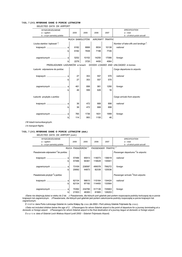 TABL. 7 (243). WYBRANE DANE O PORCIE LOTNICZYM SELECTED DATA ON AIRPORT WYSZCZEGÓLNIENIE a – ogółem b – w tym samoloty polskie 2000 2005 2006 RUCH SAMOLOTÓW SPECIFICATION a – total b – of which polish aircraft 2007 AIRCRAFT TRAFFIC 1 Number of take-offs and landings 1: Liczba startów i lądowań : krajowych ....................................a 6182 8888 8934 10138 b 6182 7838 7198 7726 zagranicznych .............................a 5252 10152 14250 17086 b 2278 3720 4450 4064 PRZEŁADUNEK ŁADUNKÓW w tonach national foreign GOODS LOADED AND UNLOADED in tonnes Ładunki odprawione do portów: Cargo departures to airports: krajowych ....................................a 27 353 557 570 b 27 353 557 570 zagranicznych .............................a 461 898 981 1290 b 46 599 628 16 Ładunki przybyłe z portów: national foreign Cargo arrivals from airports: krajowych ....................................a 36 472 668 898 b 36 472 668 898 zagranicznych .............................a 765 1736 1831 1999 b 114 993 1150 46 national foreign 1 W lotach komunikacyjnych. 1 In transport flights. TABL. 7 (243). WYBRANE DANE O PORCIE LOTNICZYM (dok.) SELECTED DATA ON AIRPORT (cont.) WYSZCZEGÓLNIENIE a – ogółem b – w tym samoloty polskie 2000 2005 RUCH PASAśERÓW 1 2006 SPECIFICATION a – total b – of which polish aircraft 2007 PASSENGER TRAFFIC 1 2 Passenger departures 2 to airports: PasaŜerowie odprawieni do portów: krajowych ....................................a b 57496 57496 95913 94361 118073 116629 136619 135941 national zagranicznych .............................a b 73109 20692 238587 44873 499378 82338 706272 125536 foreign PasaŜerowie przybyli 3 z portów: Passenger arrivals 3 from airports: krajowych ....................................a b 62134 62134 98613 97192 115164 114493 134424 133564 national zagranicznych .............................a b 70392 21503 234780 46383 517138 81865 725663 128203 foreign 1 Dane nie obejmują dzieci w wieku do 2 lat. 2 PasaŜerowie, dla których port gdański jest portem rozpoczęcia podróŜy kończącej się w porcie krajowym lub zagranicznym. 3 PasaŜerowie, dla których port gdański jest portem zakończenia podróŜy rozpoczętej w porcie krajowym lub zagranicznym. Ź r ó d ł o: dane Portu Lotniczego Gdańsk im. Lecha Wałęsy Sp. z o.o. (do 2002 r. Port Lotniczy Gdańsk-Trójmiasto Sp. z o.o.). 1 Data not included children below the age of 2. 2 Passengers for whom Gdańsk airport is the point of departure for a journey terminating at a domestic or foreign airport. 3 Passengers for whom Gdańsk airport is the final destination of a journey begun at domestic or foreign airport. S o u r c e: data of Gdańsk Lech Walesa Airport (until 2002 – Gdańsk-Trójmiasto Airport).