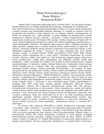 Panie Przewodniczący ! Panie Wójcie ! Szanowna Rado ! Zespół Szkół w Korycinie funkcjonuje od 01 września 2002 r. W jego skład wchodzą: Szkoła Podstawowa im. Stefana Kardynała Wyszyńskiego, Gimnazjum im. „Solidarności”. Przy Szkole Podstawowej i Gimnazjum funkcjonuje świetlica. Po sześciu latach użytkowania remontu wymaga część gimnazjalna budynku szkolnego, ze względu na strukturę ścian na korytarzach nie jesteśmy w stanie odnowić ich we własnym zakresie. Systematycznie od dwóch lat odnawiana jest część budynku, w której znajdują się klasopracownie szkoły podstawowej. Podczas przerwy zimowej z inicjatywy i dzięki zaangażowaniu rodziców odmalowana została sala nr 30 (II piętro SP), korytarz i klatka schodowa na II piętrze SP. W czasie wakacji odmalowano korytarz na I piętrze SP. Podczas kapitalnego remontu szkoły w części gimnazjalnej i klasach I- III założono rolety pionowe, które w budynku szkolnym nie zdają egzaminu, spadają same w wyniku działania słońca, próbowaliśmy je naprawiać, ale niestety z mizernym skutkiem. Rolety pionowe wymieniane są na tradycyjne żaluzje, w tych działaniach wspierają nas rodzice i sponsorzy. W ciągu ostatniego roku nowe żaluzje założone zostały w czterech klasach. Dzięki przychylności Pana Wójta, Rady Gminy stopniowo szkoła wyposażana jest w nowe ławki i krzesełka dostosowane do wzrostu uczniów. Kupione zostały nowe meble do 2 klas kształcenia zintegrowanego, jednej klasy szkoły podstawowej i jednej klasy gimnazjalnej oraz biblioteki szkolnej (stoliki pod komputery, stoliki i krzesełka do czytelni, nowe krzesła do klas komputerowych i pokoju nauczycielskiego). Z inicjatywy księdza Adama Bułatewicza i Samorządu Uczniowskiego Szkoły Podstawowej we wrześniu 2008 roku rozpoczęliśmy działania zmierzające do utworzenia Kącika Patrona- Stefana Kardynała Wyszyńskiego i sali patrona. W prace zaangażowała się cała społeczność szkolna, rodzice, lokalni przedsiębiorcy. Dzięki hojności sponsorów kącik Naszego Patrona został uroczyście poświęcony podczas Święta Szkoły. Informacje o patronie Gimnazjum – NSZZS Solidarność i osobach z nim związanych zostały zebrane i wyeksponowane w gablotach na korytarzu. Patroni obu szkół są ściśle ze sobą związani, dlatego rada pedagogiczna postanowiła podjąć uchwałę o wspólnych obchodach święta Zespołu Szkół w Korycinie w dniu odzyskania przez Polskę niepodległości-11 listopada. Rok 2009 został przez naszego patrona- Solidarność ogłoszony Rokiem Niepodległości. Podczas ferii zimowych odremontowane zostały dwie sale lekcyjne: klasopracownia przeznaczona na salę patrona i klasa matematyczna, remont sali patrona wsparli rodzice uczniów szkoły podstawowej, na remont sali matematycznej środki udało się pozyskać z PZU. Konieczny jest remont kolejnych dwóch sal lekcyjnych: malowanie oraz wymiana wykładziny, która jest użytkowana od 20 lat ( nie była wymieniana podczas kapitalnego remontu). Podczas przerwy rekolekcyjnej odmalowaliśmy korytarz przy głównym wejściu do szkoły, wszystkie te prace remontowe to tylko koszt materiałów. W okresie wakacji rozszerzony został monitoring, zainstalowano kamery w szatniach SP i gimnazjum. W nowym roku szkolnym 2007/2008 w Szkole Podstawowej rozpoczęło naukę 231uczniów, z tego w klasach I – 33 uczniów. W Gimnazjum naukę rozpoczęło 123 uczniów z tego w klasach I – 45 uczniów. W każdym roczniku w obu szkołach są po dwa oddziały. Chcę raz jeszcze podziękować Panu Wójtowi, Panu Przewodniczącemu i Radzie Gminy za pozostawienie dwóch klas II-gich gimnazjum. Uczniowie w tych klasach wymagają indywidualizacji procesu nauczania, ciągłego motywowania do pracy. Byłoby to bardzo trudne w klasie 33 osobowej. W Zespole Szkół pracuje 34 nauczycieli, jeden przebywa na urlopie macierzyńskim. Wszyscy nauczyciele zatrudnieni są w Zespole Szkół w Korycinie. 1 Zajęcia dydaktyczne odbywają się zgodnie z zatwierdzonym arkuszem organizacyjnym szkoły. Zmianowość w szkole wynosi 1,00. Plan lekcji jest ułożony zgodnie z zasadami pracy umysłowej. Szkoła rytmicznie realizuje swój harmonogram pracy. Oddziały klas IV – VI Szkoły Podstawowej i I – III Gimnazjum są dzielone na grupy z informatyki, języka angielskiego i wychowania fizycznego zgodnie z obowiązującymi przepisami. Dwoje uczniów zgodnie z orzeczeniem PPP w Sokółce realizuje nauczanie indywidualne. Dzięki uprzejmości Pana Wójta Zespół Szkół ma dodatkowo 12 godzin dydaktycznych, które przeznaczone są na naukę nadobowiązkowych języków obcych: w szkole podstawowej języka rosyjskiego, w gimnazjum języka rosyjskiego i języka niemieckiego. W szkole funkcjonuje świetlica i biblioteka szkolna, w których mogą przebywać wszyscy uczniowie oczekujący na lekcje lub odjazd do domu. W tym roku szkolnym w Zespole Szkół w Korycinie zatrudniony został w wymiarze ½ etatu pedagog szkolny, prowadzone są również zajęcia logopedyczne w wymiarze 4 godzin. Wskazane było by zatrudnienie pedagoga w pełnym wymiarze czasu pracy od nowego roku szkolnego. Wychowawca sam nie jest w stanie rozwiązać wszystkich problemów, rodzice powinni być od razu w danej chwili informowani o tym, co dzieje się z dzieckiem. Pedagog nie ma godzin dydaktycznych może więc poświęcać swój czas pracy na analizę trudnych spraw, rozmowy z uczniami i rodzicami. Obecnie zatrudniona Pani Pedagog ma bardzo dobry kontakt z młodzieżą, „najtrudniejszych” gimnazjalistów zaangażowała w prace koła teatralnego: uczestniczyli w projekcie zorganizowanym przez KO w Białymstoku „Dramat i tragedię pozostaw teatrowi”, pełni funkcję kuratora społecznego nieletnich, współpracuje z Sądem Rodzinnym w Sokółce, obecnie podnosi kwalifikacje na studiach podyplomowych w zakresie resocjalizacji. Duża grupa uczniów w szkole podstawowej i gimnazjum wymaga wsparcia specjalistó