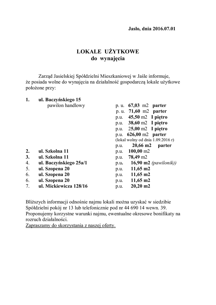 Jasło, dnia 2016.07.01 LOKALE UŻYTKOWE do wynajęcia Zarząd Jasielskiej Spółdzielni Mieszkaniowej w Jaśle informuje, że posiada wolne do wynajęcia na działalność gospodarczą lokale użytkowe położone przy: 1. ul. Baczyńskiego 15 pawilon handlowy p. u. p. u. p.u. p.u. p.u. p.u. 67,03 m2 71,60 m2 45,50 m2 38,60 m2 25,00 m2 626,00 m2 parter parter I piętro I piętro I piętro parter (lokal wolny od dnia 1.09.2016 r) 2. 3. 4. 5. 6. 6. 7. ul. Szkolna 11 ul. Szkolna 11 ul. Baczyńskiego 25a/1 ul. Szopena 20 ul. Szopena 20 ul. Szopena 20 ul. Mickiewicza 128/16 p.u. p.u. p.u. p.u. p.u. p.u. p.u. p.u. 20,66 m2 parter 100,00 m2 78,49 m2 16,90 m2 (pawilonik)) 11,65 m2 11,65 m2 11,65 m2 20,20 m2 Bliższych informacji odnośnie najmu lokali można uzyskać w siedzibie Spółdzielni pokój nr 13 lub telefonicznie pod nr 44 690 14 wewn. 39. Proponujemy korzystne warunki najmu, ewentualne okresowe bonifikaty na rozruch działalności. Zapraszamy do skorzystania z naszej oferty.