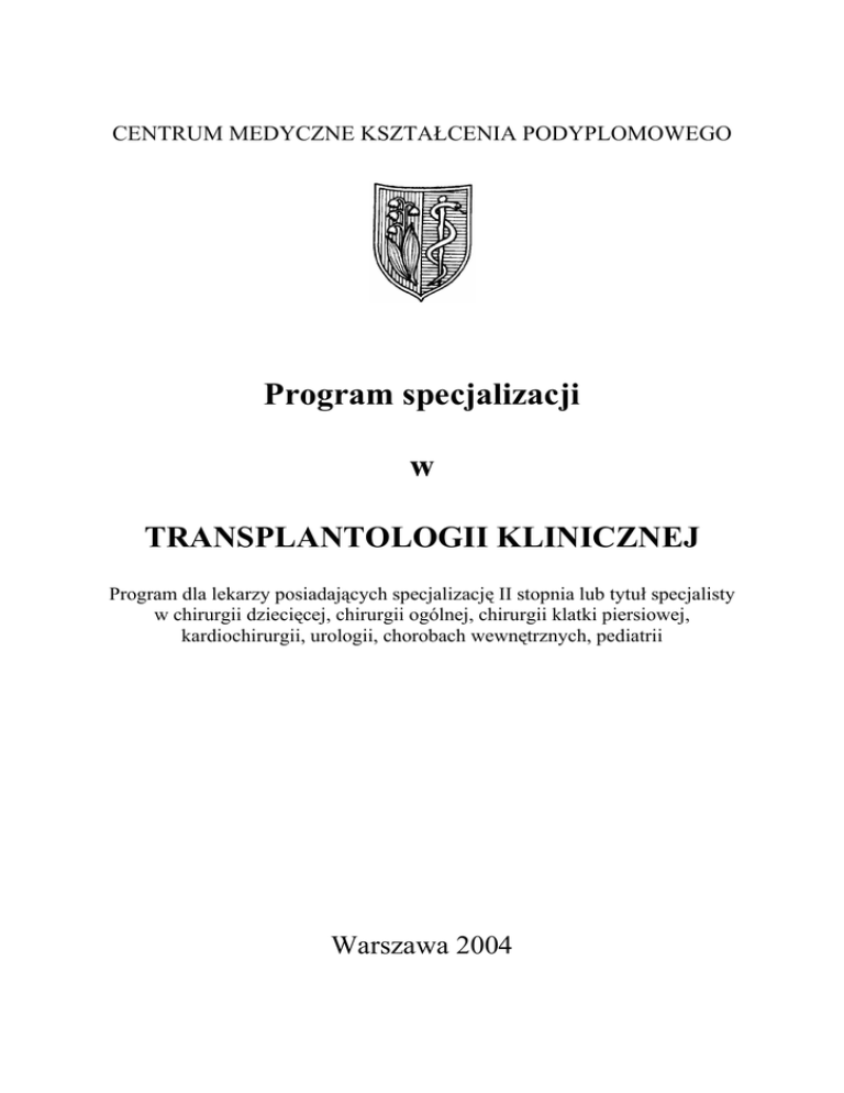 CENTRUM MEDYCZNE KSZTAŁCENIA PODYPLOMOWEGO Program specjalizacji w TRANSPLANTOLOGII KLINICZNEJ Program dla lekarzy posiadających specjalizację II stopnia lub tytuł specjalisty w chirurgii dziecięcej, chirurgii ogólnej, chirurgii klatki piersiowej, kardiochirurgii, urologii, chorobach wewnętrznych, pediatrii Warszawa 2004 Program specjalizacji w transplantologii klinicznej Program specjalizacji przygotował zespół ekspertów Prof. dr hab. med. Wojciech Rowiński – konsultant krajowy Prof. dr hab. med. Mieczysław Lao – przedstawiciel konsultanta krajowego Prof. dr hab. med. Janusz Wałaszewski – przedstawiciel konsultanta krajowego Prof. dr hab. med. Jerzy Hołowiecki – Polskie Towarzystwo Hematologiczne Dr med. Bartłomiej Noszczyk – przedstawiciel CMKP Dr .med. Krzysztof Madej – Przedstawiciel Naczelnej Rady Lekarskiej 1 - Cele studiów specjalizacyjnych Cele edukacyjne W transplantologii klinicznej mogą się specjalizować lekarze wybranych specjalności zabiegowych i zachowawczych. Program specjalizacji został tak przygotowany, aby lekarz posiadł odpowiedni zasób wiedzy oraz umiejętności praktycznych związanych z jego podstawową specjalizacją, pozwalających w przypadku lekarzy zabiegowych, na przeprowadzanie odpowiedniego rodzaju przeszczepów a w przypadku lekarzy zachowawczych, na prowadzenie chorych przed i po transplantacji. Mimo, że kardiochirurg nie będzie przeszczepiał wątroby, a chirurg dziecięcy lub chirurg ogólny serca, to jednak Zespół Ekspertów uznał, że w programie specjalizacji powinno się znaleźć miejsce na odbycie odpowiednich staży, które pozwolą specjalizującym się lekarzom na zaznajomienie się ze specyfiką przeszczepiania innych narządów. Oddzielną grupę specjalizujących się stanowią lekarze przeprowadzający przeszczepianie szpiku i/lub komórek macierzystych. Z uwagi na oczywiste różnice w zakresie wymaganej wiedzy i w zakresie wymaganych umiejętności praktycznych program specjalizacji dla tej grupy lekarzy przedstawiono jako oddzielny wariant. Uzyskane kompetencje Po ukończeniu studiów specjalizacyjnych lekarz uzyska szczególne kwalifikacje pozwalające na samodzielne pobieranie i przeszczepianie narządów, oraz leczenie chorych w bezpośrednim i odległym okresie po przeszczepieniu narządu, lub w odniesieniu do szpiku - odpowiednie umiejętności praktyczne w pobieraniu i przeszczepianiu szpiku oraz opiece nad chorymi po zabiegu. Ponadto lekarz uprawniony będzie do: • specjalistycznego orzekania o potrzebie rehabilitacji leczniczej, niezdolności do pracy, niezdolności do pracy zarobkowej lub w gospodarstwie rolnym, uszczerbku na zdrowiu oraz niepełnosprawności z powodu rozpoznanych i leczonych chorób, • przygotowywania specjalistycznych opinii, zaświadczeń i wniosków dotyczących leczonych chorych, • udzielania konsultacji lekarskich w dziedzinie transplantologii lekarzom innych specjalności, • prowadzenia promocji zdrowia i zapobiegania chorobom i urazom, • kierowania kliniką, oddziałem transplantologii, • kierowania specjalizacją innych lekarzy w zakresie transplantologii, • doskonalenia zawodowego innych pracowników medycznych, • kierowania eksperymentem medycznym w dziedzinie transplantologii. © CMKP 2004 2 Program specjalizacji w transplantologii klinicznej Wariant A Program specjalizacji dla lekarzy zajmujących się przeszczepianiem narządów Kto może ubiegać się o rozpoczęcie specjalizacji? W transplantologii klinicznej (wariant A) mogą specjalizować się lekarze posiadający specjalizację II stopnia lub tytuł specjalisty w chirurgii dziecięcej, chirurgii ogólnej, chirurgii klatki piersiowej, kardiochirurgii, urologii, chorobach wewnętrznych, pediatrii. 2 - Wymagana wiedza Oczekuje się, że po ukończeniu specjalizacji lekarz wykaże się znajomością przedstawionych poniżej zagadnień. • • • • • • • • • • Odpowiedź odpornościowa na przeszczep allogenny: − opracowanie antygenu i jego prezentacja bezpośrednia i pośrednia, − aktywacja limfocytów, cytokiny, chemokiny, receptory i drogi przenoszenia sygnałów w komórce, − mechanizmy odrzucania przeszczepów, − mechanizm reakcji przeszczep przeciwko gospodarzowi (GvH) i przeciw nowotworowi (GvT, GvL), − specyfika odrzucania poszczególnych narządów: wspólny mechanizm, inna morfologia. Mechanizm działania leków immunosupresyjnych. Wywoływanie stanu tolerancji u biorcy przeszczepu allogennego. Przeszczepy ksenogenne: stan wiedzy i perspektywy. Sytuacja prawna pobierania i przeszczepiania narządów (zgoda wprost/sprzeciw): − prawa jednostki, prawa rodziny, − Polska Ustawa Transplantacyjna i rozporządzenia wykonawcze. Pobieranie narządów od osób zmarłych: − proces od identyfikacji dawcy do pobrania narządu i jego przeszczepienia, − rozpoznanie śmierci pnia mózgu, − przeciwwskazania do pobrania narządu, − zasady utrzymania czynności narządów od śmierci mózgu do pobrania, − pobieranie narządów po zatrzymaniu krążenia. Przeszczepianie narządów od dawców żywych. Niedokrwienne uszkodzenie narządu. Zasady przechowywania narządów. Badanie zgodności tkankowej. Antygeny HLA. Wykonywanie próby krzyżowej. Zabieg przeszczepienia narządu: − wskazania i przeciwwskazana do przeszczepiania narządów unaczynionych: nerki, serce, wątroba, płuco, trzustka, inne narządy, − listy oczekujących, − zasady alokacji narządów, − zabieg przeszczepienia, © CMKP 2004 3 Program specjalizacji w transplantologii klinicznej • • • • • • − zasady opieki w bezpośrednim okresie pooperacyjnym, − immunosupresja kliniczna: leki, indukcja, leczenie podtrzymujące, − rozpoznawanie i leczenie procesu odrzucania, − zakażenia bakteryjne, wirusowe i grzybicze po przeszczepieniu narządu, − przewlekła niewydolność przeszczepu, − powikłania. Wyniki odległe przeszczepienia narządu: − rehabilitacja, − jakość życ