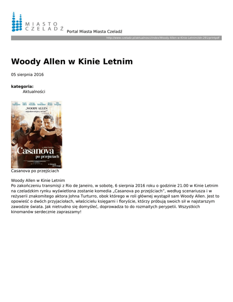 Portal Miasta Miasta Czeladź http://www.czeladz.pl/aktualnosci/index/Woody-Allen-w-Kinie-Letnim/idn:291/printpdf Woody Allen w Kinie Letnim 05 sierpnia 2016 kategoria: Aktualności Casanova po przejściach Woody Allen w Kinie Letnim Po zakończeniu transmisji z Rio de Janeiro, w sobotę, 6 sierpnia 2016 roku o godzinie 21.00 w Kinie Letnim na czeladzkim rynku wyświetlona zostanie komedia „Casanova po przejściach”, według scenariusza i w reżyserii znakomitego aktora Johna Turturro, obok którego w roli głównej wystąpił sam Woody Allen. Jest to opowieść o dwóch przyjaciołach, właścicielu księgarni i floryście, którzy próbują swoich sił w najstarszym zawodzie świata. Jak nietrudno się domyśleć, doprowadza to do rozmaitych perypetii. Wszystkich kinomanów serdecznie zapraszamy!