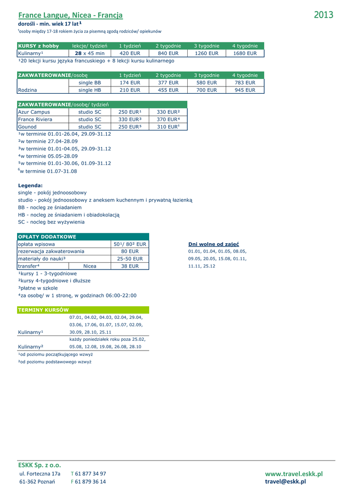 2013 France Langue, Nicea - Francja dorośli - min. wiek 17 lat¹ ¹osoby między 17-18 rokiem życia za pisemną zgodą rodziców/ opiekunów KURSY z hobby Kulinarny¹ lekcje/ tydzień 1 tydzień 2 tygodnie 3 tygodnie 4 tygodnie 28 x 45 min 420 EUR 840 EUR 1260 EUR 1680 EUR 4 tygodnie ¹20 lekcji kursu języka francuskiego + 8 lekcji kursu kulinarnego 1 tydzień 2 tygodnie 3 tygodnie single BB 174 EUR 377 EUR 580 EUR 783 EUR single HB 210 EUR 455 EUR 700 EUR 945 EUR 250 EUR¹ 330 EUR² ZAKWATEROWANIE/osobę Rodzina ZAKWATEROWANIE/osobę/ tydzień Azur Campus studio SC France Riviera studio SC 330 EUR³ 370 EUR Gounod studio SC 250 EUR 310 EUR6 ¹w terminie 01.01-26.04, 29.09-31.12 ²w terminie 27.04-28.09 ³w terminie 01.01-04.05, 29.09-31.12 w terminie 05.05-28.09 w terminie 01.01-30.06, 01.09-31.12 6 w terminie 01.07-31.08 Legenda: single - pokój jednoosobowy studio - pokój jednoosobowy z aneksem kuchennym i prywatną łazienką BB - nocleg ze śniadaniem HB - nocleg ze śniadaniem i obiadokolacją SC - nocleg bez wyŜywienia OPŁATY DODATKOWE opłata wpisowa 50¹/ 80² EUR rezerwacja zakwaterowania materiały do nauki³ transfer Nicea Dni wolne od zajęć 80 EUR 01.01, 01.04, 01.05, 08.05, 25-50 EUR 09.05, 20.05, 15.08, 01.11, 38 EUR 11.11, 25.12 ¹kursy 1 - 3-tygodniowe ²kursy 4-tygodniowe i dłuŜsze ³płatne w szkole za osobę/ w 1 stronę, w godzinach 06:00-22:00 TERMINY KURSÓW 07.01, 04.02, 04.03, 02.04, 29.04, 03.06, 17.06, 01.07, 15.07, 02.09, Kulinarny¹ 30.09, 28.10, 25.11 kaŜdy poniedziałek roku poza 25.02, Kulinarny² 05.08, 12.08, 19.08, 26.08, 28.10 ¹od poziomu początkującego wzwyŜ ²od poziomu podstawowego wzwyŜ ESKK Sp. z o.o. ul. Forteczna 17a 61-362 Poznań T 61 877 34 97 F 61 879 36 14 www.travel.eskk.pl [email protected]