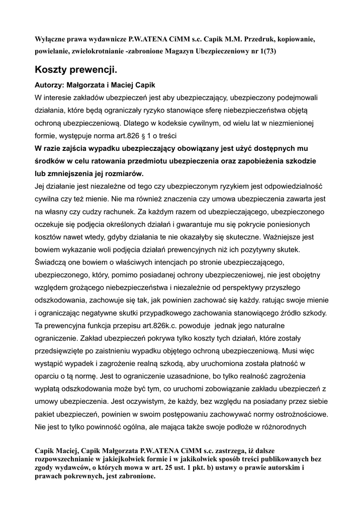Wyłączne prawa wydawnicze P.W.ATENA CiMM s.c. Capik M.M. Przedruk, kopiowanie, powielanie, zwielokrotnianie -zabronione Magazyn Ubezpieczeniowy nr 1(73) Koszty prewencji. Autorzy: Małgorzata i Maciej Capik W interesie zakładów ubezpieczeń jest aby ubezpieczający, ubezpieczony podejmowali działania, które będą ograniczały ryzyko stanowiące sferę niebezpieczeństwa objętą ochroną ubezpieczeniową. Dlatego w kodeksie cywilnym, od wielu lat w niezmienionej formie, występuje norma art.826 § 1 o treści W razie zajścia wypadku ubezpieczający obowiązany jest użyć dostępnych mu środków w celu ratowania przedmiotu ubezpieczenia oraz zapobieżenia szkodzie lub zmniejszenia jej rozmiarów. Jej działanie jest niezależne od tego czy ubezpieczonym ryzykiem jest odpowiedzialność cywilna czy też mienie. Nie ma również znaczenia czy umowa ubezpieczenia zawarta jest na własny czy cudzy rachunek. Za każdym razem od ubezpieczającego, ubezpieczonego oczekuje się podjęcia określonych działań i gwarantuje mu się pokrycie poniesionych kosztów nawet wtedy, gdyby działania te nie okazałyby się skuteczne. Ważniejsze jest bowiem wykazanie woli podjęcia działań prewencyjnych niż ich pozytywny skutek. Świadczą one bowiem o właściwych intencjach po stronie ubezpieczającego, ubezpieczonego, który, pomimo posiadanej ochrony ubezpieczeniowej, nie jest obojętny względem grożącego niebezpieczeństwa i niezależnie od perspektywy przyszłego odszkodowania, zachowuje się tak, jak powinien zachować się każdy. ratując swoje mienie i ograniczając negatywne skutki przypadkowego zachowania stanowiącego źródło szkody. Ta prewencyjna funkcja przepisu art.826k.c. powoduje jednak jego naturalne ograniczenie. Zakład ubezpieczeń pokrywa tylko koszty tych działań, które zostały przedsięwzięte po zaistnieniu wypadku objętego ochroną ubezpieczeniową. Musi więc wystąpić wypadek i zagrożenie realną szkodą, aby uruchomiona została płatność w oparciu o tą normę. Jest to ograniczenie uzasadnione, bo tylko realność zagrożenia wypłatą odszkodowania może być tym, co uruchomi zobowiązanie zakładu ubezpieczeń z umowy ubezpieczenia. Jest oczywistym, że każdy, bez względu na posiadany przez siebie pakiet ubezpieczeń, powinien w swoim postępowaniu zachowywać normy ostrożnościowe. Nie jest to tylko powinność ogólna, ale mająca także swoje podłoże w różnorodnych Capik Maciej, Capik Małgorzata P.W.ATENA CiMM s.c. zastrzega, iż dalsze rozpowszechnianie w jakiejkolwiek formie i w jakikolwiek sposób treści publikowanych bez zgody wydawców, o których mowa w art. 25 ust. 1 pkt. b) ustawy o prawie autorskim i prawach pokrewnych, jest zabronione. Wyłączne prawa wydawnicze P.W.ATENA CiMM s.c. Capik M.M. Przedruk, kopiowanie, powielanie, zwielokrotnianie -zabronione Magazyn Ubezpieczeniowy nr 1(73) aktach prawnych, nakładających ściśle określone reguły postepowania. Są normy ochrony przeciwpożarowej, które na każdego nakładają obowiązki prewencyjne , których celem jest niedopuszczenia do zaistnienia zagrożenia pożarem. Są normy kodeksu wykroczeń i kodeksu karnego, zakazujące zachowań, które z jednej strony grożą sankcją karną, ale także i zobowiązaniem do zapłaty odszkodowania. Są przepisy prawa budowalnego , które nie tylko na uczestników procesu inwestycyjnego, ale na właścicieli i zarządców budynków nakładają rozliczne obowiązki, których celem jest utrzymania bezwzględnego bezpieczeństwa użytkowania tych budynków. To tylko przykładowe przepisy o charakterze ogólnym, które obowiązują każdego i w każdej sytuacji. Przestrzeganie zatem norm ostrożnościowych jest czymś czego ma prawo oczekiwać ustawodawca i co jest zachowaniem normalnym i nie przekraczającym granic postępowania powszechnie przyjętego. Prewencja , której celem jest ograniczenia niebezpieczeństwa wystąpienia wypadku jest czymś naturalnym, czymś co nie może zatem rodzić zobowiązania ubezpieczyciela. Gdy jednak celem prewencji jest ograniczenie natężenie czynnika niebezpieczeństwa i zakresu jego oddziaływania, ubezpieczyciel może z tego odnieść korzyść w postaci zmniejszenia wartości odszkodowania, a to jest równoznaczne z jego obowiązkiem pokrywania kosztów tej prewencji. Zatem wystąpienie wypadku ubezpieczeniowego, nie tyle zmienia charakter środków prewencyjnych, ale zmienia jej skutki, które odnoszą nie tylko do podmiotu zagrożonego, ale do zakładu ubezpieczeń jako strony umowy ubezpieczenia. Dlatego z punktu widzenia tej umowy dzielimy prewencję na tą, która ma miejsce po zajściu wypadku objętego ochroną ubezpieczeniową i tą przed wypadkiem, której koszty musi ubezpieczający , ubezpieczony ponosić w własnym zakresie. Ten podział prewencji jest także źródłem dodatkowych zapisów w umowach ubezpieczenia, gdzie ubezpieczyciel poza kosztami przewidzianymi w art.826 godzi się także na pokrywanie kosztów prewencji przedwypadkowej . Wtedy te działania prewencyjne są z reguły określane rodzajowo, a także limitowane odrębną sumą ubezpieczenia. Capik Maciej, Capik Małgorzata P.W.ATENA CiMM s.c. zastrzega, iż dalsze rozpowszechnianie w jakiejkolwiek formie i w jakikolwiek sposób treści publikowanych bez zgody wydawców, o których mowa w art. 25 ust. 1 pkt. b) ustawy o prawie autorskim i prawach pokrewnych, jest zabronione.