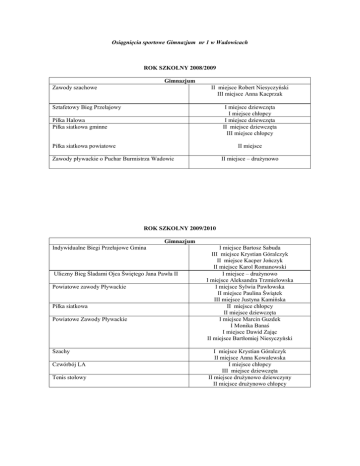 Osiągnięcia sportowe Gimnazjum nr 1 w Wadowicach ROK SZKOLNY 2008/2009 Gimnazjum II miejsce Robert Niesyczyński III miejsce Anna Kacprzak Zawody szachowe Sztafetowy Bieg Przełajowy I miejsce dziewczęta I miejsce chłopcy I miejsce dziewczęta II miejsce dziewczęta III miejsce chłopcy Piłka Halowa Piłka siatkowa gminne Piłka siatkowa powiatowe II miejsce Zawody pływackie o Puchar Burmistrza Wadowic II miejsce – drużynowo ROK SZKOLNY 2009/2010 Gimnazjum Indywidualne Biegi Przełajowe Gmina Uliczny Bieg Śladami Ojca Świętego Jana Pawła II Powiatowe zawody Pływackie Piłka siatkowa Powiatowe Zawody Pływackie Szachy Czwórbój LA Tenis stołowy I miejsce Bartosz Sabuda III miejsce Krystian Góralczyk II miejsce Kacper Jończyk II miejsce Karol Romanowski I miejsce – drużynowo I miejsce Aleksandra Trzmielowska I miejsce Sylwia Pawłowska II miejsce Paulina Świątek III miejsce Justyna Kamińska II miejsce chłopcy II miejsce dziewczęta I miejsce Marcin Guzdek I Monika Banaś I miejsce Dawid Zając II miejsce Bartłomiej Niesyczyński I miejsce Krystian Góralczyk II miejsce Anna Kowalewska I miejsce chłopcy III miejsce dziewczęta II miejsce drużynowo dziewczyny II miejsce drużynowo chłopcy ROK SZKOLNY 2010/2011 Gimnazjum Piłka Siatkowa Gminne II miejsce chłopcy I miejsce dziewczęta Piłka Siatkowa Powiat III miejsce dziewczęta V miejsce chłopcy Sztafetowe Biegi Przełajowe I miejsce dziewczęta I miejsce chłopcy II miejsce chłopcy I miejsce dziewczęta Puchar Mariusza Wlazłego Gmina Piłka ręczna II miejsce chłopcy Powiat Piłka ręczna Szachy Powiat V miejsce chłopcy I miejsce Anna Kowalewska V miejsce w województwie I miejsce Krystian Góralczyk XIII miejsce w województwie ROK SZKOLNY 2011/2012 Gimnazjum Piłka Siatkowa Gminne I miejsce chłopcy I miejsce dziewczęta Piłka Siatkowa Powiat III miejsce dziewczęta IV miejsce chłopcy Sztafetowe Biegi Przełajowe Gminne Bieg Solidarności Zawody Powiatowe w szachach Zawody Narciarskie o Puchar Burmistrza Wadowic Turniej Piłki siatkowej o Puchar Pawła Zagumnego I miejsce dziewczęta II miejsce chłopcy I miejsce Adam Jończyk II miejsce Weronika Bereżan I miejsce Anna Kowalewska V miejsce Bartłomiej Niesyczyński II miejsce Michał Rosenstrauch I miejsce dziewczęta I miejsce chłopcy ROK SZKOLNY 2012/2013 Gimnazjum Piłka Siatkowa Gminne II miejsce dziewczęta I miejsce chłopcy II miejsce II miejsce dziewczęta II miejsce chłopcy I miejsce Banaś Monika II miejsce Oliwia Bąk I miejsce Marcin Guzdek I miejsce Marcin Guzdek III miejsce Patryk Gurdek Memoriał Zemana Mistrzostwa Szkół Ziemi Wadowickiej w Piłce Siatkowej Powiatowe Zawody Pływackie ROK SZKOLNY 2013/2014 Gimnazjum Piłka Siatkowa Gminne I miejsce chłopcy I miejsce dziewczęta Piłka Siatkowa Powiatowe II miejsce dziewczęta III miejsce chłopcy Turniej o Puchar K. Ignaczaka II miejsce chłopcy II miejsce dziewczęta III miejsce dziewczęta II miejsce chłopcy I miejsce dziewczęta I miejsce chłopcy Sztafetowe Biegi Przełajowe Czwórbój LA Gminne Zawody Pływackie o Puchar Burmistrza Wadowic Bieg Solidarności I miejsce drużynowo I miejsce dziewczyny sztacheta I miejsce chłopcy sztacheta I miejsce Monika Banaś II miejsce Dawid Banaś 3x 1 miejsce Karolina Bogucka 1miejsce Marcin Guzdek II miejsce drużynowo I miejsce Aleksandra Markowska II miejsce Aleksandra Pawlik Najbardziej usportowiony uczeń w Gminie Wadowice: II miejsce Monika Banaś ROK SZKOLNY 2014/2015 Gimnazjum Piłka Siatkowa Gminne II miejsce chłopcy I miejsce dziewczęta Piłka Siatkowa Powiatowe III miejsce dziewczęta VII miejsce chłopcy Turniej o Puchar Pawła Papke II miejsce chłopcy III miejsce dziewczęta I miejsce drużynowo Kwietna Mila Czwórbój LA Gminne Sztafetowe Biegi Przełajowe Gminne II miejsce dziewczęta I miejsce chłopcy III miejsce dziewczyny Powiatowe Zawody Pływackie III miejsce drużynowo I miejsce Marcin Guzdek Powiatowe Zawody szachowe II miejsce Bartłomiej Kowalewski III miejsce Filip Jopek I miejsce Małgorzata Frączek II miejsce Ludwikowski Tymon III miejsce Białończyk Wiktoria IV miejsce Wiktoria Maluty Zawody narciarskie o Puchar Burmistrza Wadowice Najbardziej usportowiony uczeń w Gminie Wadowice: I miejsce Julia Bylica