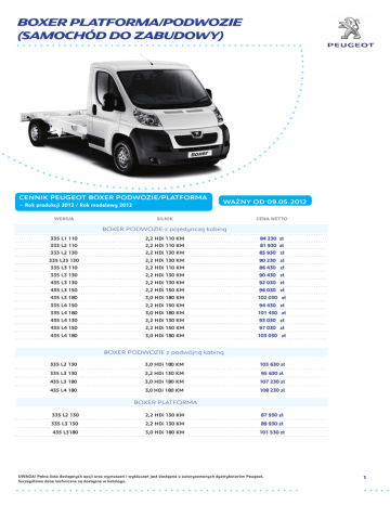 BOXER PLATFORMA/PODWOZIE (SAMOCHÓD DO ZABUDOWY) CENNIK PEUGEOT BOXER PODWOZIE/PLATFORMA - Rok produkcji 2012 / Rok modelowy 2012 WERSJA WAŻNY OD 09.05.2012 SILNIK CENA NETTO BOXER PODWOZIE z pojedynczą kabiną 335 L1 110 333 L2 110 2,2 HDi 110 KM 2,2 HDi 110 KM 84 230 zł 81 930 zł 333 L2 130 2,2 HDi 130 KM 85 930 zł 335 L2S 130 2,2 HDi 130 KM 90 230 zł 335 L3 110 2,2 HDi 110 KM 86 430 zł 335 L3 130 2,2 HDi 130 KM 90 430 zł 435 L3 130 2,2 HDi 130 KM 92 030 zł 435 L3 150 2,2 HDi 150 KM 96 030 zł 435 L3 180 3,0 HDi 180 KM 102 030 zł 335 L4 150 2,2 HDi 150 KM 94 430 zł 335 L4 180 3,0 HDi 180 KM 101 430 zł 435 L4 130 2,2 HDi 130 KM 93 030 zł 435 L4 150 2,2 HDi 150 KM 97 030 zł 435 L4 180 3,0 HDi 180 KM 103 030 zł BOXER PODWOZIE z podwójną kabiną 335 L2 130 3,0 HDi 180 KM 103 630 zł 335 L3 130 2,2 HDi 130 KM 95 630 zł 435 L3 180 3,0 HDi 180 KM 107 230 zł 435 L4 180 3,0 HDi 180 KM 108 230 zł BOXER PLATFORMA 335 L2 130 2,2 HDi 130 KM 87 930 zł 335 L3 130 2,2 HDi 130 KM 89 930 zł 435 L3180 3,0 HDi 180 KM 101 530 zł UWAGA! Pełna lista dostępnych opcji oraz wymuszeń i wykluczeń jest dostępna u autoryzowanych dystrybutorów Peugeot. Szczegółowe dane techniczne są dostępne w katalogu. 1 BOXER PLATFORMA/PODWOZIE (SAMOCHÓD DO ZABUDOWY) SPECJALNA OFERTA AKCESORIÓW PAKIET „KOMFORT” – TERAZ 875 ZŁ PAKIET„OCHRONA” – TERAZ 548 ZŁ OWIEWKI SZYB PRZEDNICH BOCZNYCH DYWANIKI GUMOWE PRZEDNIE POJEMNIK IZOTERMICZNY (POJEMNOŚĆ 15 L) TORBA PRODUKTÓW TECHNATURE CHLAPACZE TYLNE TORBA DO BAGAŻNIKA PEUGEOT FINANCE to kompleksowa oferta usług kredytowych, leasingowych oraz ubezpieczeniowych na zakup nowych i używanych samochodów marki Peugeot dla klientów indywidualnych oraz przedsiębiorców. Proponujemy specjalną ofertę finansową dla modelu Peugeot Boxer Platforma/Podwozie KREDYT 40/60 Założenia przyjęte do obliczenia RRSO: cena pojazdu: 81930 zł, wpłata własna: 32772 zł, stopa oprocentowania kredytu: 0,99%, finansowana prowizja bankowa: 5% kwoty kredytu, całkowita kwota kredytu: 51615,90 zł (zawiera prowizję bankową), miesięczna opłata administracyjna: 0 zł, czas obowiązywania umowy: 12 miesięcy, wysokość raty balonowej płatnej po 12 miesiącach: 52126,90 zł, RRSO: 6,04%, całkowita kwota do zapłaty przez konsumenta (określona w sposób szacunkowy zgodnie z art. 8 ustawy z dn. 12.05.2011 r. o kredycie konsumenckim): 52126,90 zł. Zgoda na udzielenie kredytu jest uzależniona od zdolności kredytowej Klienta ustalanej zgodnie z procedurami Banku. Banque PSA Finance S.A. Oddział w Polsce ma prawo wymagać dodatkowych dokumentów w trakcie oceny zdolności kredytowej. Niniejsze propozycje nie stanowią oferty w rozumieniu artykułu 66 Kodeksu cywilnego. Prezentowane informacje zostały podane według stanu na marzec 2012. LEASING OD 106% Niniejsza informacja nie stanowi oferty w rozumieniu artykułu 66 Kodeksu Cywilnego. Okres leasingu 2 lata, wpłata początkowa 45%, wykup 19%. Dostępne są inne parametry umowy. Szczegóły oferty jak i informacje o pozostałych dostępnych produktach leasingowych oraz kredytowych znajdą Państwo u Autoryzowanego Dystrybutora Peugeot. UMOWY SERWISOWE OPTIWAY • „Przedłużenie Gwarancji”, dzięki której okres ważności gwarancji może być przedłużony na kolejne 3 lata, • „Obsługa”, zapewniającą bezpłatne wykonanie przeglądów okresowych Peugeot, • „Przedłużenie Gwarancji Plus Obsługa”, łączącą korzyści z dwóch w/w umów, • „Utrzymanie”, zapewniającą bezpłatne wykonanie przeglądów okresowych Peugeot oraz wymianę części zużywających się eksploatacyjnie. Szczegóły u Autoryzowanego Dystrybutora PEUGEOT. UWAGA! Przedstawione informacje oparte są na danych aktualnych w chwili publikacji i mogą podlegać zmianom. Prezentowane dane techniczne, wyposażenie, opcje i kolory mogą zostać w każdej chwili zmienione lub być niedostępne, mogą też być ograniczone do części modeli, oznaczonych serii specjalnych lub być ograniczone liczbą dostępnych pojazdów. Wszystkie ceny zawarte w cenniku są rekomendowanymi cenami netto (nie zawierają podatku VAT). Dane zawarte w cenniku nie stanowią oferty w rozumieniu przepisów prawa polskiego. Treść cennika ma charakter wyłącznie informacyjny, w szczególności nie należy jej traktować jako wiążącego prawnie zobowiązania lub zapewnienia gwarancyjnego w rozumieniu art. 13. Ustawy z 27 lipca 2002 r. o szczególnych warunkach sprzedaży konsumenckiej – gwarancję stanowi wyłącznie dokument gwarancyjny wydany przez sprzedawcę. Wiążące ustalenie ceny, wyposażenia i specyfikacji pojazdu dokonane zostaje w chwili podpisania umowy sprzedaży lub dostawy pojazdu. Dane dotyczące odzysku i recyklingu pojazdów dostępne są na www.peugeot.pl. W celu uzyskania wszelkich dodatkowych informacji o oferowanych pojazdach, usługach i akcesoriach zapraszamy do autoryzowanych dystrybutorów Peugeot. 2