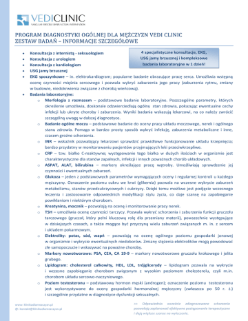 P R O G R A M D I A G N O S T Y K I O G Ó L N E J D L A M Ę ŻC Z Y Z N V E D I C L I N I C ZESTAW BADAŃ – INFORMACJE SZCZEGÓŁOWE 4 specjalistyczne konsultacje, EKG, Konsultacja z internistą - seksuologiem USG jamy brzusznej i kompleksowe Konsultacja z urologiem badania laboratoryjne w 1 dzieo! Konsultacja z kardiologiem USG jamy brzusznej EKG spoczynkowe – in. elektrokardiogram; popularne badanie obrazujące pracę serca. Umożliwia wstępną ocenę czynności mięśnia sercowego i pozwala wykryd zaburzenia jego pracy (zaburzenia rytmu, zmiany w budowie, niedokrwienia związane z chorobą wieocową). Badania laboratoryjne: o Morfologia z rozmazem – podstawowe badanie laboratoryjne. Poszczególne parametry, których określenie umożliwia, doskonale odzwierciedlają ogólny stan zdrowia, pokazując ewentualne cechy infekcji lub ukryte choroby i zaburzenia. Wyniki badania wskazują lekarzowi, na co należy zwrócid szczególną uwagę w dalszej diagnostyce. o Badanie ogólne moczu – podstawowe badanie do oceny pracy układu moczowego, nerek i ogólnego stanu zdrowia. Pomaga w bardzo prosty sposób wykryd infekcję, zaburzenia metaboliczne i inne, czasem groźne schorzenia. o INR – wskaźnik pozwalający lekarzowi sprawdzid prawidłowe funkcjonowanie układu krzepnięcia; bardzo przydatny w monitorowaniu pacjentów przyjmujących leki przeciwkrzepliwe. o CRP – tzw. białko C-reaktywne; występowanie tego białka w dużych ilościach w organizmie jest charakterystyczne dla stanów zapalnych, infekcji i innych poważnych chorób układowych. o ASPAT, ALAT, bilirubina – markery określające pracę wątroby. Umożliwiają sprawdzenie jej czynności i ewentualnych zaburzeo. o Glukoza – jeden z podstawowych parametrów wymagających oceny i regularnej kontroli u każdego mężczyzny. Oznaczenie poziomu cukru we krwi (glikemia) pozwala na wczesne wykrycie zaburzeo metabolizmu, stanów przedcukrzycowych i cukrzycy. Dzięki temu możliwe jest podjęcie wczesnego leczenia i zastosowanie odpowiednich modyfikacji stylu życia, co daje szansę na zapobieganie powikłaniom i niektórym chorobom. o Kreatynina, mocznik – pozwalają na ocenę i monitorowanie pracy nerek. o TSH – umożliwia ocenę czynności tarczycy. Pozwala wykryd schorzenia i zaburzenia funkcji gruczołu tarczowego (gruczoł, który pełni kluczową rolę dla przemiany materii), powszechnie występujące w dzisiejszych czasach, a także mogące byd przyczyną wielu zaburzeo związanych m. in. z sercem i układem pokarmowym. o Elektrolity: potas, sód, wapo – pozwalają na ocenę ogólnego poziomu gospodarki jonowej w organizmie i wykrycie ewentualnych niedoborów. Zmiany stężenia elektrolitów mogą powodowad złe samopoczucie i wskazywad na poważne choroby. o Markery nowotworowe: PSA, CEA, CA 19-9 – markery nowotworowe gruczołu krokowego i jelita grubego. o Lipidogram: cholesterol całkowity, HDL, LDL, trójglicerydy – lipidogram pozwala na wykrycie i wczesne zapobieganie chorobom związanym z wysokim poziomem cholesterolu, czyli m.in. chorobom układu sercowo-naczyniowego. o Poziom testosteronu – podstawowy hormon męski (androgen); oznaczenie poziomu testosteronu jest wykorzystywane do oceny gospodarki hormonalnej mężczyzny (zwłaszcza po 50 r. ż.) i szczególnie przydatne w diagnostyce dysfunkcji seksualnych. www: klinikadlamezczyzn.pl @: [email protected] >> Odpowiednio wcześnie zdiagnozowane schorzenia pozwalają zaplanować efektywne postępowanie terapeutyczne i dają większe szanse na wyleczenie.