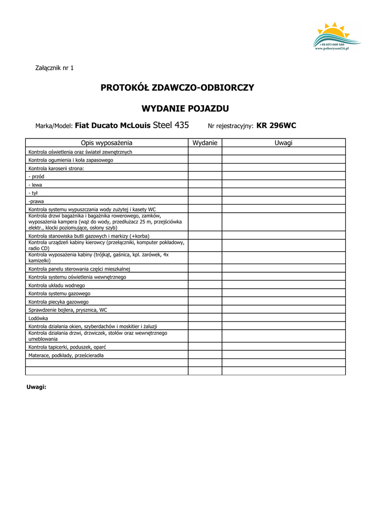 Załącznik nr 1 PROTOKÓŁ ZDAWCZO-ODBIORCZY WYDANIE POJAZDU Marka/Model: Fiat Ducato McLouis Steel 435 Opis wyposażenia Kontrola oświetlenia oraz świateł zewnętrznych Kontrola ogumienia i koła zapasowego Kontrola karoserii strona: - przód - lewa - tył -prawa Kontrola systemu wypuszczania wody zużytej i kasety WC Kontrola drzwi bagażnika i bagażnika rowerowego, zamków, wyposażenia kampera (wąż do wody, przedłużacz 25 m, przejściówka elektr., klocki poziomujące, osłony szyb) Kontrola stanowiska butli gazowych i markizy (+korba) Kontrola urządzeń kabiny kierowcy (przełączniki, komputer pokładowy, radio CD) Kontrola wyposażenia kabiny (trójkąt, gaśnica, kpl. żarówek, 4x kamizelki) Kontrola panelu sterowania części mieszkalnej Kontrola systemu oświetlenia wewnętrznego Kontrola układu wodnego Kontrola systemu gazowego Kontrola piecyka gazowego Sprawdzenie bojlera, prysznica, WC Lodówka Kontrola działania okien, szyberdachów i moskitier i żaluzji Kontrola działania drzwi, drzwiczek, stołów oraz wewnętrznego umeblowania Kontrola tapicerki, poduszek, oparć Materace, podkłady, prześcieradła Uwagi: Nr rejestracyjny: Wydanie KR 296WC Uwagi • • • • • Wybrane dane techniczne: Wymiary: dł/szer/wys (cm): 638/235/305 Dopuszczalna masa całkowita: 3300 kg Liczba miejsc do jazdy (z pasami bezpieczeństwa): 6 Liczba miejsc do spania: 6 Max. obciążenie łóżka alkowy 140 kg Wraz z pojazdem przekazano: 1. Komplet kluczyków: do drzwi kabiny (wraz z pilotem centralnego zamka), do drzwi części mieszkalnej, bagażnika i schowka na butle gazowe i kasety WC Dowód rejestracyjny Potwierdzenie zawarcia ubezpieczenia OC, AC, NW i Assistance Kopię Ogólnych Warunków Ubezpieczenia Procedurę postępowania w razie awarii, kolizji lub wypadku. Listy kontrolne koniecznych czynności: przed wyruszeniem w drogę, opuszczeniem pojazdu, noclegiem 7. Wąż gumowy do tankowania wody, przedłużacz na szpuli (25 m), przewód prądowy podłączeniowy do kampera, przejściówka elektryczna, klocki poziomujące 8. Gaśnica, trójkąt, 4x kamizelki odblaskowe, komplet żarówek, podstawowe klucze. 9. Radio CD MP3 marki Sony 10. Podkłady na 3 łóżka wraz z prześcieradłami. 2. 3. 4. 5. 6. Zapoznałam/-em się z powyższą treścią i akceptuje zawarte w nich postanowienia: Data wydania Data..............….....godz……..… Stan licznika przy wydaniu samochodu Wynajmujący Najemca ………………......... km …….......…….......…………… ………............……………………. podpis podpis ZWROT POJAZDU Opis wyposażenia Zwrot Uwagi Kontrola oświetlenia oraz świateł zewnętrznych Kontrola ogumienia i koła zapasowego Kontrola karoserii strona: - przód - lewa - tył -prawa Kontrola systemu wypuszczania wody zużytej i kasety WC Kontrola drzwi bagażnika i bagażnika rowerowego, zamków, wyposażenia kampera (wąż do wody, przedłużacz 25 m, przejściówka elektr., klocki poziomujące, osłony szyb) Kontrola stanowiska butli gazowych i markizy (+korba) Kontrola urządzeń kabiny kierowcy (przełączniki, komputer pokładowy, radio CD) Kontrola wyposażenia kabiny (trójkąt, gaśnica, kpl. żarówek, 4x kamizelki) Kontrola panelu sterowania części mieszkalnej Kontrola systemu oświetlenia wewnętrznego Kontrola układu wodnego Kontrola systemu gazowego Kontrola piecyka gazowego Sprawdzenie bojlera, prysznica, WC Lodówka Kontrola działania okien, szyberdachów i moskitier i żaluzji Kontrola działania drzwi, drzwiczek, stołów oraz wewnętrznego umeblowania Kontrola tapicerki, poduszek, oparć Materace, podkłady, prześcieradła Uwagi: Data zwrotu Data..............….....godz……..… Stan licznika przy zwrocie samochodu Wynajmujący Najemca ………………......... km …….......…….......…………… ………............……………………. podpis podpis