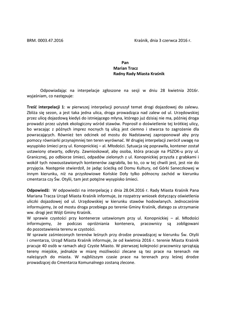 BRM. 0003.47.2016 Kraśnik, dnia 3 czerwca 2016 r. Pan Marian Tracz Radny Rady Miasta Kraśnik Odpowiadając na interpelacje zgłoszone na sesji w dniu 28 kwietnia 2016r. wyjaśniam, co następuje: Treść interpelacji 1: w pierwszej interpelacji poruszył temat drogi dojazdowej do zalewu. Zbliża się sezon, a jest taka jedna ulica, droga prowadząca nad zalew od ul. Urzędowskiej przez ulicę dojazdową kiedyś do istniejącego młyna, którego już dzisiaj nie ma, później droga prowadzi przez użytek ekologiczny wśród stawów. Poprosił o doświetlenie tej krótkiej ulicy, bo wracając z późnych imprez nocnych tą ulicą jest ciemno i stwarza to zagrożenie dla powracających. Również ten odcinek od mostu do Nadstawnej zaproponował aby przy pomocy równiarki przynajmniej ten teren wyrównać. W drugiej interpelacji zwrócił uwagę na wysypisko śmieci przy ul. Konopnickiej – al. Młodości. Sytuacja się poprawiła, kontener został ustawiony otwarty, odkryty. Zawnioskował, aby osoba, która pracuje na PSZOK-u przy ul. Granicznej, po odbiorze śmieci, odpadów zielonych z ul. Konopnickiej przyszła z grabkami i wokół tych nowoustawionych kontenerów zagrabiła, bo to, co w tej chwili jest, jest nie do przyjęcia. Następnie stwierdził, że jadąc ścieżką od Domu Kultury, od Górki Saneczkowej w innym kierunku, niż na przysłowiowe Końskie Doły tylko północny zachód w kierunku cmentarza czy Św. Otylii, tam jest potężne wysypisko śmieci. Odpowiedź: W odpowiedzi na interpelację z dnia 28.04.2016 r. Rady Miasta Kraśnik Pana Mariana Tracza Urząd Miasta Kraśnik informuje, że rozpatrzy wniosek dotyczący oświetlenia uliczki dojazdowej od ul. Urzędowskiej w kierunku stawów hodowlanych. Jednocześnie informujemy, że od mostu droga przebiega po terenie Gminy Kraśnik, dlatego za utrzymanie ww. drogi jest Wójt Gminy Kraśnik. W sprawie czystości przy kontenerze ustawionym przy ul. Konopnickiej – al. Młodości informujemy, że podczas opróżniania kontenera, pracownicy są zobligowani do pozostawienia terenu w czystości. W sprawie zaśmieconych terenów leśnych przy drodze prowadzącej w kierunku Św. Otylii i cmentarza, Urząd Miasta Kraśnik informuje, że od kwietnia 2016 r. terenie Miasta Kraśnik pracuje 40 osób w ramach akcji Czyste Miasto. W pierwszej kolejności pracownicy sprzątają tereny miejskie, jednakże w miarę możliwości zlecane są tez prace na terenach nie należących do miasta. W najbliższym czasie prace na terenach przy leśnej drodze prowadzącej do Cmentarza Komunalnego zostaną zlecone.