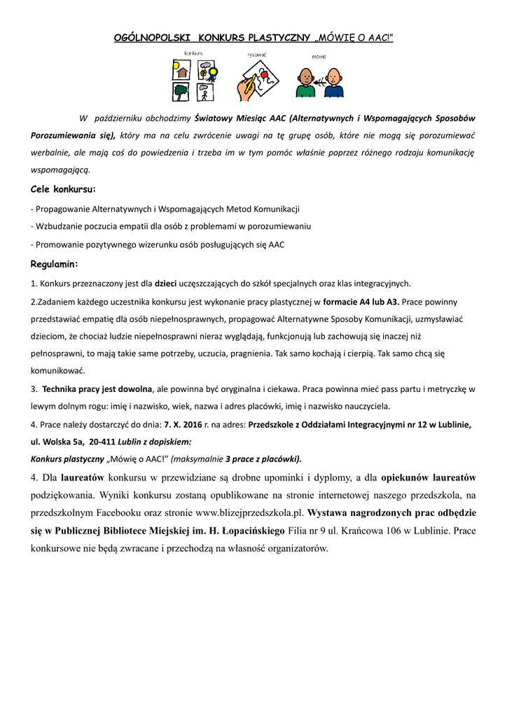 OGÓLNOPOLSKI KONKURS PLASTYCZNY „MÓWIĘ O AAC!” W październiku obchodzimy Światowy Miesiąc AAC (Alternatywnych i Wspomagających Sposobów Porozumiewania się), który ma na celu zwrócenie uwagi na tę grupę osób, które nie mogą się porozumiewać werbalnie, ale mają coś do powiedzenia i trzeba im w tym pomóc właśnie poprzez różnego rodzaju komunikację wspomagającą. Cele konkursu: - Propagowanie Alternatywnych i Wspomagających Metod Komunikacji - Wzbudzanie poczucia empatii dla osób z problemami w porozumiewaniu - Promowanie pozytywnego wizerunku osób posługujących się AAC Regulamin: 1. Konkurs przeznaczony jest dla dzieci uczęszczających do szkół specjalnych oraz klas integracyjnych. 2.Zadaniem każdego uczestnika konkursu jest wykonanie pracy plastycznej w formacie A4 lub A3. Prace powinny przedstawiać empatię dla osób niepełnosprawnych, propagować Alternatywne Sposoby Komunikacji, uzmysławiać dzieciom, że chociaż ludzie niepełnosprawni nieraz wyglądają, funkcjonują lub zachowują się inaczej niż pełnosprawni, to mają takie same potrzeby, uczucia, pragnienia. Tak samo kochają i cierpią. Tak samo chcą się komunikować. 3. Technika pracy jest dowolna, ale powinna być oryginalna i ciekawa. Praca powinna mieć pass partu i metryczkę w lewym dolnym rogu: imię i nazwisko, wiek, nazwa i adres placówki, imię i nazwisko nauczyciela. 4. Prace należy dostarczyć do dnia: 7. X. 2016 r. na adres: Przedszkole z Oddziałami Integracyjnymi nr 12 w Lublinie, ul. Wolska 5a, 20-411 Lublin z dopiskiem: Konkurs plastyczny „Mówię o AAC!” (maksymalnie 3 prace z placówki). 4. Dla laureatów konkursu w przewidziane są drobne upominki i dyplomy, a dla opiekunów laureatów podziękowania. Wyniki konkursu zostaną opublikowane na stronie internetowej naszego przedszkola, na przedszkolnym Facebooku oraz stronie www.blizejprzedszkola.pl. Wystawa nagrodzonych prac odbędzie się w Publicznej Bibliotece Miejskiej im. H. Łopacińskiego Filia nr 9 ul. Krańcowa 106 w Lublinie. Prace konkursowe nie będą zwracane i przechodzą na własność organizatorów. 6. Nadesłanie prac na konkurs jest jednoznaczne z wyrażeniem zgody na publikację prac oraz nazwisk dzieci, nauczycieli na wystawie i w mediach. Serdecznie zapraszamy do udziału w konkursie! Organizator: Przedszkole z Oddziałami Integracyjnymi nr 12 w Lublinie, ul. Wolska 5a Osoby odpowiedzialne: Aneta Małolepsza, Anna Iskra, Sylwia Skibińska OGÓLNOPOLSKI KONKURS PLASTYCZNY „MÓWIĘ O AAC!” W październiku obchodzimy Światowy Miesiąc AAC (Alternatywnych i Wspomagających Sposobów Porozumiewania się), który ma na celu zwrócenie uwagi na tę grupę osób, które nie mogą się porozumiewać werbalnie, ale mają coś do powiedzenia i trzeba im w tym pomóc właśnie poprzez różnego rodzaju komunikację wspomagającą. Cele konkursu: - Propagowanie Alternatywnych i Wspomagających Metod Komunikacji - Wzbudzanie poczucia empatii dla osób z problemami w porozumiewaniu - Promowanie pozytywnego wizerunku osób posługujących się AAC Regulamin: 1. Konkurs przeznaczony jest dla dzieci 3-6 lat uczęszczających do przedszkoli. 2.Zadaniem każdego uczestnika konkursu jest wykonanie pracy plastycznej w formacie A4 lub A3. Prace powinny przedstawiać empatię dla osób niepełnosprawnych, propagować Alternatywne Sposoby Komunikacji, uzmysławiać dzieciom, że chociaż ludzie niepełnosprawni nieraz wyglądają, funkcjonują lub zachowują się inaczej niż pełnosprawni, to mają takie same potrzeby, uczucia, pragnienia. Tak samo kochają i cierpią. Tak samo chcą się komunikować. 3. Technika pracy jest dowolna, ale powinna być oryginalna i ciekawa. Praca powinna mieć pass partu i metryczkę w lewym dolnym rogu: imię i nazwisko, wiek, nazwa i adres placówki, imię i nazwisko nauczyciela. 4. Prace należy dostarczyć do dnia: 7. X. 2016 r. na adres: Przedszkole z Oddziałami Integracyjnymi nr 12 w Lublinie, ul. Wolska 5a, 20-411 Lublin z dopiskiem: Konkurs plastyczny „Mówię o AAC!” (maksymalnie 3 prace z placówki). 4. Dla laureatów konkursu w przewidziane są drobne upominki i dyplomy, a dla opiekunów laureatów podziękowania. Wyniki konkursu zostaną opublikowane na stronie internetowej naszego przedszkola, na przedszkolnym Facebooku oraz stronie www.blizejprzedszkola.pl. Wystawa nagrodzonych prac odbędzie się w Publicznej Bibliotece Miejskiej im. H. Łopacińskiego Filia nr 9 ul. Krańcowa 106 w Lublinie. Prace konkursowe nie będą zwracane i przechodzą na własność organizatorów. 6. Nadesłanie prac na konkurs jest jednoznaczne z wyrażeniem zgody na publikację prac oraz nazwisk dzieci, nauczycieli na wystawie i w mediach. Serdecznie zapraszamy do udziału w konkursie! Organizator: Przedszkole z Oddziałami Integracyjnymi nr 12 w Lublinie, ul. Wolska 5a Osoby odpowiedzialne: Aneta Małolepsza, Anna Iskra, Sylwia Skibińska