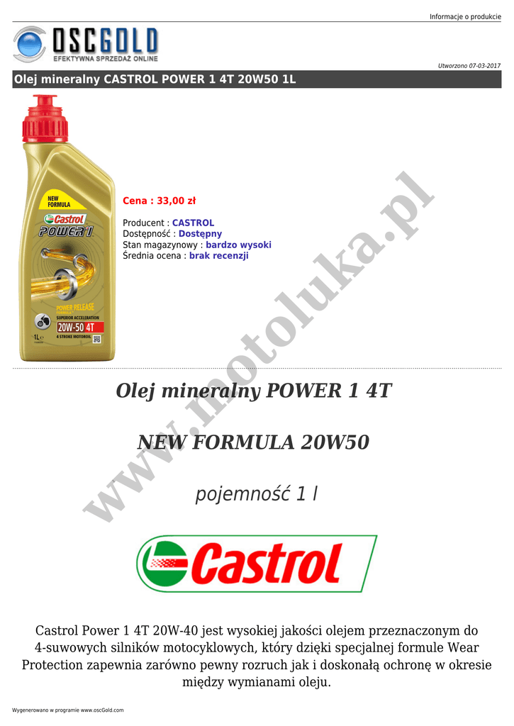 Informacje o produkcie Utworzono 07-03-2017 Cena : 33,00 zł ot ol uk Producent : CASTROL Dostępność : Dostępny Stan magazynowy : bardzo wysoki Średnia ocena : brak recenzji a. pl Olej mineralny CASTROL POWER 1 4T 20W50 1L .m Olej mineralny POWER 1 4T w w w NEW FORMULA 20W50 pojemność 1 l Castrol Power 1 4T 20W-40 jest wysokiej jakości olejem przeznaczonym do 4-suwowych silników motocyklowych, który dzięki specjalnej formule Wear Protection zapewnia zarówno pewny rozruch jak i doskonałą ochronę w okresie między wymianami oleju. Wygenerowano w programie www.oscGold.com Castrol Power 1 4T 20W-40 z formułą Wear Protection i Trizone Technology TM utrzymuje na stałym poziomie odpowiednie parametry smarowania. Zastosowana technologia pozwala na utrzymanie oleju w doskonałej jakości, przeciwdziała nadmiernemu gęstnieniu oleju i utrzymuje w czystości współpracujące elementy silnika. Pozwala to na utrzymanie silnika w dobrej kondycji, dając pewność startu i wolną od problemów eksploatację motocykla. w w w .m ot ol uk a. pl Castrol Power 1 4T 20W-40 jest odpowiedni dla wszystkich nowoczesnych motocykli wymagających specyfikacji API i JASO.