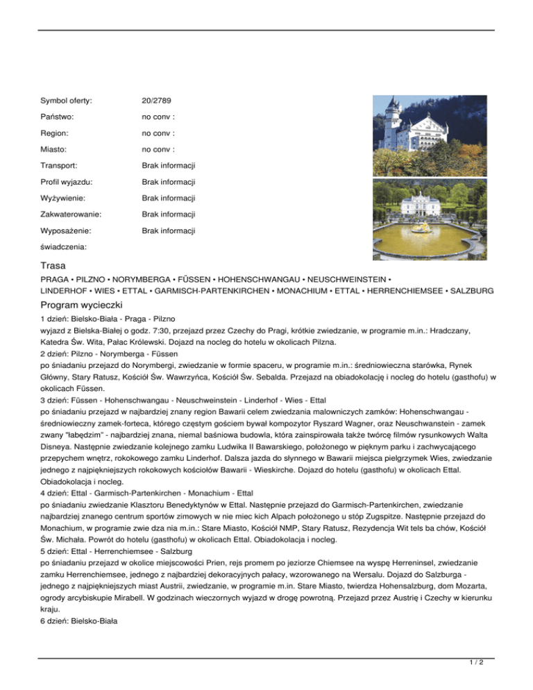Symbol oferty: 20/2789 Państwo: no conv : Region: no conv : Miasto: no conv : Transport: Brak informacji Profil wyjazdu: Brak informacji Wyżywienie: Brak informacji Zakwaterowanie: Brak informacji Wyposażenie: Brak informacji świadczenia: Trasa PRAGA • PILZNO • NORYMBERGA • FÜSSEN • HOHENSCHWANGAU • NEUSCHWEINSTEIN • LINDERHOF • WIES • ETTAL • GARMISCH-PARTENKIRCHEN • MONACHIUM • ETTAL • HERRENCHIEMSEE • SALZBURG Program wycieczki 1 dzień: Bielsko-Biała - Praga - Pilzno wyjazd z Bielska-Białej o godz. 7:30, przejazd przez Czechy do Pragi, krótkie zwiedzanie, w programie m.in.: Hradczany, Katedra Św. Wita, Pałac Królewski. Dojazd na nocleg do hotelu w okolicach Pilzna. 2 dzień: Pilzno - Norymberga - Füssen po śniadaniu przejazd do Norymbergi, zwiedzanie w formie spaceru, w programie m.in.: średniowieczna starówka, Rynek Główny, Stary Ratusz, Kościół Św. Wawrzyńca, Kościół Św. Sebalda. Przejazd na obiadokolację i nocleg do hotelu (gasthofu) w okolicach Füssen. 3 dzień: Füssen - Hohenschwangau - Neuschweinstein - Linderhof - Wies - Ettal po śniadaniu przejazd w najbardziej znany region Bawarii celem zwiedzania malowniczych zamków: Hohenschwangau - średniowieczny zamek-forteca, którego częstym gościem bywał kompozytor Ryszard Wagner, oraz Neuschwanstein - zamek zwany "łabędzim” - najbardziej znana, niemal baśniowa budowla, która zainspirowała także twórcę filmów rysunkowych Walta Disneya. Następnie zwiedzanie kolejnego zamku Ludwika II Bawarskiego, położonego w pięknym parku i zachwycającego przepychem wnętrz, rokokowego zamku Linderhof. Dalsza jazda do słynnego w Bawarii miejsca pielgrzymek Wies, zwiedzanie jednego z najpiękniejszych rokokowych kościołów Bawarii - Wieskirche. Dojazd do hotelu (gasthofu) w okolicach Ettal. Obiadokolacja i nocleg. 4 dzień: Ettal - Garmisch-Partenkirchen - Monachium - Ettal po śniadaniu zwiedzanie Klasztoru Benedyktynów w Ettal. Następnie przejazd do Garmisch-Partenkirchen, zwiedzanie najbardziej znanego centrum sportów zimowych w nie miec kich Alpach położonego u stóp Zugspitze. Następnie przejazd do Monachium, w programie zwie dza nia m.in.: Stare Miasto, Kościół NMP, Stary Ratusz, Rezydencja Wit tels ba chów, Kościół Św. Michała. Powrót do hotelu (gasthofu) w okolicach Ettal. Obiadokolacja i nocleg. 5 dzień: Ettal - Herrenchiemsee - Salzburg po śniadaniu przejazd w okolice miejscowości Prien, rejs promem po jeziorze Chiemsee na wyspę Herreninsel, zwiedzanie zamku Herrenchiemsee, jednego z najbardziej dekoracyjnych pałacy, wzorowanego na Wersalu. Dojazd do Salzburga - jednego z najpiękniejszych miast Austrii, zwiedzanie, w programie m.in. Stare Miasto, twierdza Hohensalzburg, dom Mozarta, ogrody arcybiskupie Mirabell. W godzinach wieczornych wyjazd w drogę powrotną. Przejazd przez Austrię i Czechy w kierunku kraju. 6 dzień: Bielsko-Biała 1/2 kontynuacja jazdy do Polski. Powrót do Bielska-Białej około godz. 9:00. Uwaga Uczestnicy sami pokrywają koszty biletów wstępu do zwiedzanych obiektów (około 90 EURO). Powyższy program jest programem ramowym. Kolejność zwiedzania może ulec zmianie. Połączenia z innymi miastami wg rozkładu jazdy. Świadczenia Transport komfortowy autokar (klimatyzacja, video, barek, WC) Zakwaterowanie 4 noclegi w hotelach ** - *** lub gasthofach ** - *** (pokoje 2, 3-osobowe z pełnym węzłem sanitarnym) Wyżywienie 4 śniadania kontynentalne, 3 obiadokolacje (napoje do obiadokolacji płatne dodatkowo) Ubezpieczenie KL + NW + bagaż Opieka pilota Atrakcje: BOGATY PROGRAM ZWIEDZANIA !!! TERMINY: CENNIK: Długość pobytu: dni Grupa cenowa: Waluta: PLN Aktualne ceny z systemu S.A.R.T. (-) - cena usługi, podatku kalkulowana przy osobie lub gratis (*) - kwota wliczona w cenę standardową 2/2