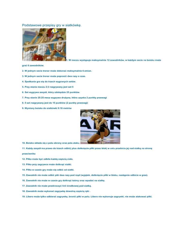 Podstawowe przepisy gry w siatkówkę. 1. W meczu występuje maksymalnie 12 zawodników, w każdym secie na boisku może grać 6 zawodników. 2. W jednym secie trener może dokonać maksymalnie 6 zmian. 3. W jednym secie trener może poprosić dwa razy o czas. 4. Spotkanie gra się do trzech wygranych setów. 5. Przy stanie meczu 2:2 rozgrywany jest set 5 6. Set wygrywa zespół, który zdobędzie 25 punktów. 7. Przy stanie 25:25 mecz wygrywa drużyna, która uzyska 2 punkty przewagi 8. 5 set rozgrywany jest do 15 punktów (2 punkty przewagi) 9. Wymiary boiska do siatkówki 9:18 metrów 10. Boisko składa się z pola obrony oraz pola ataku. 11. Każdy zespół ma prawo do trzech odbić( plus dotknięcie piłki przez blok) w celu przebicia jej nad siatką na stronę przeciwnika 12. Piłka może być odbita każdą częścią ciała. 13. Piłka przy zagrywce może dotknąć siatki. 14. Piłka w czasie gry może się odbić od siatki. 15. Zawodnik nie może odbić piki dwa razy pod rząd (wyjątek, dotknięcie piłki w bloku, następnie odbicie w grze). 16. Zawodnik nie może w czasie gry dotknąć taśmy oraz wpadać na siatkę. 17. Zawodnik nie może przekroczyć linii środkowej pod siatką. 18. Zawodnik może wykonać zagrywkę dowolną częścią ręki . 19. Libero może tylko odbierać zagrywkę, bronić piłki w polu. Libero nie wykonuje zagrywki, nie może atakować piłki.