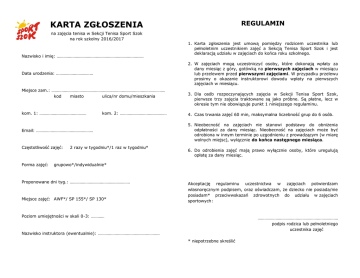 REGULAMIN KARTA ZGŁOSZENIA na zajęcia tenisa w Sekcji Tenisa Sport Szok na rok szkolny 2016/2017 Nazwisko i imię: …………………………………………………………………… 2. W zajęciach mogą uczestniczyć osoby, które dokonają wpłaty za dany miesiąc z góry, gotówką na pierwszych zajęciach w miesiącu lub przelewem przed pierwszymi zajęciami. W przypadku przelewu prosimy o okazanie instruktorowi dowodu wpłaty na pierwszych zajęciach w miesiącu. Data urodzenia: …………………………… Miejsce zam.: ………………………………………………………………………………………… kod miasto ulica/nr domu/mieszkania kom. 1: …………………………………… kom. 2: …………………………………… Email: …………………………………………… Częstotliwość zajęć: Forma zajęć: 1. Karta zgłoszenia jest umową pomiędzy rodzicem uczestnika lub pełnoletnim uczestnikiem zajęć a Sekcją Tenisa Sport Szok i jest deklaracją udziału w zajęciach do końca roku szkolnego. 2 razy w tygodniu*/1 raz w tygodniu* 3. Dla osób rozpoczynających zajęcia w Sekcji Tenisa Sport Szok, pierwsze trzy zajęcia traktowane są jako próbne. Są płatne, lecz w okresie tym nie obowiązuje punkt 1 niniejszego regulaminu. 4. Czas trwania zajęć 60 min, maksymalna liczebność grup do 6 osób. 5. Nieobecność na zajęciach nie stanowi podstawy do obniżenia odpłatności za dany miesiąc. Nieobecność na zajęciach może być odrobiona w innym terminie po uzgodnieniu z prowadzącym (w miarę wolnych miejsc), wyłącznie do końca następnego miesiąca. 6. Do odrobienia zajęć mają prawo wyłącznie osoby, które uregulują opłatę za dany miesiąc. grupowo*/indywidualnie* Proponowane dni tyg.: ……………………………………………… Miejsce zajęć: AWF*/ SP 155*/ SP 130* Akceptację regulaminu uczestnictwa w zajęciach potwierdzam własnoręcznym podpisem, oraz oświadczam, że dziecko nie posiada/nie posiadam* przeciwwskazań zdrowotnych do udziału w zajęciach sportowych: Poziom umiejętności w skali 0-3: ………… ……………………………………………………………… podpis rodzica lub pełnoletniego uczestnika zajęć Nazwisko instruktora (ewentualnie): ………………………………………………. * niepotrzebne skreślić