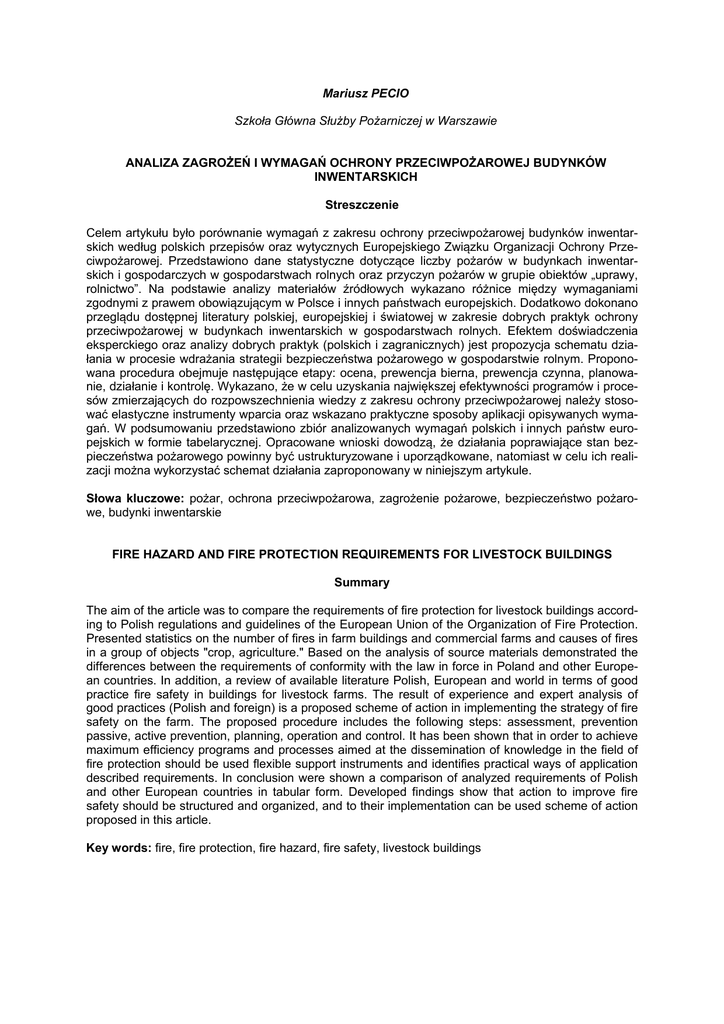 Mariusz PECIO Szkoła Główna Służby Pożarniczej w Warszawie ANALIZA ZAGROŻEŃ I WYMAGAŃ OCHRONY PRZECIWPOŻAROWEJ BUDYNKÓW INWENTARSKICH Streszczenie Celem artykułu było porównanie wymagań z zakresu ochrony przeciwpożarowej budynków inwentarskich według polskich przepisów oraz wytycznych Europejskiego Związku Organizacji Ochrony Przeciwpożarowej. Przedstawiono dane statystyczne dotyczące liczby pożarów w budynkach inwentarskich i gospodarczych w gospodarstwach rolnych oraz przyczyn pożarów w grupie obiektów „uprawy, rolnictwo”. Na podstawie analizy materiałów źródłowych wykazano różnice między wymaganiami zgodnymi z prawem obowiązującym w Polsce i innych państwach europejskich. Dodatkowo dokonano przeglądu dostępnej literatury polskiej, europejskiej i światowej w zakresie dobrych praktyk ochrony przeciwpożarowej w budynkach inwentarskich w gospodarstwach rolnych. Efektem doświadczenia eksperckiego oraz analizy dobrych praktyk (polskich i zagranicznych) jest propozycja schematu działania w procesie wdrażania strategii bezpieczeństwa pożarowego w gospodarstwie rolnym. Proponowana procedura obejmuje następujące etapy: ocena, prewencja bierna, prewencja czynna, planowanie, działanie i kontrolę. Wykazano, że w celu uzyskania największej efektywności programów i procesów zmierzających do rozpowszechnienia wiedzy z zakresu ochrony przeciwpożarowej należy stosować elastyczne instrumenty wparcia oraz wskazano praktyczne sposoby aplikacji opisywanych wymagań. W podsumowaniu przedstawiono zbiór analizowanych wymagań polskich i innych państw europejskich w formie tabelarycznej. Opracowane wnioski dowodzą, że działania poprawiające stan bezpieczeństwa pożarowego powinny być ustrukturyzowane i uporządkowane, natomiast w celu ich realizacji można wykorzystać schemat działania zaproponowany w niniejszym artykule. Słowa kluczowe: pożar, ochrona przeciwpożarowa, zagrożenie pożarowe, bezpieczeństwo pożarowe, budynki inwentarskie FIRE HAZARD AND FIRE PROTECTION REQUIREMENTS FOR LIVESTOCK BUILDINGS Summary The aim of the article was to compare the requirements of fire protection for livestock buildings according to Polish regulations and guidelines of the European Union of the Organization of Fire Protection. Presented statistics on the number of fires in farm buildings and commercial farms and causes of fires in a group of objects "crop, agriculture." Based on the analysis of source materials demonstrated the differences between the requirements of conformity with the law in force in Poland and other European countries. In addition, a review of available literature Polish, European and world in terms of good practice fire safety in buildings for livestock farms. The result of experience and expert analysis of good practices (Polish and foreign) is a proposed scheme of action in implementing the strategy of fire safety on the farm. The proposed procedure includes the following steps: assessment, prevention passive, active prevention, planning, operation and control. It has been shown that in order to achieve maximum efficiency programs and processes aimed at the dissemination of knowledge in the field of fire protection should be used flexible support instruments and identifies practical ways of application described requirements. In conclusion were shown a comparison of analyzed requirements of Polish and other European countries in tabular form. Developed findings show that action to improve fire safety should be structured and organized, and to their implementation can be used scheme of action proposed in this article. Key words: fire, fire protection, fire hazard, fire safety, livestock buildings