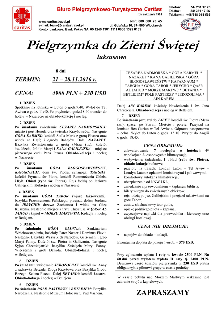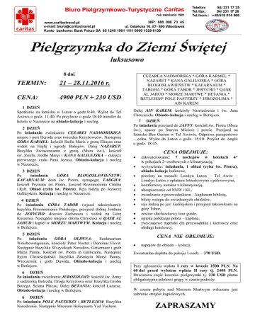 Pielgrzymka do Ziemi Świętej luksusowo 8 dni TERMIN: 21 – 28.11.2016 r. CENA: 4900 PLN + 230 USD 1 DZIEŃ Spotkanie na lotnisku w Luton o godz.9:40. Wylot do Tel Awiwu o godz. 11:40. Po przylocie o godz.18:40 transfer do hotelu w Nazarecie na obiado-kolację i nocleg. 2 DZIEŃ Po śniadaniu zwiedzanie CEZAREI NADMORSKIEJ: miasto i port Heroda oraz twierdza Krzyżowców. Następnie GÓRA KARMEL: kościół Stella Maris z grotą Eliasza oraz widok na Hajfę i ogrody Bahajów. Dalej NAZARET: Bazylika Zwiastowania z grotą (Msza św.), kościół św. Józefa, źródło Maryi i KANA GALILEJSKA – miejsce pierwszego cudu Pana Jezusa. Obiado-kolacja i nocleg w Nazarecie. 3 DZIEŃ Po śniadaniu GÓRA BŁOGOSŁAWIEŃSTW; KAFARNAUM: dom św. Piotra, synagoga; TABGHA: kościół Prymatu św. Piotra, kościół Rozmnożenia Chleba i Ryb. Obiad (ryba św. Piotra). Rejs łodzią po Jeziorze Galilejskim. Kolacja i nocleg w Nazarecie. 4 DZIEŃ Po śniadaniu GÓRA TABOR (wjazd taksówkami): bazylika Przemienienia Pańskiego, przejazd doliną Jordanu do JERYCHO: drzewo Zacheusza i widok na Górę Kuszenia. Następnie miejsce chrztu Chrystusa w QASR AL JAHUD i kąpiel w MORZU MARTWYM. Kolacja i nocleg w Betlejem. 5 DZIEŃ Po śniadaniu GÓRA OLIWNA: Sanktuarium Wniebowstąpienia, kościoły Pater Noster i Dominus Flevit. Następnie Bazylika Wszystkich Narodów, Getsemani i grób Maryi Panny. Kościół św. Piotra in Gallicantu. Następnie Syjon Chrześcijański: bazylika Zaśnięcia Maryi Panny, Wieczernik i grób Dawida. Obiado-kolacja i nocleg w Betlejem. 6 DZIEŃ Po śniadaniu zwiedzanie JEROZOLIMY: kościół św. Anny z sadzawką Betezda, Droga Krzyżowa oraz Bazylika Grobu Bożego. Ściana Płaczu. Dalej BETANIA: kościół Łazarza. Obiado-kolacja i nocleg w Betlejem. 6 DZIEŃ Po śniadaniu POLE PASTERZY i BETLEJEM: Bazylika Narodzenia. Następnie Muzeum Holocaustu Yad Vashem. CEZAREA NADMORSKA * GÓRA KARMEL * NAZARET * KANA GALILEJSKA * GÓRA BŁOGOSŁAWIEŃSTW * KAFARNAUM * TABGHA * GÓRA TABOR * JERYCHO * QASR AL JAHUD * MORZE MARTWE * BETANIA * BETLEJEM* POLE PASTERZY * JEROZOLIMA * AIN KAREM Dalej AIN KAREM: kościoły Nawiedzenia i św. Jana Chrzciciela. Obiado-kolacja i nocleg w Betlejem. 7 DZIEŃ Po śniadaniu przejazd do JAFFY: kościół św. Piotra (Msza św.), spacer po Starym Mieście i porcie. Przejazd na lotnisko Ben Gurion w Tel Awiwie. Odprawa paszportowo – celna. Wylot do Luton o godz. 15:10. Przylot do Anglii o godz. 18:45. CENA OBEJMUJE: zakwaterowanie: 7 noclegów w hotelach 4* w pokojach 2- osobowych z klimatyzacją, wyżywienie: śniadania, 1 obiad (ryba św. Piotra), obiado-kolacje bufetowe, przeloty na trasach: Londyn Luton – Tel Awiw – Londyn Luton z opłatami lotniskowymi i paliwowymi, komfortowy autokar z klimatyzacją, ubezpieczenie od NNW i KL, zwiedzanie z przewodnikiem – kapłanem biblistą, bilety wstępu do zwiedzanych obiektów, rejs łodzią po jez. Galilejskim i przejazd taksówkami na górę Tabor, zestaw słuchawkowy tour guide, opiekę polskiego pilota – kapłana, zwyczajowe napiwki dla przewodnika i kierowcy oraz obsługi hotelowej. CENA NIE OBEJMUJE: napojów do obiado – kolacji, Ewentualna dopłata do pokoju 1-osob. – 370 USD. Przy zgłoszeniu wpłata I raty w kwocie 2500 PLN. Na 60 dni przed wylotem wpłata II raty tj. 2400 PLN. Dewizowa część kosztów pielgrzymki tj. 230 USD płatna obligatoryjnie pilotowi grupy w czasie podróży. W czasie pobytu nad Morzem Martwym wskazane jest zabranie strojów kąpielowych. ZAPRASZAMY