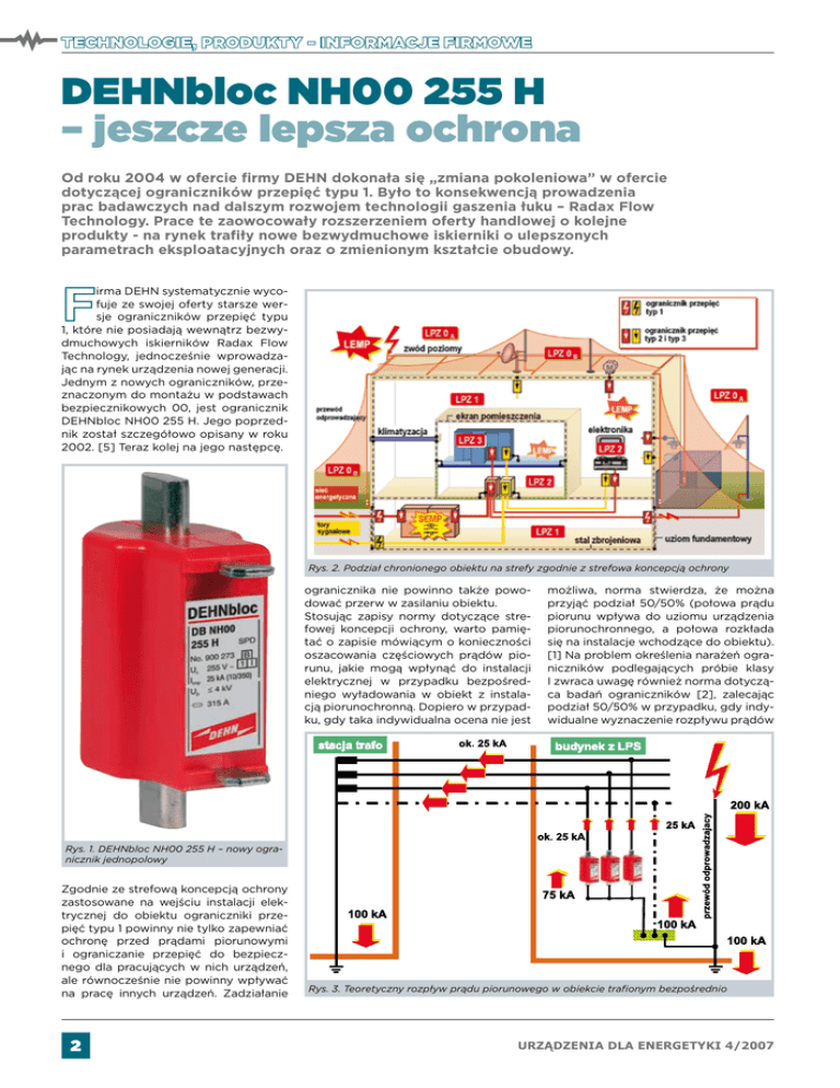 DEHNbloc NH00 255 H – jeszcze lepsza ochrona Od roku 2004 w ofercie firmy DEHN dokonała się „zmiana pokoleniowa” w ofercie dotyczącej ograniczników przepięć typu 1. Było to konsekwencją prowadzenia prac badawczych nad dalszym rozwojem technologii gaszenia łuku – Radax Flow Technology. Prace te zaowocowały rozszerzeniem oferty handlowej o kolejne produkty - na rynek trafiły nowe bezwydmuchowe iskierniki o ulepszonych parametrach eksploatacyjnych oraz o zmienionym kształcie obudowy. irma DEHN systematycznie wycofuje ze swojej oferty starsze wersje ograniczników przepięć typu 1, które nie posiadają wewnątrz bezwydmuchowych iskierników Radax Flow Technology, jednocześnie wprowadzając na rynek urządzenia nowej generacji. Jednym z nowych ograniczników, przeznaczonym do montażu w podstawach bezpiecznikowych 00, jest ogranicznik DEHNbloc NH00 255 H. Jego poprzednik został szczegółowo opisany w roku 2002. [5] Teraz kolej na jego następcę. Rys. 2. Podział chronionego obiektu na strefy zgodnie z strefowa koncepcją ochrony ogranicznika nie powinno także powodować przerw w zasilaniu obiektu. Stosując zapisy normy dotyczące strefowej koncepcji ochrony, warto pamiętać o zapisie mówiącym o konieczności oszacowania częściowych prądów piorunu, jakie mogą wpłynąć do instalacji elektrycznej w przypadku bezpośredniego wyładowania w obiekt z instalacją piorunochronną. Dopiero w przypadku, gdy taka indywidualna ocena nie jest możliwa, norma stwierdza, że można przyjąć podział 50/50% (połowa prądu piorunu wpływa do uziomu urządzenia piorunochronnego, a połowa rozkłada się na instalacje wchodzące do obiektu). [1] Na problem określenia narażeń ograniczników podlegających próbie klasy I zwraca uwagę również norma dotycząca badań ograniczników [2], zalecając podział 50/50% w przypadku, gdy indywidualne wyznaczenie rozpływu prądów Rys. 1. DEHNbloc NH00 255 H – nowy ogranicznik jednopolowy Zgodnie ze strefową koncepcją ochrony zastosowane na wejściu instalacji elektrycznej do obiektu ograniczniki przepięć typu 1 powinny nie tylko zapewniać ochronę przed prądami piorunowymi i ograniczanie przepięć do bezpiecznego dla pracujących w nich urządzeń, ale równocześnie nie powinny wpływać na pracę innych urządzeń. Zadziałanie Rys. 3. Teoretyczny rozpływ prądu piorunowego w obiekcie trafionym bezpośrednio urządzenia dla energetyki 4/2007 Tabela 1. Podstawowe parametry ogranicznika przepięć DB NH00 255 H. Największe napięcie trwałej pracy AC UC Prąd udarowy (10/350) Iimp Znamionowy prąd wyładowczy (8/20) In Napięciowy poziom ochrony UP Zdolność gaszenia prądu następczego AC Ifi Ograniczanie prądu następczego / Selektywność Czas zadziałania tA Maks. bezpiecznik do IK = 25 kAeff (ta ≤ 0,2 s) Maks. bezpiecznik do IK = 50 kAeff (ta ≤ 5 s) Maks. bezpiecznik przy IK > 50 kAeff Przepięcie dorywcze UT pioruna nie jest możliwe. Jest to o tyle ważne, że w przypadku układów odbiorczych połączonych równolegle przy Tabela 3. Dobór przekroju przewodów 255 V 25 kA 25 kA ≤ 4 kV 50 kAeff bezpiecznik 35 A gL/gG do 50 kAeff (prądu spodziewanego) nie zadziała ≤ 100 ns 315 A gL/gG 200 A gL/gG 125 A gL/gG 335 V / 5 sekund NH00 255H powinien zapewnić skuteczne wyrównanie potencjałów na wejściu instalacji elektrycznej do budynku. Oprócz prądów udarowych kolejnym ważnym parametrem jest wytrzymałość zwarciowa instalowanych ograniczników przepięć. Powinna być ona większa niż maksymalna spodziewana wartość prądu zwarciowego w miejscu przyłączenia ogranicznika do sieci (tj. prądu, jaki popłynąłby w obwodzie po zastąpieniu ogranicznika przewodem o pomijalnie małej impedancji). Do takich prądów należy również dobierać przekroje przewodów podłączeniowych. Bezpieczniki chroniące ograniczniki przepięć winny być dobrane według maksymalnych wartości znamionowych, jakie ustalił ich producent. W przypadku, gdy bezpiecznik F1 (stanowiący integralną część instalacji elektrycznej) ma wartość mniejszą lub równą wartości znamionowej wkładki F2 zalecanej przez producenta ogranicznika, stosowanie bezpieczników F2 nie jest konieczne. O wartości dobezpieczenia F2 decy- Rys. 4. Układ połączeń ograniczników przepięć typ 1 DB NH00 255 H w systemie sieci TN-C z dodatkowym bezpiecznikiem F2 włączonym w szereg z ogranicznikiem uwzględnieniu rezystancji układu uziemiającego przy transformatorze oraz rezystancji uziemień sąsiednich obiektów może okazać się, że do sieci wpłynie nie 50% prądu piorunowego, ale nawet 70% i więcej. [3] Wyniki badań terenowych potwierdzających ten fakt zaprezentowano podczas ostatniej konferencji ICLP w roku 2006. [4] Aby spełnić wymogi związane z zapewnieniem maksimum bezpieczeństwa dla obiektu z zewnętrznym urządzeniem piorunochronnym, prąd udarowy (10/350) dla pojedynczego ogranicznika wynosi IIMP = 25 kA. Przy wystąpieniu bezpośredniego trafienia w obiekt system ochronny złożony z trzech ograniczników typu DEHNbloc Tabela 2. Zasada doboru bezpieczników Ochrona przed prądem zwarciowym Rys. 5. Ograniczanie prądów następczych przez ogranicznik DEHNbloc NH00 255 H urządzenia dla energetyki 4/2007 duje również spodziewany prąd zwarcia w miejscu przyłączeni ogranicznika do sieci. Dane dotyczące zasad dobezpieczania oraz doboru przekrojów przewodów dla ogranicznika DB NH00 255 H zastawiono w tablicach 2 i 3. Aby uniknąć problemów, jakie mogą występować w układzie zasilania przy zadziałaniu typowych ograniczników iskiernikowych (duże prądy następcze), firma DEHN wprowadziła na rynek nowoczesne iskiernikowe ograniczniki przepięć wykorzystujące technologię gaszenia łuku – Radax-Flow Technology, dzięki której prądy następcze zostają ograniczone do wartości kilkuset A. Jeżeli przyjrzymy się bliżej oznaczeniu katalogowemu ogranicznika DEHNbloc NH00 255 H, możemy dostrzec,