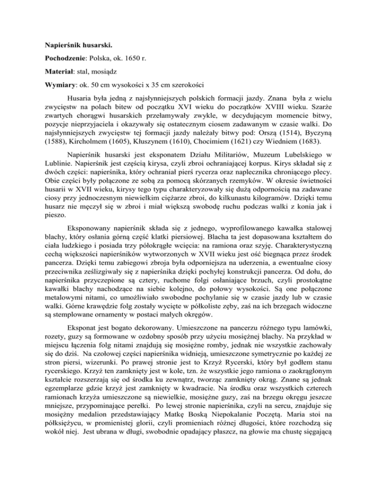 Napierśnik husarski. Pochodzenie: Polska, ok. 1650 r. Materiał: stal, mosiądz Wymiary: ok. 50 cm wysokości x 35 cm szerokości Husaria była jedną z najsłynniejszych polskich formacji jazdy. Znana była z wielu zwycięstw na polach bitew od początku XVI wieku do początków XVIII wieku. Szarże zwartych chorągwi husarskich przełamywały zwykle, w decydującym momencie bitwy, pozycje nieprzyjaciela i okazywały się ostatecznym ciosem zadawanym w czasie walki. Do najsłynniejszych zwycięstw tej formacji jazdy należały bitwy pod: Orszą (1514), Byczyną (1588), Kircholmem (1605), Kłuszynem (1610), Chocimiem (1621) czy Wiedniem (1683). Napierśnik husarski jest eksponatem Działu Militariów, Muzeum Lubelskiego w Lublinie. Napierśnik jest częścią kirysa, czyli zbroi ochraniającej korpus. Kirys składał się z dwóch części: napierśnika, który ochraniał pierś rycerza oraz naplecznika chroniącego plecy. Obie części były połączone ze sobą za pomocą skórzanych rzemyków. W okresie świetności husarii w XVII wieku, kirysy tego typu charakteryzowały się dużą odpornością na zadawane ciosy przy jednoczesnym niewielkim ciężarze zbroi, do kilkunastu kilogramów. Dzięki temu husarz nie męczył się w zbroi i miał większą swobodę ruchu podczas walki z konia jak i pieszo. Eksponowany napierśnik składa się z jednego, wyprofilowanego kawałka stalowej blachy, który osłania górną część klatki piersiowej. Blacha ta jest dopasowana kształtem do ciała ludzkiego i posiada trzy półokrągłe wcięcia: na ramiona oraz szyję. Charakterystyczną cechą większości napierśników wytworzonych w XVII wieku jest ość biegnąca przez środek pancerza. Dzięki temu zabiegowi zbroja była odporniejsza na uderzenia, a ewentualne ciosy przeciwnika ześlizgiwały się z napierśnika dzięki pochyłej konstrukcji pancerza. Od dołu, do napierśnika przyczepione są cztery, ruchome folgi osłaniające brzuch, czyli prostokątne kawałki blachy nachodzące na siebie kolejno, do połowy wysokości. Są one połączone metalowymi nitami, co umożliwiało swobodne pochylanie się w czasie jazdy lub w czasie walki. Górne krawędzie folg zostały wycięte w półkoliste zęby, zaś na ich brzegach widoczne są stemplowane ornamenty w postaci małych okręgów. Eksponat jest bogato dekorowany. Umieszczone na pancerzu różnego typu lamówki, rozety, guzy są formowane w ozdobny sposób przy użyciu mosiężnej blachy. Na przykład w miejscu łączenia folg nitami znajdują się mosiężne romby, jednak nie wszystkie zachowały się do dziś. Na czołowej części napierśnika widnieją, umieszczone symetrycznie po każdej ze stron piersi, wizerunki. Po prawej stronie jest to Krzyż Rycerski, który był godłem stanu rycerskiego. Krzyż ten zamknięty jest w kole, tzn. że wszystkie jego ramiona o zaokrąglonym kształcie rozszerzają się od środka ku zewnątrz, tworząc zamknięty okrąg. Znane są jednak egzemplarze gdzie krzyż jest zamknięty w kwadracie. Na środku oraz wszystkich czterech ramionach krzyża umieszczone są niewielkie, mosiężne guzy, zaś na brzegu okręgu jeszcze mniejsze, przypominające perełki. Po lewej stronie napierśnika, czyli na sercu, znajduje się mosiężny medalion przedstawiający Matkę Boską Niepokalanie Poczętą. Maria stoi na półksiężycu, w promienistej glorii, czyli promieniach różnej długości, które rozchodzą się wokół niej. Jest ubrana w długi, swobodnie opadający płaszcz, na głowie ma chustę sięgającą ramion, zaś ręce złożone w geście modlitwy. Jej wizerunek, tak jak krzyż, również jest wpisany w mosiężny okrąg. Napierśnik jest fragmentem zbroi husarskiej, na którą składał się dodatkowo naplecznik, tworzący z napierśnikiem tzw. kirys, a ponadto szyszak (czyli hełm), obojczyk (osłaniający górną część ramion, szyi oraz piersi), naramienniki, karwasze (ochraniające przedramiona), a w wyjątkowych przypadkach także nabiodrki z nakolankami.