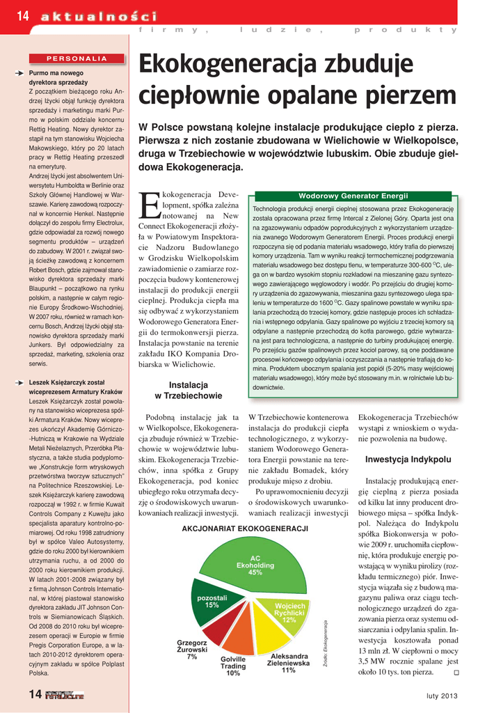 14 f PERSONALIA Purmo ma nowego dyrektora sprzedaøy Z poczπtkiem bieøπcego roku Andrzej Iøycki objπ≥ funkcjÍ dyrektora sprzedaøy i marketingu marki Purmo w polskim oddziale koncernu Rettig Heating. Nowy dyrektor zastπpi≥ na tym stanowisku Wojciecha Makowskiego, ktÛry po 20 latach pracy w Rettig Heating przeszed≥ na emeryturÍ. Andrzej Iøycki jest absolwentem Uniwersytetu Humboldta w Berlinie oraz Szko≥y G≥Ûwnej Handlowej w Warszawie. KarierÍ zawodowπ rozpoczyna≥ w koncernie Henkel. NastÍpnie do≥πczy≥ do zespo≥u firmy Electrolux, gdzie odpowiada≥ za rozwÛj nowego segmentu produktÛw ñ urzπdzeÒ do zabudowy. W 2001 r. zwiπza≥ swojπ úcieøkÍ zawodowπ z koncernem Robert Bosch, gdzie zajmowa≥ stanowisko dyrektora sprzedaøy marki Blaupunkt ñ poczπtkowo na rynku polskim, a nastÍpnie w ca≥ym regionie Europy årodkowo-Wschodniej. W 2007 roku, rÛwnieø w ramach koncernu Bosch, Andrzej Iøycki objπ≥ stanowisko dyrektora sprzedaøy marki Junkers. By≥ odpowiedzialny za sprzedaø, marketing, szkolenia oraz serwis. Leszek KsiÍøarczyk zosta≥ wiceprezesem Armatury KrakÛw Leszek KsiÍøarczyk zosta≥ powo≥any na stanowisko wiceprezesa spÛ≥ki Armatura KrakÛw. Nowy wiceprezes ukoÒczy≥ AkademiÍ GÛrniczo-Hutniczπ w Krakowie na Wydziale Metali Nieøelaznych, PrzerÛbka Plastyczna, a takøe studia podyplomowe ÑKonstrukcje form wtryskowych przetwÛrstwa tworzyw sztucznychî na Politechnice Rzeszowskiej. Leszek KsiÍøarczyk karierÍ zawodowπ rozpoczπ≥ w 1992 r. w firmie Kuwait Controls Company z Kuwejtu jako specjalista aparatury kontrolno-pomiarowej. Od roku 1998 zatrudniony by≥ w spÛ≥ce Valeo Autosystemy, gdzie do roku 2000 by≥ kierownikiem utrzymania ruchu, a od 2000 do 2000 roku kierownikiem produkcji. W latach 2001-2008 zwiπzany by≥ z firmπ Johnson Controls International, w ktÛrej piastowa≥ stanowisko dyrektora zak≥adu JIT Johnson Controls w Siemianowicach ålπskich. Od 2008 do 2010 roku by≥ wiceprezesem operacji w Europie w firmie Pregis Corporation Europe, a w latach 2010-2012 dyrektorem operacyjnym zak≥adu w spÛ≥ce Polplast Polska. 14 i r m y , l u d z i e , p r o d u k t y Ekokogeneracja zbuduje ciepłownie opalane pierzem W Polsce powstanπ kolejne instalacje produkujπce ciep≥o z pierza. Pierwsza z nich zostanie zbudowana w Wielichowie w Wielkopolsce, druga w Trzebiechowie w wojewÛdztwie lubuskim. Obie zbuduje gie≥dowa Ekokogeneracja. E kokogeneracja Development, spÛ≥ka zaleøna notowanej na New Connect Ekokogeneracji z≥oøy≥a w Powiatowym Inspektoracie Nadzoru Budowlanego w Grodzisku Wielkopolskim zawiadomienie o zamiarze rozpoczÍcia budowy kontenerowej instalacji do produkcji energii cieplnej. Produkcja ciep≥a ma siÍ odbywaÊ z wykorzystaniem Wodorowego Generatora Energii do termokonwersji pierza. Instalacja powstanie na terenie zak≥adu IKO Kompania Drobiarska w Wielichowie. Instalacja w Trzebiechowie Podobnπ instalacjÍ jak ta w Wielkopolsce, Ekokogeneracja zbuduje rÛwnieø w Trzebiechowie w wojewÛdztwie lubuskim. Ekokogeneracja TrzebiechÛw, inna spÛ≥ka z Grupy Ekokogeneracja, pod koniec ubieg≥ego roku otrzyma≥a decyzjÍ o úrodowiskowych uwarunkowaniach realizacji inwestycji. Wodorowy Generator Energii Technologia produkcji energii cieplnej stosowana przez EkokogeneracjÍ zosta≥a opracowana przez firmÍ Intercal z Zielonej GÛry. Oparta jest ona na zgazowywaniu odpadÛw poprodukcyjnych z wykorzystaniem urzπdzenia zwanego Wodorowym Generatorem Energii. Proces produkcji energii rozpoczyna siÍ od podania materia≥u wsadowego, ktÛry trafia do pierwszej komory urzπdzenia. Tam w wyniku reakcji termochemicznej podgrzewania materia≥u wsadowego bez dostÍpu tlenu, w temperaturze 300-600 OC, ulega on w bardzo wysokim stopniu rozk≥adowi na mieszaninÍ gazu syntezowego zawierajπcego wÍglowodory i wodÛr. Po przejúciu do drugiej komory urzπdzenia do zgazowywania, mieszanina gazu syntezowego ulega spaleniu w temperaturze do 1600 OC. Gazy spalinowe powsta≥e w wyniku spalania przechodzπ do trzeciej komory, gdzie nastÍpuje proces ich sch≥adzania i wstÍpnego odpylania. Gazy spalinowe po wyjúciu z trzeciej komory sπ odpylane a nastÍpnie przechodzπ do kot≥a parowego, gdzie wytwarzana jest para technologiczna, a nastÍpnie do turbiny produkujπcej energiÍ. Po przejúciu gazÛw spalinowych przez kocio≥ parowy, sπ one poddawane procesowi koÒcowego odpylania i oczyszczania a nastÍpnie trafiajπ do komina. Produktem ubocznym spalania jest popiÛ≥ (5-20% masy wejúciowej materia≥u wsadowego), ktÛry moøe byÊ stosowany m.in. w rolnictwie lub budownictwie. W Trzebiechowie kontenerowa instalacja do produkcji ciep≥a technologicznego, z wykorzystaniem Wodorowego Generatora Energii powstanie na terenie zak≥adu Bomadek, ktÛry produkuje miÍso z drobiu. Po uprawomocnieniu decyzji o úrodowiskowych uwarunkowaniach realizacji inwestycji AKCJONARIAT EKOKOGENERACJI Ekokogeneracja TrzebiechÛw wystπpi z wnioskiem o wydanie pozwolenia na budowÍ. Inwestycja Indykpolu InstalacjÍ produkujπcπ energiÍ cieplnπ z pierza posiada od kilku lat inny producent drobiowego miÍsa ñ spÛ≥ka Indykpol. Naleøπca do Indykpolu spÛ≥ka Biokonwersja w po≥owie 2009 r. uruchomi≥a ciep≥owniÍ, ktÛra produkuje energiÍ powstajπcπ w wyniku pirolizy (rozk≥adu termicznego) piÛr. Inwestycja wiπza≥a siÍ z budowπ magazynu paliwa oraz ciπgu technologicznego urzπdzeÒ do zgazowania pierza oraz systemu odsiarczania i odpylania spalin. Inwestycja kosztowa≥a ponad 13 mln z≥. W ciep≥owni o mocy 3,5 MW rocznie spalane jest oko≥o 10 tys. ton pierza. luty 2013