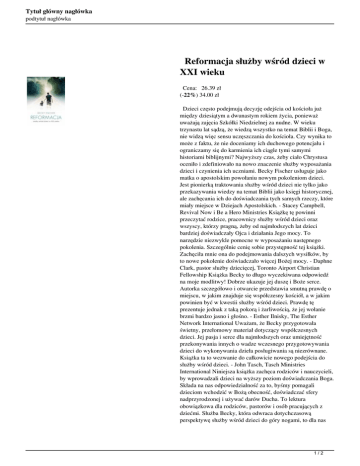 Tytuł główny nagłówka podtytuł nagłówka Reformacja służby wśród dzieci w XXI wieku Cena: 26.39 zł (-22%) 34.00 zł Dzieci często podejmują decyzję odejścia od kościoła już między dziesiątym a dwunastym rokiem życia, ponieważ uważają zajęcia Szkółki Niedzielnej za nudne. W wieku trzynastu lat sądzą, że wiedzą wszystko na temat Biblii i Boga, nie widzą więc sensu uczęszczania do kościoła. Czy wynika to może z faktu, że nie doceniamy ich duchowego potencjału i ograniczamy się do karmienia ich ciągle tymi samymi historiami biblijnymi? Najwyższy czas, żeby ciało Chrystusa oceniło i zdefiniowało na nowo znaczenie służby wyposażania dzieci i czynienia ich uczniami. Becky Fischer usługuje jako matka o apostolskim powołaniu nowym pokoleniom dzieci. Jest pionierką traktowania służby wśród dzieci nie tylko jako przekazywania wiedzy na temat Biblii jako księgi historycznej, ale zachęcania ich do doświadczania tych samych rzeczy, które miały miejsce w Dziejach Apostolskich. - Stacey Campbell, Revival Now i Be a Hero Ministries Książkę tę powinni przeczytać rodzice, pracownicy służby wśród dzieci oraz wszyscy, którzy pragną, żeby od najmłodszych lat dzieci bardziej doświadczały Ojca i działania Jego mocy. To narzędzie niezwykle pomocne w wyposażaniu następnego pokolenia. Szczególnie cenię sobie przystępność tej książki. Zachęciła mnie ona do podejmowania dalszych wysiłków, by to nowe pokolenie doświadczało więcej Bożej mocy. - Daphne Clark, pastor służby dziecięcej, Toronto Airport Christian Fellowship Książka Becky to długo wyczekiwana odpowiedź na moje modlitwy! Dobrze ukazuje jej duszę i Boże serce. Autorka szczegółowo i otwarcie przedstawia smutną prawdę o miejscu, w jakim znajduje się współczesny kościół, a w jakim powinien być w kwestii służby wśród dzieci. Prawdę tę prezentuje jednak z taką pokorą i żarliwością, że jej wołanie brzmi bardzo jasno i głośno. - Esther Ilnisky, The Esther Network International Uważam, że Becky przygotowała świetny, przełomowy materiał dotyczący współczesnych dzieci. Jej pasja i serce dla najmłodszych oraz umiejętność przekonywania innych o wadze wczesnego przygotowywania dzieci do wykonywania dzieła posługiwania są niezrównane. Książka ta to wezwanie do całkowicie nowego podejścia do służby wśród dzieci. - John Tasch, Tasch Ministries International Niniejsza książka zachęca rodziców i nauczycieli, by wprowadzali dzieci na wyższy poziom doświadczania Boga. Składa na nas odpowiedzialność za to, byśmy pomagali dzieciom wchodzić w Bożą obecność, doświadczać sfery nadprzyrodzonej i używać darów Ducha. To lektura obowiązkowa dla rodziców, pastorów i osób pracujących z dziećmi. Służba Becky, która odwraca dotychczasową perspektywę służby wśród dzieci do góry nogami, to dla nas 1/2 Tytuł główny nagłówka podtytuł nagłówka nowe wyzwanie. - Connie McKenzie, dyrektor Children’s Ministry Christ for the Nations 2/2 Powered by TCPDF (www.tcpdf.org)