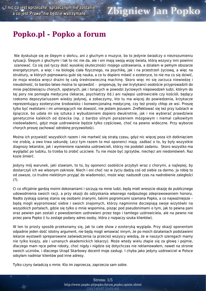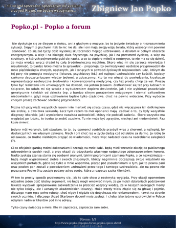 Popko.pl - Popko a forum Nie dyskutuje się ze ślepym o słońcu, ani z głuchym o muzyce, bo to jedynie świadczy o niezrozumieniu sytuacji. Ślepym z głuchymi i tak to nic nie da, ale i oni mają swoją wizję świata, którą wszyscy inni powinni szanować. Co się zaś tyczy dość wysokiej skuteczności mojego uzdrawiania, a działam w pełnym obszarze energetycznym, a więc i na biologię ciała fizycznego, na psychikę, jak i na przestrzeń życiową, a więc na struktury, w których pojmowaniu gubi się nauka, a co tu dopiero mówić o ezoteryce, to nie ma co się dziwić, że moja wiedza wręcz drażni tę całą średniowieczną machinę. Skoro więc mi się zarzuca niewiedzę i nieudolność, to bardzo łatwo można to sprawdzić - proponuję, by owi krytykanci osobiście przyprowadzili do mnie pięćdziesięciu chorych, opętanych, jak i tonących w powodzi życiowych niepowodzeń ludzi, którym do tej pory nie pomogła medycyna (lekarze, psychiatrzy itd.) ani najlepsi uzdrowiciele czy kościół, będący rzekomo depozytariuszem wiedzy jedynej, a zobaczymy, kto tu ma więcej do powiedzenia, krzykacze reprezentujący ezoteryczne środowisko i konwencjonalną medycynę, czy też prosty chłop ze wsi. Proszę tylko być realistami i mi umierających nie dowozić, nie jestem Jezusem. Zreflektować się też przy ludziach w śpiączce, bo udała mi się sztuka z wybudzeniem dopiero dwukrotnie, jak i nie wybierać prawdziwie genetycznie kalekich od dziecka (np. z bardzo silnym porażeniem mózgowym i niemal całkowitym niedowładem), gdyż moje uzdrowienie będzie tylko częściowe, choć na pewno widoczne. Przy wyborze chorych proszę zachować odrobinę przyzwoitości. Można ich przywieźć wszystkich razem i nie martwić się stratą czasu, gdyż nic więcej poza ich dotknięciem nie zrobię, a owo trwa sekundę. Lecz tym razem to moi oponenci mają zadbać o to, by były wszystkie diagnozy lekarskie, jak i wymienione nazwiska uzdrowicieli, którzy nie podołali zadaniu. Skoro wszystko ma wyglądać po ludzku, to trzeba to zrobić uczciwie. Tu nie może być zgrzytów, niechęci ani niedomówień. Raz kozie śmierć. Jedyny mój warunek, jaki stawiam, to to, by oponenci osobiście przybyli wraz z chorymi, a najlepiej, by dostarczyli ich we własnym zakresie. Niech i oni choć raz w życiu dadzą coś od siebie za darmo. Ja robię to od zawsze, co trudno niektórym przyjąć do wiadomości, może więc nadszedł czas na nadrobienie zaległości (?). Ci co oficjalnie gardzą moimi dokonaniami i szczują na mnie ludzi, będą mieli wreszcie okazję do publicznego udowodnienia swoich racji, a przy okazji do odzyskania własnego nadpsutego zdeprawowaniem honoru. Nadto zyskają szansę stania się osobami znanymi, takimi pogromcami szamana Popko, a co najważniejsze – będą mogli wypromować siebie i swoich znajomych, którzy nagminnie doczepiają swoje wizytówki na wszystkich portalach, gdzie się tylko o mnie wspomina, pisząc pod pseudonimami o tym, jak to pewna pani oraz pewien pan zostali z powodzeniem uzdrowieni przez tego i tamtego uzdrowiciela, ale na pewno nie przez pana Popko (i tu zostaje podany adres osoby, która z rozpaczy szuka klientów). W ten to prosty sposób przekonamy się, jak to całe show z ezoteryką wygląda. Przy okazji oponentom odpadnie jeden dość istotny argument, nie będą mogli wmawiać innym, że po moich działaniach podstawieni lekarze wystawili spreparowane zaświadczenia (a przecież wszyscy wiedzą, że w naszych szeregach mamy nie tylko księży, ale i uznanych akademickich lekarzy). Może wtedy wielu złapie się za głowę i pojmie, dlaczego mam ręce pełne roboty, choć nigdy i nigdzie się dotychczas nie reklamowałem, nawet na stronie swoich uczniów, i dlaczego Urząd Skarbowy docenił moje zasługi. I chyba jako jedyny uzdrowiciel w Polsce odsyłam nadmiar klientów pod inne adresy. Tylko czyny świadczą o mnie. Kto im zaprzecza, zaprzecza sam sobie. Strona: 1/5 http://www.popko.pl/popko,forum,popko,opinie.xhtml [2017-03-07 11:01:44] Dziwię się, że jeszcze istnieje ktoś taki jak Rozbicki, kto uważa się za jedynego człowieka mającego dostęp do prawdy, (choć posiada wyłącznie informacje sprzedane przez system), a więc za człowieka powołanego do tego, by tych, co prawdę widzą nieco inaczej, pogardliwie oceniać i zmuszać do udowadniania, że to, co robią, jest autentyczne. Nagle pojawia się ktoś, kto nic nie wie o wielu sprawach, ale rości sobie jednocześnie prawo do egzaminowania innych z doświadczeń zdobytych w obszarach wiedzy mu niedostępnych. Istny cyrk. Po co w ogóle jest pisać z takimi ludźmi? To nic nie da. No chyba żeby i im nakazać dostarczenie nagrań potwierdzających ich własne, rzekomo czyste uczucia do ludzi, nienaganną opinię w pracy, zaświadczenie z policji, że nie gwałcą i nie gwałcili, ze szkoły, że nie są tumanami, etc. A jak coś takiego przyniosą, to wystarczy rzucić hasło, że nagranie zostało spreparowane. Tak to się bawić można w nieskończoność, a nie tylko wtedy, gdy jedna ze stron stoi w sztucznym deszczu. Poza tym jak mocno trzeba nienawidzić drugiego człowieka, by pod pretekstem publicznej dezaprobaty zmuszać go esesmańskimi metodami do potwierdzania tego, że to co mówi i robi, jest prawdą? Czy to jaki Sąd Wiekuisty? Kaczyński za tym z Rozbickim stoi? Tego nawet Bóg nie czyni, a skoro tak, to mamy tu do czynienia z ludźmi, co się ponad Boga wynoszą. Niezła jazda… I pomyśleć, że tak „kurtuazyjnie” zachowują się ci, co własną twarz ukrywają w ciemności Internetu. Czując się bezkarnie, krytykują innych do woli, od rana do wieczora zatracając się w tym procederze. Nie ma tu śladów pokory i braterstwa, nie ma skruchy i chęci niesienia pomocy, jest tylko paskudne gardzenie tym, czego samemu się nie posiada. Obrzydliwe… Drwią z duchowości, choć nigdy poza analizę własnych myśli nie wyszli, nawet nie wiedzą czym