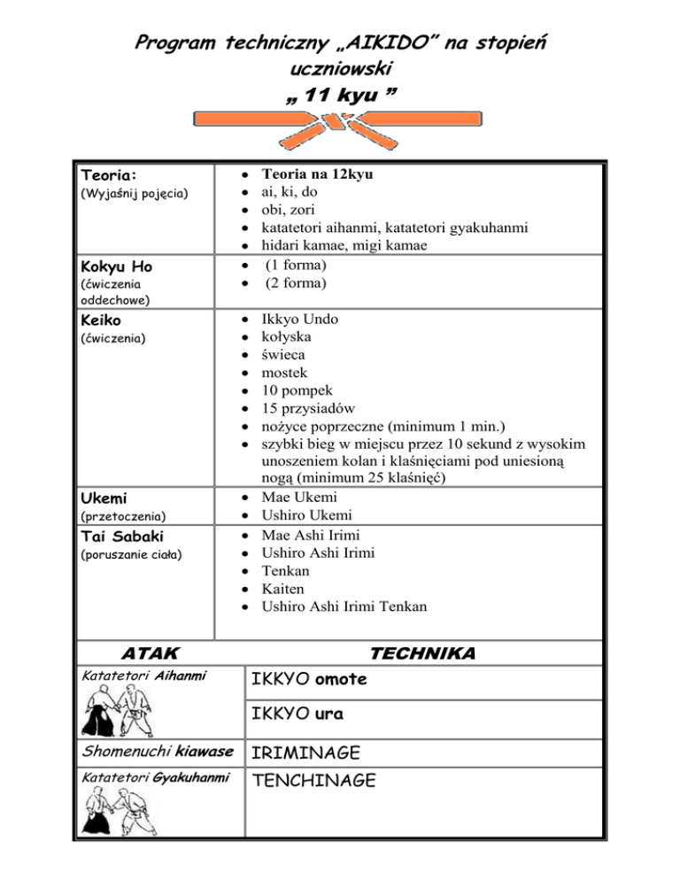 Program techniczny „AIKIDO” na stopień uczniowski „ 11 kyu ” Teoria: (Wyjaśnij pojęcia) Kokyu Ho (ćwiczenia oddechowe) Keiko (ćwiczenia) Ukemi (przetoczenia) Tai Sabaki (poruszanie ciała) Teoria na 12kyu ai, ki, do obi, zori katatetori aihanmi, katatetori gyakuhanmi hidari kamae, migi kamae (1 forma) (2 forma) Ikkyo Undo kołyska świeca mostek 10 pompek 15 przysiadów nożyce poprzeczne (minimum 1 min.) szybki bieg w miejscu przez 10 sekund z wysokim unoszeniem kolan i klaśnięciami pod uniesioną nogą (minimum 25 klaśnięć) Mae Ukemi Ushiro Ukemi Mae Ashi Irimi Ushiro Ashi Irimi Tenkan Kaiten Ushiro Ashi Irimi Tenkan ATAK Katatetori Aihanmi TECHNIKA IKKYO omote IKKYO ura Shomenuchi kiawase IRIMINAGE Katatetori Gyakuhanmi TENCHINAGE AIKIDO jest japońską sztuką walki. Twórcą i założycielem jest O’sensei Morihei Ueshiba. Ai – harmonia Ki – siła, energia Do - droga Słowniczek młodego aikidoki !!! Obi - pas, Zori - japońskie klapki na nogi Hidari kamae – lewa pozycja obronna Migi kamae– prawa pozycja obronna katatetori aihanmi – uchwyt prawej ręki za prawą rękę partnera katatetori gyakuhanmi - uchwyt prawej ręki za lewą rękę partnera Iriminage – rzut do przodu UKEMI – przetoczenia Ushiro Ukemi Mae Ukemi