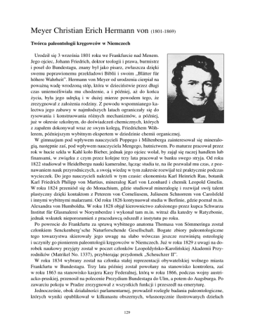 Meyer Christian Erich Hermann von (1801−1869) Twórca paleontologii kręgowców w Niemczech Urodził się 3 września 1801 roku we Frankfurcie nad Menem. Jego ojciec, Johann Friedrich, doktor teologii i prawa, burmistrz i poseł do Bundestagu, znany był jako pisarz, zwłaszcza dzięki swemu poprawionemu przekładowi Biblii i swoim „Blätter für höhere Wahrheit”. Hermann von Meyer od urodzenia cierpiał na poważną wadę wrodzoną stóp, która w dzieciństwie przez długi czas uniemożliwiała mu chodzenie, a i później, aż do końca życia, była jego udręką i w dużej mierze powodem tego, że zrezygnował z założenia rodziny. Z powodu wspomnianego ka− lectwa jego zabawy w najmłodszych latach ograniczały się do rysowania i konstruowania różnych mechanizmów, a później, już w okresie szkolnym, do doświadczeń chemicznych, których z zapałem dokonywał wraz ze swym kolegą, Friedrichem Wöh− lerem, późniejszym wybitnym ekspertem w dziedzinie chemii organicznej. W gimnazjum pod wpływem nauczycieli Poppego i Miltenberga zainteresował się mineralo− gią, następnie zaś, pod wpływem nauczyciela Mengego, hutnictwem. Po maturze pracował przez rok w hucie szkła w Kahl koło Bieber, jednak jego ojciec wolał, by zajął się raczej handlem lub finansami, w związku z czym przez kolejne trzy lata pracował w banku swego stryja. Od roku 1822 studiował w Heidelbergu nauki kameralne, łącząc studia te, na ile pozwalał mu czas, z poz− nawaniem nauk przyrodniczych, a swoją wiedzę w tym zakresie rozwijał też praktycznie podczas wycieczek. Do jego nauczycieli należeli w tym czasie: ekonomista Karl Heinrich Rau, botanik Karl Friedrich Philipp von Martius, mineralog Karl von Leonhard i chemik Leopold Gmelin. W roku 1824 przeniósł się do Monachium, gdzie studiował mineralogię i rozwijał swój talent plastyczny dzięki kontaktom z Peterem von Corneliusem, Juliusem Schnorrem von Carolsfeld i innymi wybitnymi malarzami. Od roku 1826 kontynuował studia w Berlinie, gdzie poznał m.in. Alexandra von Humboldta. W roku 1828 objął kierownictwo założonego przez kupca Schwarza Institut für Glasmalerei w Norymberdze i wykonał tam m.in. witraż dla katedry w Ratyzbonie, jednak wskutek nieporozumień z pracodawcą odszedł z instytutu po roku. Po powrocie do Frankfurtu za sprawą wybitnego anatoma Thomasa von Sömmeringa został członkiem Senckenberg’sche Naturforschende Gesellschaft. Bogate zbiory paleontologiczne tego towarzystwa skierowały jego uwagę na słabo wówczas jeszcze rozwiniętą osteologię i uczyniły go pionierem paleontologii kręgowców w Niemczech. Już w roku 1829 z uwagi na do− robek naukowy przyjęty został w poczet członków Leopoldyńsko−Karolińskiej Akademii Przy− rodników (Matrikel No. 1337), przybierając przydomek „Scheuchzer II”. W roku 1834 wybrany został na członka stałej reprezentacji obywatelskiej wolnego miasta Frankfurtu w Bundestagu. Trzy lata później został powołany na stanowisko kontrolera, zaś w roku 1863 na stanowisko kasjera Kasy Federalnej, którą w roku 1866, podczas wojny austri− acko−pruskiej, przenosił na polecenie Prezydium Bundestagu do Ulm, a potem do Augsburga. Po zawarciu pokoju w Pradze zrezygnował z wszystkich funkcji i przeszedł na emeryturę. Jednocześnie, obok działalności parlamentarnej, prowadził rozległe badania paleontologiczne, których wyniki opublikował w kilkunastu obszernych, własnoręcznie ilustrowanych dziełach 129 i w kilkuset artykułach. Zajmował się m.in. szkarłupniami, labiryntodontami Wirtembergii, sko− rupiakami, rybami i płazami karbonu Nadrenii i Westfalii, z gadów kopalnych opracowywał notozaury, gady ryjogłowe, parasuchusy, dinozaury, plakodonty, żółwie i trzeciorzędowe krokodyle, wprowadzając w roku 1830 pierwszy zarys ich systematyki, wyparty później przez systematykę Owena. Duże znaczenie miały jego badania kopalnych ssaków, które rozpoczął opracowaniem koniowatego rodzaju Hipparion z Eppelsheim oraz Cervus alces i Dinotherium bavaricum. Opisał też pierwsze znalezisko związane z archeopteryksem – pojedyncze pióro znalezione w Solnhofen. W swoim głównym dziele „Zur Fauna der Vorwelt” przedstawił ssaki, ptaki i gady z trzeciorzędowych margli z Oeningen, gady wapienia muszlowego, permskich łupków miedzionośnych i jurajskich łupków litograficznych z Bawarii. Za tom poświęcony gadom wapienia muszlowego otrzymał medal Holenderskiego Towarzystwa Naukowego i nagrodę Londyńskiego Towarzystwa Geologicznego. Wraz z wybitnym paleontologiem i malakozoologiem, Wilhelmem Dunkerem, założył uka− zujące się do dziś czasopismo „Palaeontographica. Beitrag zur Naturgeschichte der Vorwelt”, które redagował do 17 tomu włącznie. W latach 1848−49 wydał wraz z Heinrichem Georgem Bronnem i Heinrichem Robertem Goeppertem spis wszystkich znanych w połowie XIX wieku skamieniałości. Nie chcąc zrezygnować ze swej niezależności i nie chcąc czerpać korzyści z nauki, którą traktował raczej jako powołanie, niż profesję, nie przyjął proponowanej mu w roku 1860 przez Uniwersytet w Getyndze profesury geologii i paleontologii. Wiele podróżował, czę− ściowo zajmując się badaniami naukowymi, częściowo dla nawiązania osobistych kontaktów z najwybitniejszymi europejskimi uczonymi. Był członkiem ponad 30 towarzystw naukowych, w tym również członkiem rzeczywistym Śląskiego Towarzystwa Kultury Ojczystej. W uznaniu jego zasług dla nauki Fakultet Filozoficzny Uniwersytetu w Würzburgu nadał mu w roku 1845 godność doktora honoris causa, zaś w roku 1863 został adiunktem prezydium Leopoldyńsko− Karolińskiej Akademii Przyrodników. Zmarł 2 kwietnia 1869 roku we Frankfurcie nad Menem. Opracowanie gadów, ryb, szkarłupni i skorupiaków zebranych na Górnym Śląsku przez Ru− dolpha Mentzla uczyniło z niego pioniera badań górnośląskiego triasu. Jego nazwisko upamięt−
