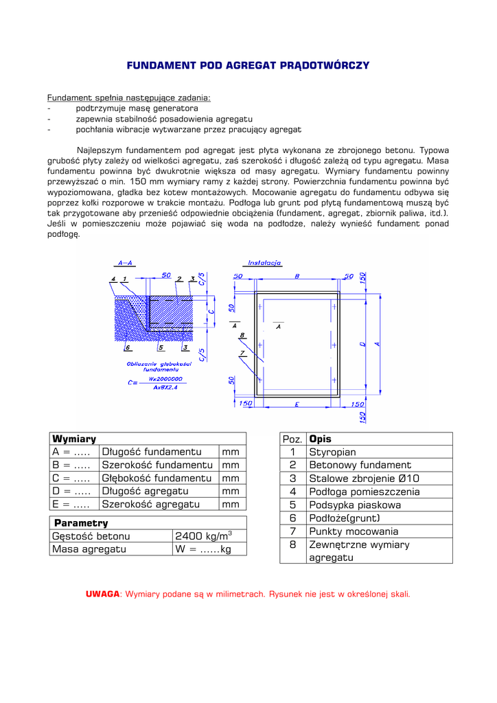 FUNDAMENT POD AGREGAT PRĄDOTWÓRCZY Fundament spełnia następujące zadania: podtrzymuje masę generatora zapewnia stabilność posadowienia agregatu pochłania wibracje wytwarzane przez pracujący agregat Najlepszym fundamentem pod agregat jest płyta wykonana ze zbrojonego betonu. Typowa grubość płyty zależy od wielkości agregatu, zaś szerokość i długość zależą od typu agregatu. Masa fundamentu powinna być dwukrotnie większa od masy agregatu. Wymiary fundamentu powinny przewyższać o min. 150 mm wymiary ramy z każdej strony. Powierzchnia fundamentu powinna być wypoziomowana, gładka bez kotew montażowych. Mocowanie agregatu do fundamentu odbywa się poprzez kołki rozporowe w trakcie montażu. Podłoga lub grunt pod płytą fundamentową muszą być tak przygotowane aby przenieść odpowiednie obciążenia (fundament, agregat, zbiornik paliwa, itd.). Jeśli w pomieszczeniu może pojawiać się woda na podłodze, należy wynieść fundament ponad podłogę. Wymiary A = ….. B = ….. C = ….. D = ….. E = ….. Długość fundamentu Szerokość fundamentu Głębokość fundamentu Długość agregatu Szerokość agregatu Parametry Gęstość betonu Masa agregatu mm mm mm mm mm 2400 kg/m3 W = ……kg Poz. 1 2 3 4 5 6 7 8 Opis Styropian Betonowy fundament Stalowe zbrojenie Ø10 Podłoga pomieszczenia Podsypka piaskowa Podłoże(grunt) Punkty mocowania Zewnętrzne wymiary agregatu UWAGA: Wymiary podane są w milimetrach. Rysunek nie jest w określonej skali.
