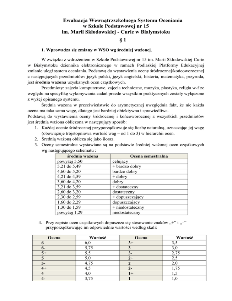 Ewaluacja Wewnątrzszkolnego Systemu Oceniania w Szkole Podstawowej nr 15 im. Marii Skłodowskiej - Curie w Białymstoku §1 1. Wprowadza się zmiany w WSO wg średniej ważonej. W związku z wdrożeniem w Szkole Podstawowej nr 15 im. Marii Skłodowskiej-Curie w Białymstoku dziennika elektronicznego w ramach Podlaskiej Platformy Edukacyjnej zmianie uległ system oceniania. Podstawą do wystawienia oceny śródrocznej/końcoworocznej z następujących przedmiotów: język polski, język angielski, historia, matematyka, przyroda, jest średnia ważona uzyskanych ocen cząstkowych. Przedmioty: zajęcia komputerowe, zajęcia techniczne, muzyka, plastyka, religia w-f ze względu na specyfikę wykonywania zadań przede wszystkim praktycznych zostały wyłączone z wyżej opisanego systemu. Średnia ważona w przeciwieństwie do arytmetycznej uwzględnia fakt, że nie każda ocena ma taka sama wagę, dlatego jest bardziej obiektywna i sprawiedliwa. Podstawą do wystawienia oceny śródrocznej i końcoworocznej z wszystkich przedmiotów jest średnia ważona obliczona w następujący sposób: 1. Każdej ocenie śródrocznej przyporządkowuje się liczbę naturalną, oznaczając jej wagę (obowiązuje trójstopniowa wartość wag – od 1 do 3) w hierarchii ocen. 2. Średnią ważoną oblicza się jako iloraz. 3. Oceny semestralne wystawiane są na podstawie średniej ważonej ocen cząstkowych wg następującego schematu : średnia ważona Ocena semestralna powyżej 5,50 celujący 5,21 do 5,49 + bardzo dobry 4,60 do 5,20 bardzo dobry 4,21 do 4,59 + dobry 3,60 do 4,20 dobry 3,21 do 3,59 + dostateczny 2,60 do 3,20 dostateczny 2,30 do 2,59 + dopuszczający 1,60 do 2,29 dopuszczający 1,30 do 1,59 + niedostateczny powyżej 1,29 niedostateczny 4. Przy zapisie ocen cząstkowych dopuszcza się stosowanie znaków „+” i „–” przyporządkowując im odpowiednie wartości według skali: Ocena 6 65+ 5 54+ 4 4- Wartość 6,0 5,75 5,5 5,0 4,75 4,5 4,0 3,75 Ocena 3+ 3 32+ 2 21+ 1 Wartość 3,5 3,0 2,75 2,5 2,0 1,75 1,5 1,0 5. Formy aktywności i ich waga: Formy aktywności Waga 3 2 1 praca klasowa sprawdzian poprawa sprawdzianu udział w konkursach wojewódzkich, międzyszkolnych, wewnątrzszkolnych kartkówka odpowiedź ustna test próbny praca twórcza dyktando recytacja praca na lekcji praca w grupach czytanie zadanie domowe zadania dodatkowe aktywność Kolor zapisu w dzienniku czerwony czarny niebieski Dzieci obcokrajowców i uczniów z opinią z PPP nauczyciel przede wszystkim ocenia biorąc pod uwagę postępy i wkład pracy dziecka oraz zalecenia PPP. 6. Na podstawie ocen uzyskanych przez ucznia w I półroczu nauczyciel wystawia ocenę śródroczną, która może być z „+” lub „-„. Wzór obliczania średniej ważonej: Oceny wagi 3: A1, A2, . . . ,A n Oceny wagi 2: B1, B2, . . . ,B m Oceny wagi 1: C1, C2, . . . ,C k Średnia ważona ocen = Przykład: Oceny wagi 3: oceny 3, 3+, 4Oceny wagi 2: oceny 5, 4, 4+, 1 Oceny wagi 1: oceny 3, 5 co daje ocenę: + dostateczny n – ilość ocen wagi 3 m – ilość ocen wagi 2 k – ilość ocen wagi 1 7. Jeżeli uczeń opuścił obowiązkową pracę klasową, sprawdzian, test, kartkówkę (nieobecność usprawiedliwiona), to powinien napisać ją w wyznaczonym przez nauczyciela terminie. Nieobecność odnotowana jest jako „0” w tej kategorii w dniu pisania pracy pisemnej. „0” nie jest oceną, jedynie informacją dla nauczyciela i rodzica o nieobecności ucznia na sprawdzianie. Po przystąpieniu ucznia do pisania zaległej pracy pisemnej w miejscu „0” nauczyciel wpisuje otrzymaną ocenę. Jeżeli uczeń unika pisania sprawdzianu w ustalonym z nauczycielem terminie, nauczyciel może zobowiązać go do napisania tej pracy (lub odpowiedzi ustnej) na kolejnych zajęciach z danego przedmiotu. 8. Uczeń może poprawić ocenę z prac pisemnych oraz z innych obszarów aktywności (według uznania nauczyciela) w wyznaczonym przez nauczyciela terminie. Ocena uzyskana w drugim terminie jest sumowana z oceną uzyskaną w pierwszym terminie, wówczas oblicza się średnią arytmetyczną 9. Ocena końcoworoczna jest obliczana jako średnia arytmetyczna ze średniej ważonej z I i II półrocza. Ostateczna decyzja w tej kwestii należy do nauczyciela. 2. Nauczyciele edukacji wczesnoszkolnej nie mają obowiązku prowadzenia dokumentacji w dzienniku elektronicznym. Wybór prowadzenia takiej dokumentacji należy do wychowawców klas 0-III. Ewaluację zatwierdzono podczas posiedzenia Rady Pedagogicznej dnia 13.09.2016 r. Zmiany wchodzą w życie z dniem 14.09.2016 r. opracował: Zespół do spraw ewaluacji Wewnątrzszkolnego Systemu Oceniania