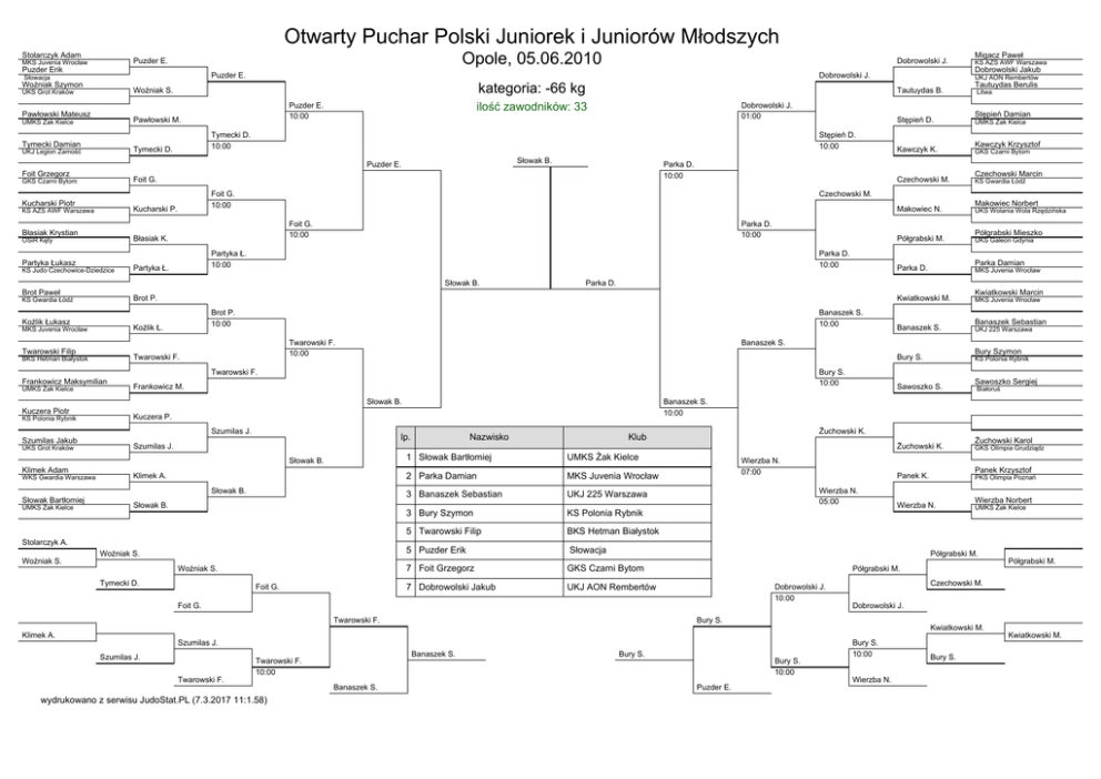 Otwarty Puchar Polski Juniorek i Juniorów Młodszych Stolarczyk Adam Opole, 05.06.2010 Puzder E. MKS Juvenia Wrocław Puzder Erik Dobrowolski J. Puzder E. Słowacja Woźniak Szymon kategoria: -66 kg Woźniak S. UKS Grot Kraków Pawłowski Mateusz Pawłowski M. UMKS Żak Kielce Tymecki Damian Tymecki D. 10:00 Tymecki D. UKJ Legion Zamość Słowak B. Parka D. 10:00 Foit G. GKS Czarni Bytom Kucharski Piotr Błasiak Krystian Partyka Łukasz KS Judo Czechowice-Dziedzice Makowiec N. Foit G. 10:00 Parka D. 10:00 Parka D. 10:00 Słowak B. Brot Paweł Półgrabski M. Partyka Ł. 10:00 Partyka Ł. Koźlik Łukasz Twarowski Filip Brot P. 10:00 Banaszek S. 10:00 Twarowski F. 10:00 Twarowski F. BKS Hetman Białystok UMKS Żak Kielce KS Polonia Rybnik Bury S. 10:00 Frankowicz M. UKS Grot Kraków lp. Szumilas J. Słowak B. Klimek Adam WKS Gwardia Warszawa Klimek A. Słowak B. Słowak Bartłomiej UMKS Żak Kielce Słowak B. Stolarczyk A. Woźniak S. Woźniak S. Woźniak S. Tymecki D. Foit G. Nazwisko 1 Słowak Bartłomiej UMKS Żak Kielce 2 Parka Damian MKS Juvenia Wrocław 3 Banaszek Sebastian UKJ 225 Warszawa 3 Bury Szymon KS Polonia Rybnik 5 Twarowski Filip BKS Hetman Białystok 5 Puzder Erik Słowacja 7 Foit Grzegorz GKS Czarni Bytom 7 Dobrowolski Jakub UKJ AON Rembertów Makowiec Norbert UKS Wolania Wola Rzędzińska Półgrabski Mieszko UKS Galeon Gdynia Kwiatkowski Marcin MKS Juvenia Wrocław Banaszek Sebastian UKJ 225 Warszawa Bury Szymon Banaszek S. KS Polonia Rybnik Sawoszko S. Wierzba N. 07:00 Sawoszko Sergiej Białoruś Wierzba N. 05:00 Żuchowski Karol GKS Olimpia Grudziądz Panek Krzysztof Panek K. PKS Olimpia Poznań Wierzba N. Wierzba Norbert UMKS Żak Kielce Półgrabski M. Dobrowolski J. 10:00 Bury S. Dobrowolski J. Kwiatkowski M. Bury S. 10:00 Puzder E. Półgrabski M. Czechowski M. Bury S. Banaszek S. Twarowski F. 10:00 wydrukowano z serwisu JudoStat.PL (7.3.2017 11:1.58) Banaszek S. Żuchowski K. Szumilas J. Twarowski F. KS Gwardia Łódź Półgrabski M. Twarowski F. Szumilas J. Czechowski Marcin Żuchowski K. Klub Foit G. Klimek A. GKS Czarni Bytom Banaszek S. 10:00 Kuczera P. Szumilas J. Szumilas Jakub Kawczyk Krzysztof MKS Juvenia Wrocław Bury S. Słowak B. Kuczera Piotr UMKS Żak Kielce Banaszek S. Twarowski F. Frankowicz Maksymilian Stępień Damian Parka D. Kwiatkowski M. Koźlik Ł. MKS Juvenia Wrocław Litwa Parka Damian Parka D. Brot P. KS Gwardia Łódź Tautuydas Berulis Czechowski M. Błasiak K. OSiR Kęty Kawczyk K. Czechowski M. Foit G. 10:00 Kucharski P. KS AZS AWF Warszawa Stępień D. Stępień D. 10:00 Puzder E. Foit Grzegorz Dobrowolski J. 01:00 KS AZS AWF Warszawa UKJ AON Rembertów Tautuydas B. ilość zawodników: 33 Puzder E. 10:00 Migacz Paweł Dobrowolski Jakub Dobrowolski J. Bury S. 10:00 Wierzba N. Bury S. Kwiatkowski M.
