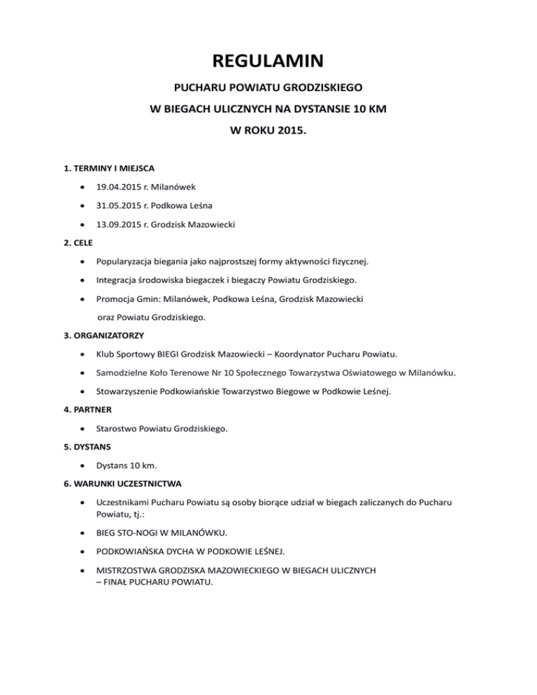 REGULAMIN PUCHARU POWIATU GRODZISKIEGO W BIEGACH ULICZNYCH NA DYSTANSIE 10 KM W ROKU 2015. 1. TERMINY I MIEJSCA 19.04.2015 r. Milanówek 31.05.2015 r. Podkowa Leśna 13.09.2015 r. Grodzisk Mazowiecki 2. CELE Popularyzacja biegania jako najprostszej formy aktywności fizycznej. Integracja środowiska biegaczek i biegaczy Powiatu Grodziskiego. Promocja Gmin: Milanówek, Podkowa Leśna, Grodzisk Mazowiecki oraz Powiatu Grodziskiego. 3. ORGANIZATORZY Klub Sportowy BIEGI Grodzisk Mazowiecki – Koordynator Pucharu Powiatu. Samodzielne Koło Terenowe Nr 10 Społecznego Towarzystwa Oświatowego w Milanówku. Stowarzyszenie Podkowiańskie Towarzystwo Biegowe w Podkowie Leśnej. 4. PARTNER Starostwo Powiatu Grodziskiego. 5. DYSTANS Dystans 10 km. 6. WARUNKI UCZESTNICTWA Uczestnikami Pucharu Powiatu są osoby biorące udział w biegach zaliczanych do Pucharu Powiatu, tj.: BIEG STO-NOGI W MILANÓWKU. PODKOWIAŃSKA DYCHA W PODKOWIE LEŚNEJ. MISTRZOSTWA GRODZISKA MAZOWIECKIEGO W BIEGACH ULICZNYCH – FINAŁ PUCHARU POWIATU. 7. KLASYFIKACJE I NAGRODY Aby zostać sklasyfikowanym należy wziąć udział w co najmniej dwóch biegach. Za udział w poszczególnych biegach osoba otrzyma punkty: za 1 miejsce - 500 punktów, za 2 miejsce - 499 punktów, za 3 miejsce – 498 punktów, itd. Puchar Powiatu wygra zawodniczka i zawodnik, którzy zdobędą największą ilość punktów. W przypadku równej ilości punktów, decyduje najlepszy czas osiągnięty przez osobę w jednym z biegów. Klasyfikacje – generalna i wiekowe: Mężczyźni: <19 lat, 20-29 lat, 30-39 lat, 40-49 lat, 50-59 lat, 60+ Kobiety: <19 lat, 20-29 lat, 30-39 lat, 40-49 lat, 50-59 lat, 60+ 3 najlepsze zawodniczki i 3. najlepszych zawodników klasyfikacji generalnej otrzymają Puchary Starosty Grodziskiego. Wszyscy uczestnicy Pucharu Powiatu otrzymają pamiątki. 8. POSTANOWIENIA KOŃCOWE Oficjalne wyniki Pucharu Powiatu zostaną zamieszczone na stronie internetowej Organizatora – Koordynatora: www.biegigrodzisk.pl Ostateczna interpretacja regulaminu należy do Organizatorów. Uczestnik Pucharu Powiatu wyraża zgodę na nieodpłatne wykorzystanie przez Koordynatora Pucharu Powiatu wizerunku utrwalonego w czasie biegu lub w związku z biegiem i zestawianie go z imieniem i nazwiskiem, wiekiem, klubem, płcią uczestnika we wszelkich przekazach telewizyjnych, radiowych, internetowych, w formie drukowanej oraz w ogłoszeniach, zapowiedziach i informacjach o zawodach i ich wynikach, a także w celu promocji Pucharu Powiatu. Uczestnik Pucharu Powiatu wyraża zgodę na przetwarzanie danych osobowych przez koordynatora Pucharu Powiatu dla potrzeb opracowania wyników końcowych, zgodnie z ustawą z dnia 29.08.1997 r. o Ochronie Danych Osobowych, tekst jednolity: Dz. U. z 2002 r., Nr 101, poz. 926 z późniejszymi zmianami.