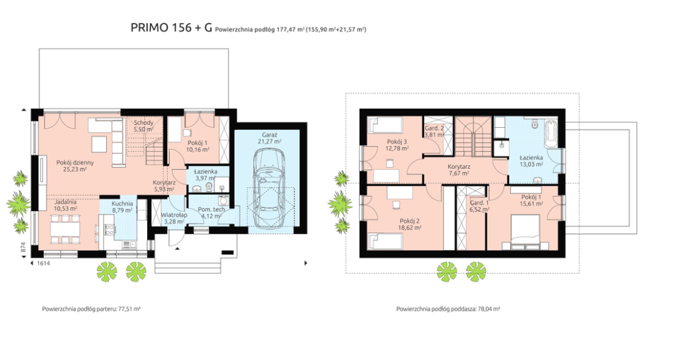 PRIMO 156 + G Powierzchnia podłóg 177,47 m (155,90 m +21,57 m ) 2 Schody 5,50 m2 Pokój 1 10,16 m2 Pokój dzienny 25,23 m2 Korytarz 5,93 m2 Kuchnia 8,79 m2 Wiatrołap 3,28 m2 2 Pokój 3 12,78 m2 Korytarz 7,67 m2 Łazienka 3,97 m2 Pom. tech 4,12 m2 Gard. 2 3,81 m2 Gard. 1 6,52 m2 Pokój 2 18,62 m2 874 Jadalnia 10,53 m2 Garaż 21,27 m2 2 1614 Powierzchnia podłóg parteru: 77,51 m² Powierzchnia podłóg poddasza: 78,04 m² Łazienka 13,03 m2 Pokój 1 15,61 m2